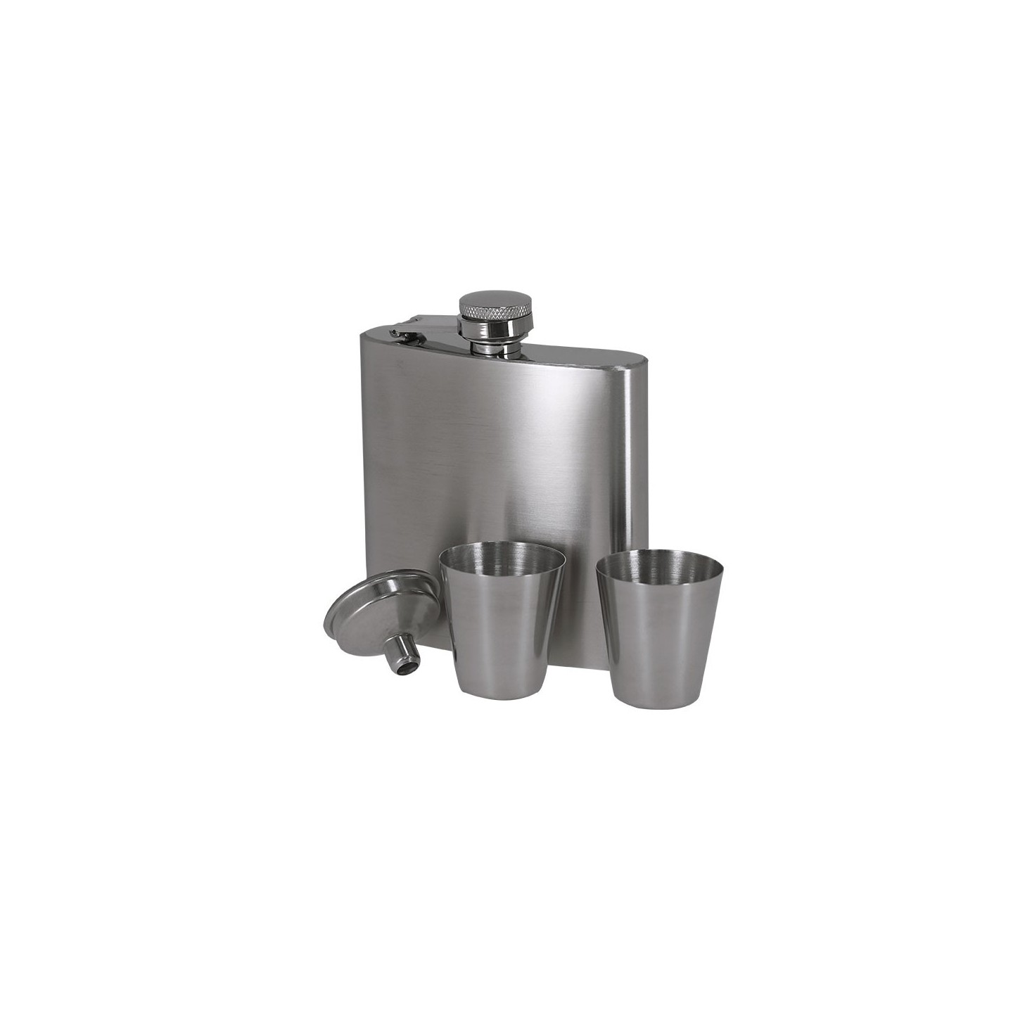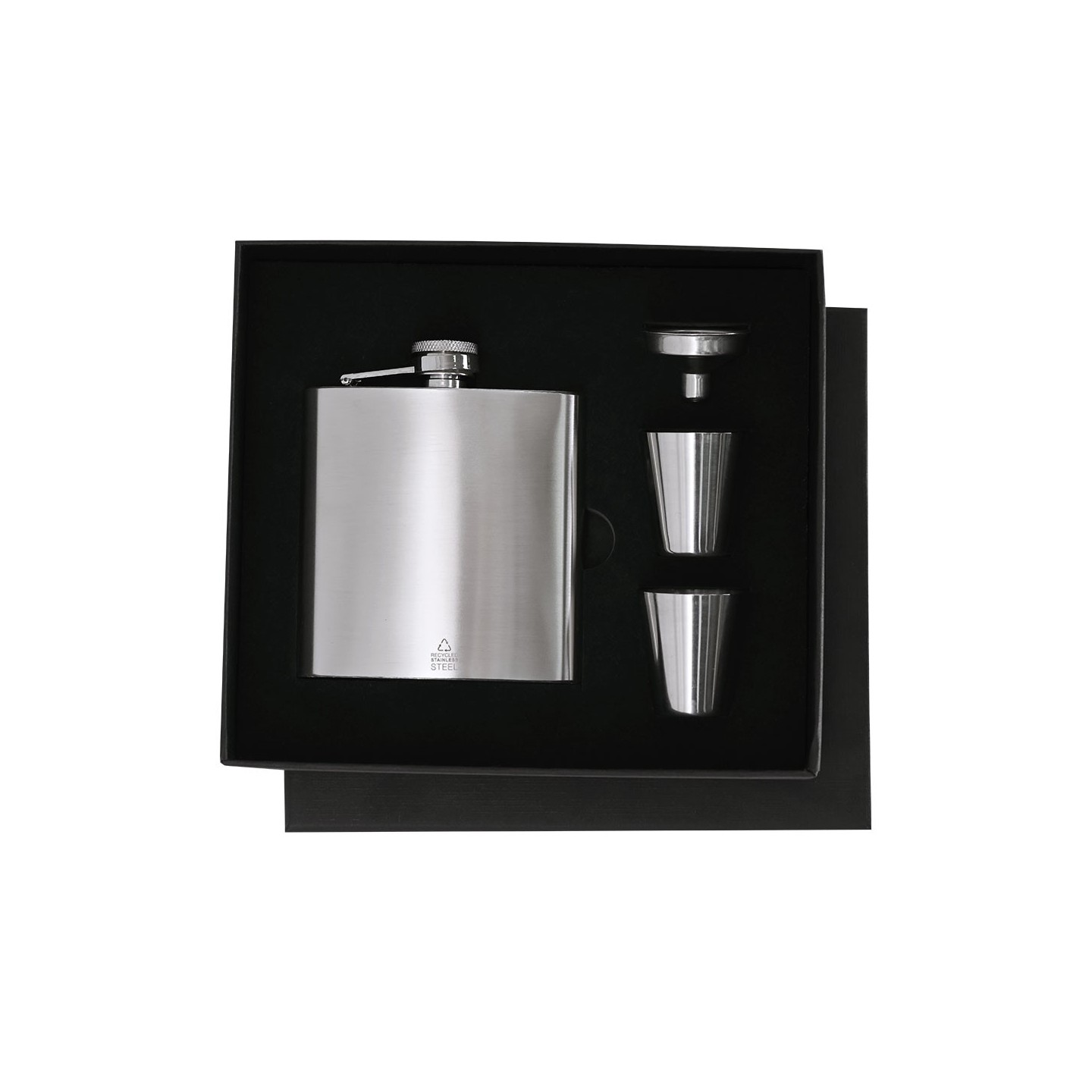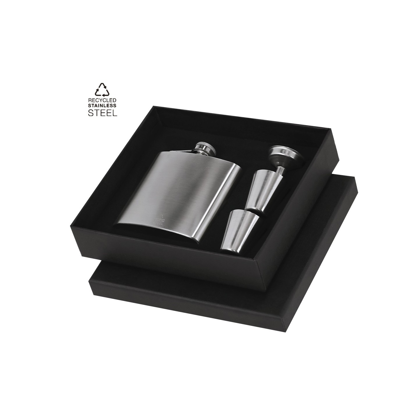 Set de Petaca ALMAZ en acero inoxidable reciclado, con petaca, vasos medidores y embudo. Personalizable con logotipo, ideal para empresas.
