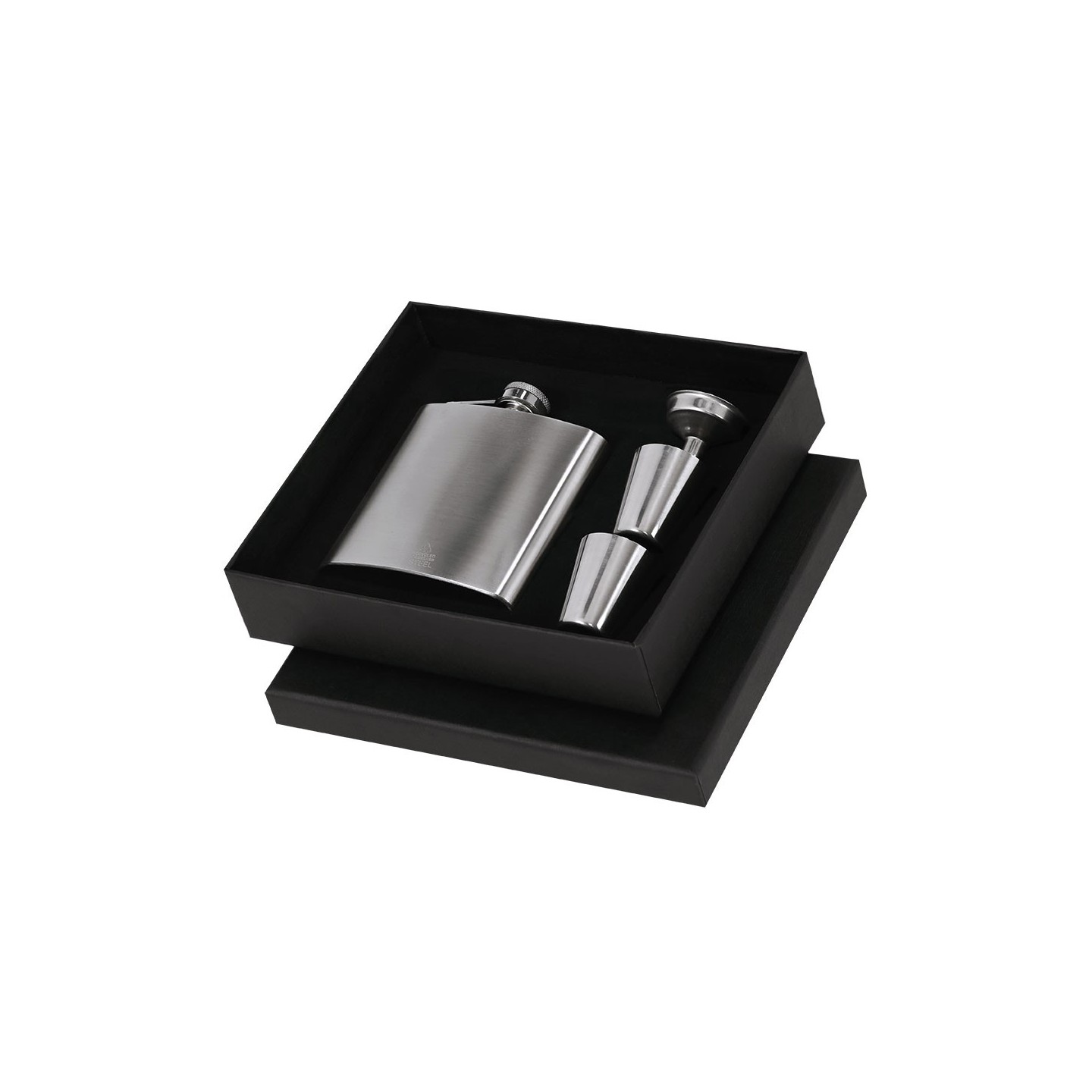El set incluye además dos vasos medidores de 30 ml de capacidad, ideales para tomar la cantidad exacta de bebida en cada ocasión. El embudo de dosificación facilita el llenado de la petaca, haciendo que este set sea aún más práctico y funcional. Todo el conjunto se presenta en una elegante caja negra, que no solo lo convierte en un regalo ideal, sino también en un detalle sofisticado para ocasiones especiales.