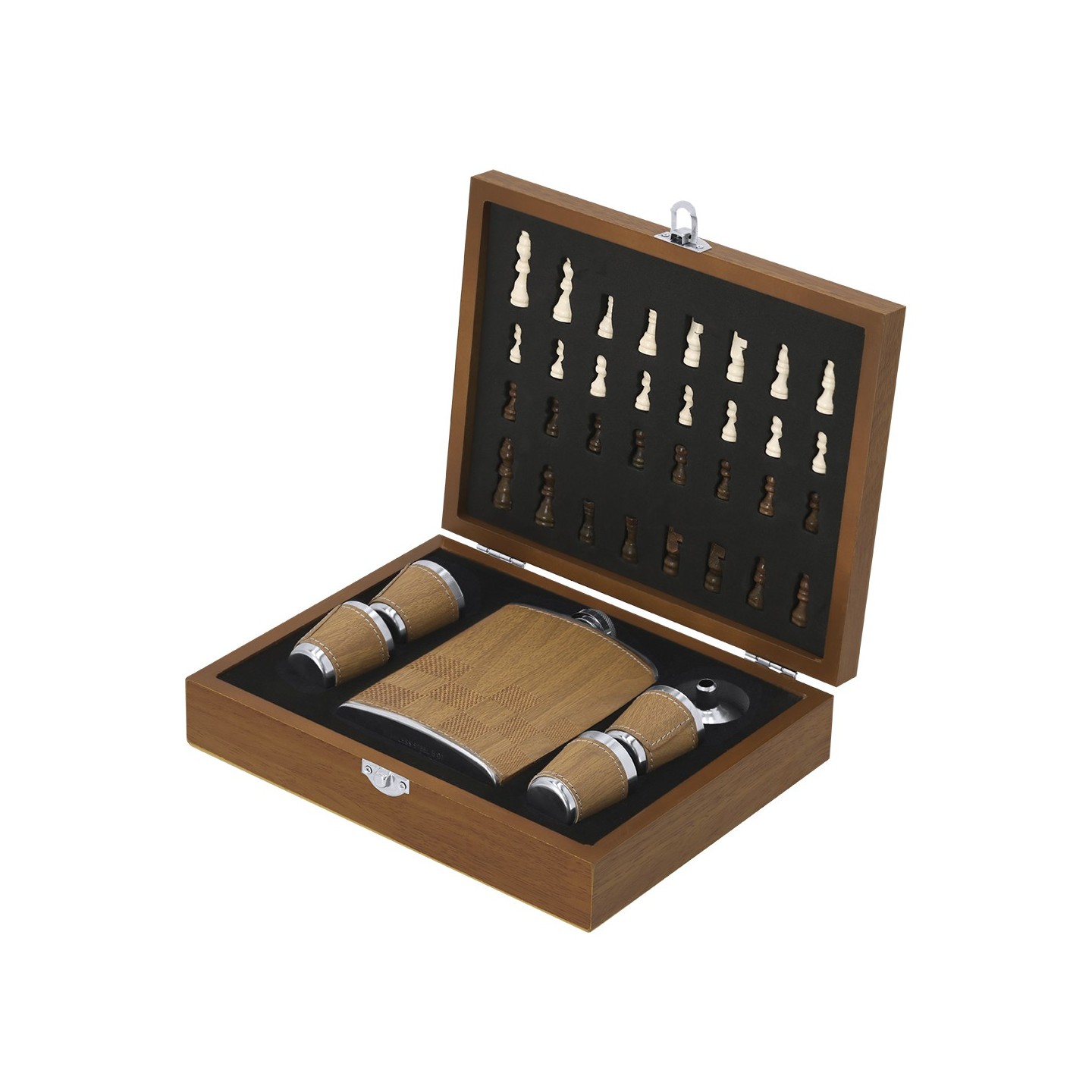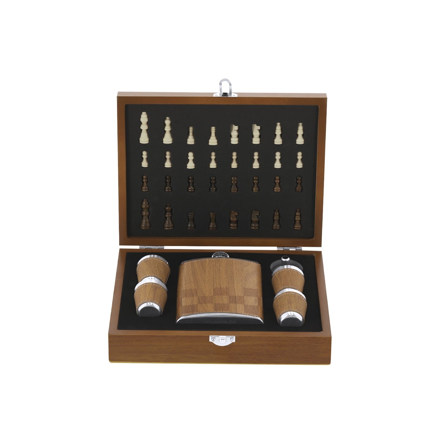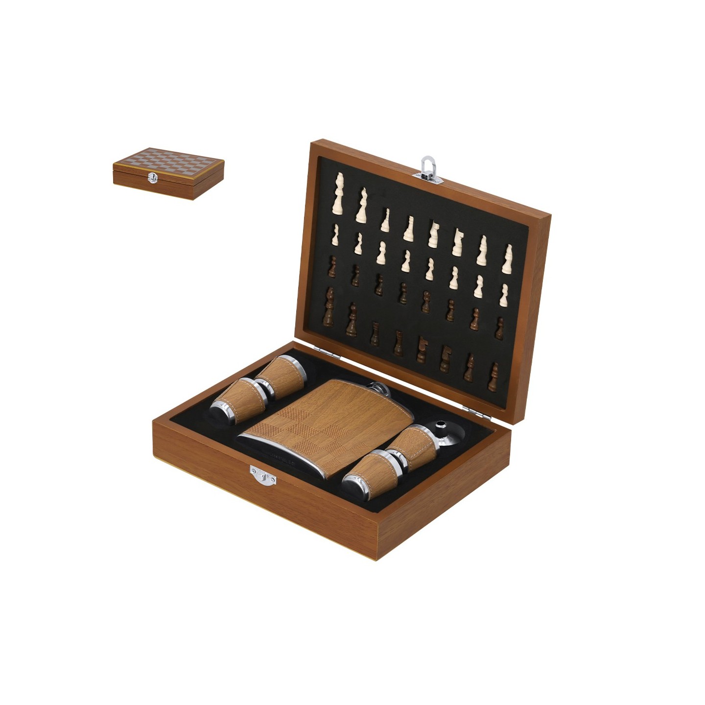 Set Petaca FLEET con acabado en madera, diseño de ajedrez, petaca de 220 ml, cuatro vasos, embudo y juego de ajedrez. Personalizable con logotipo, elegante y único.