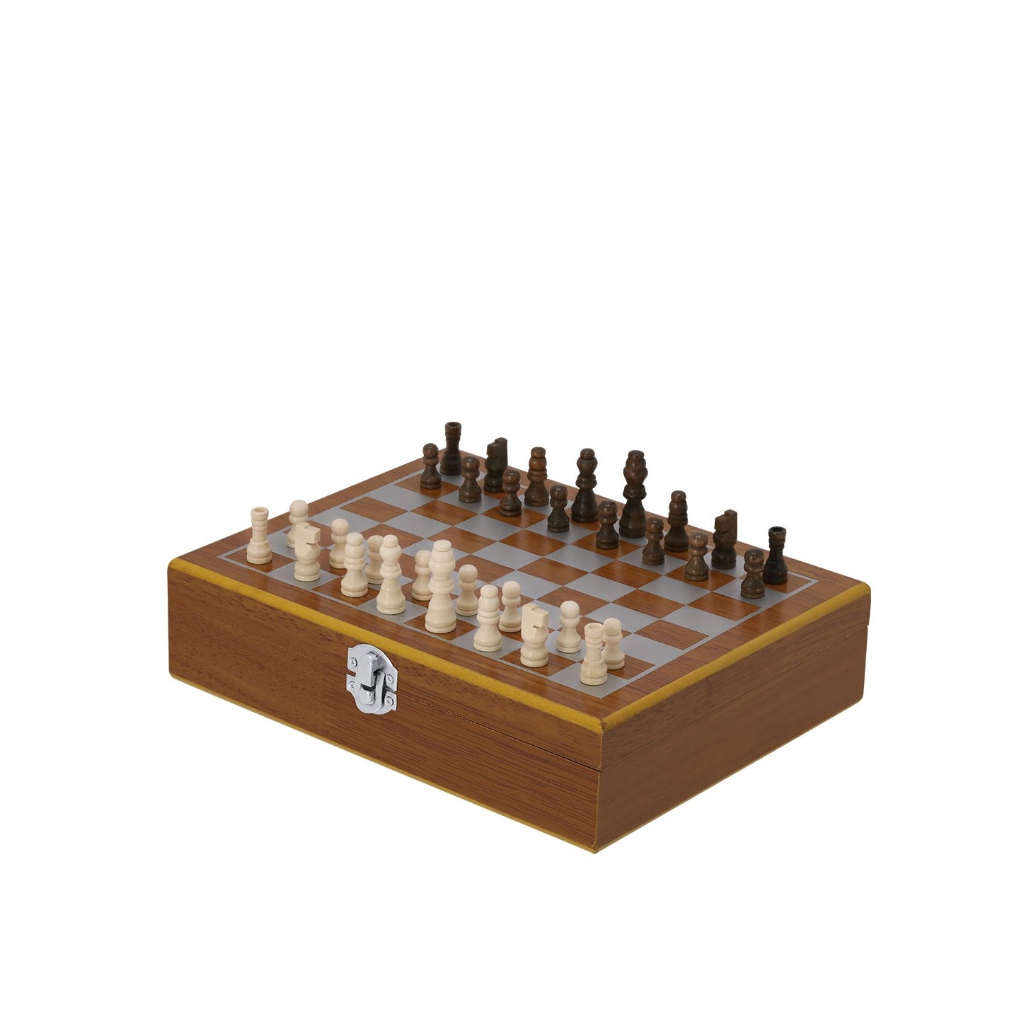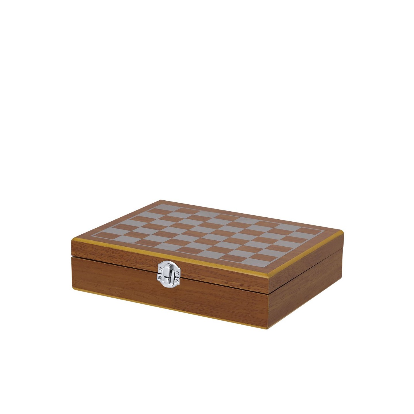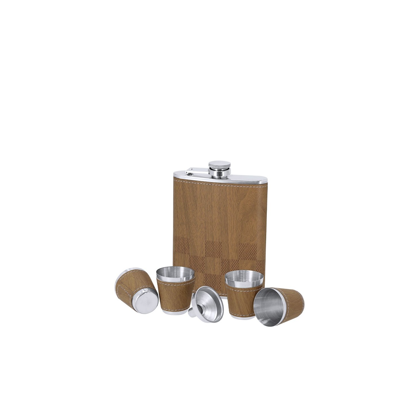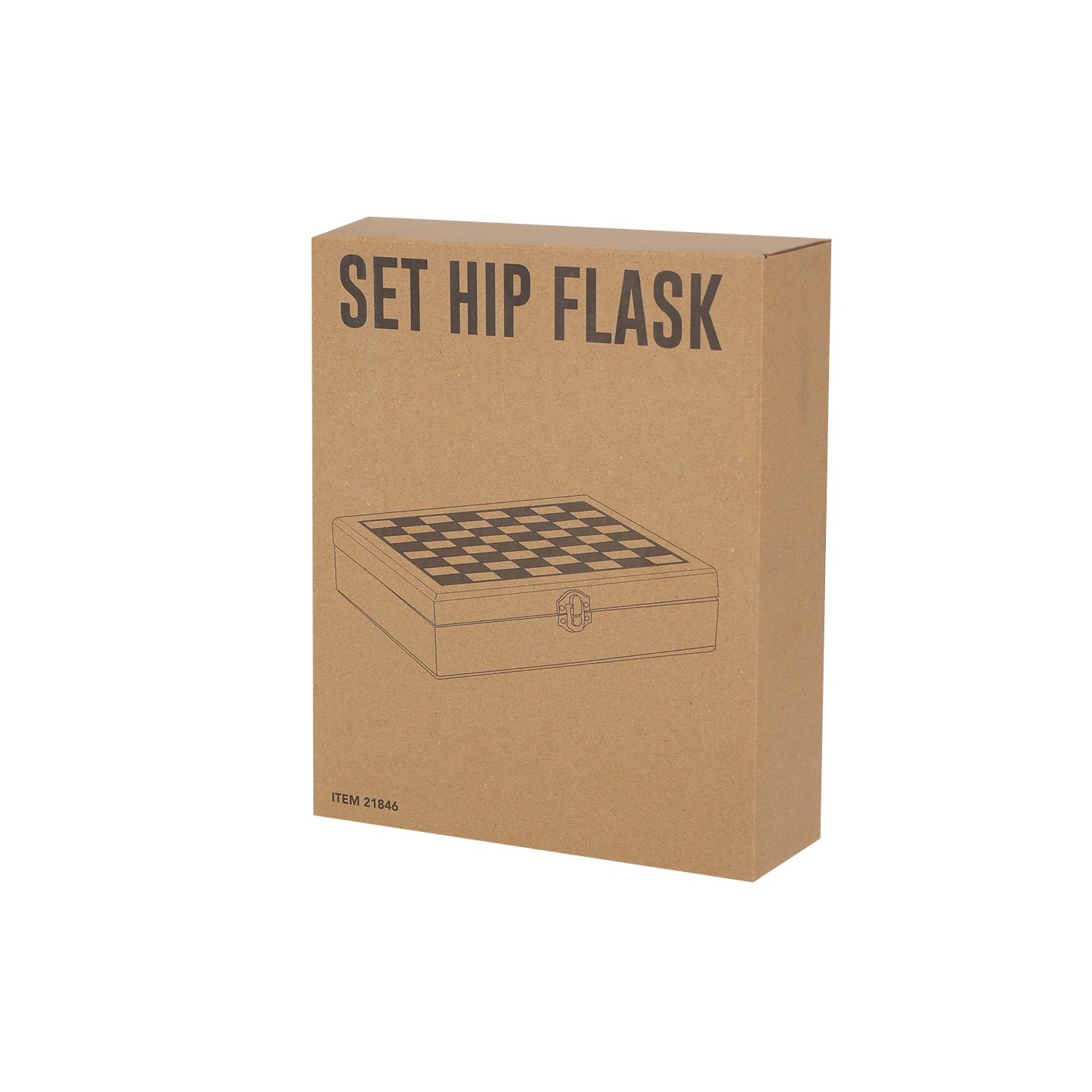 Set Petaca FLEET con acabado en madera, diseño de ajedrez, petaca de 220 ml, cuatro vasos, embudo y juego de ajedrez. Personalizable con logotipo, elegante y único.