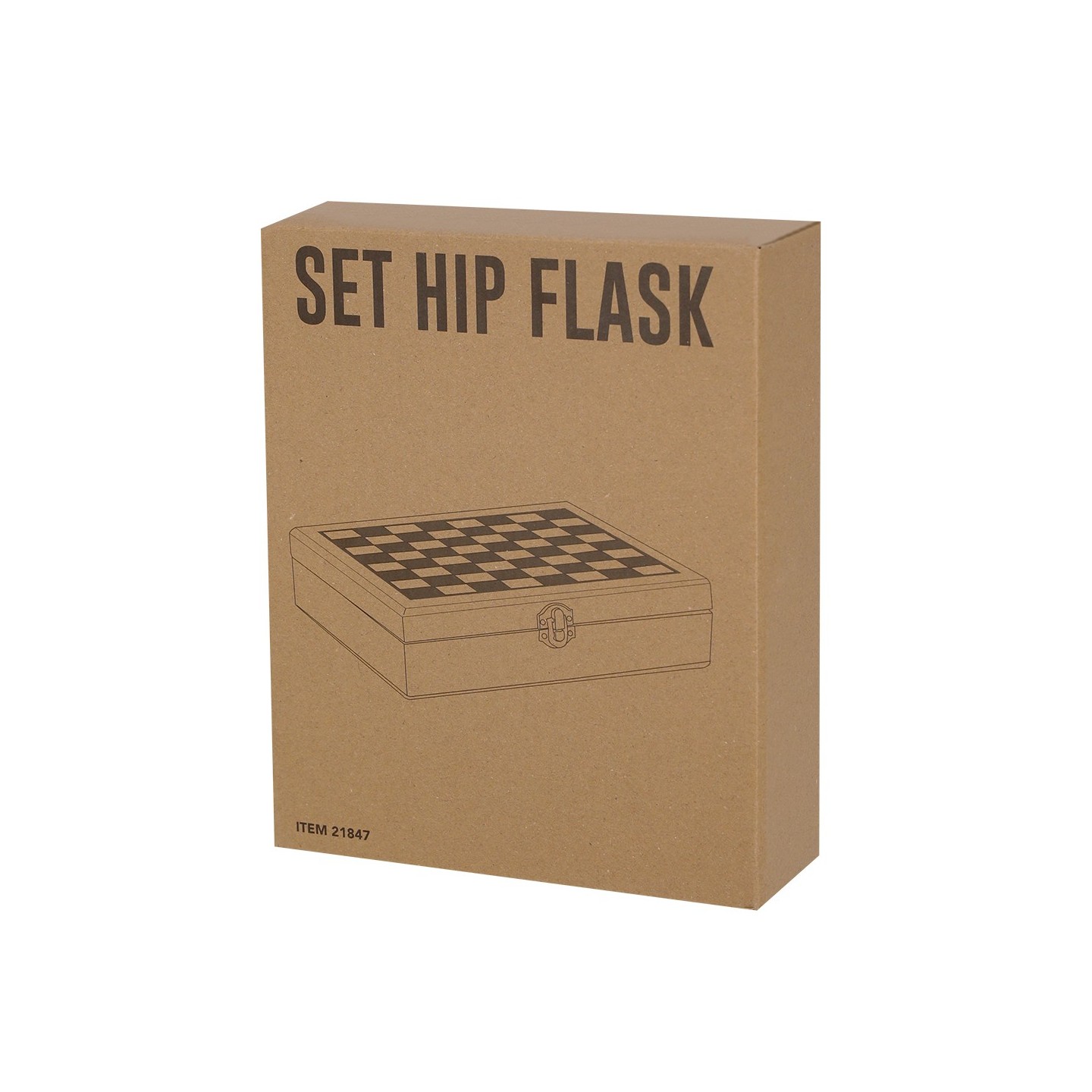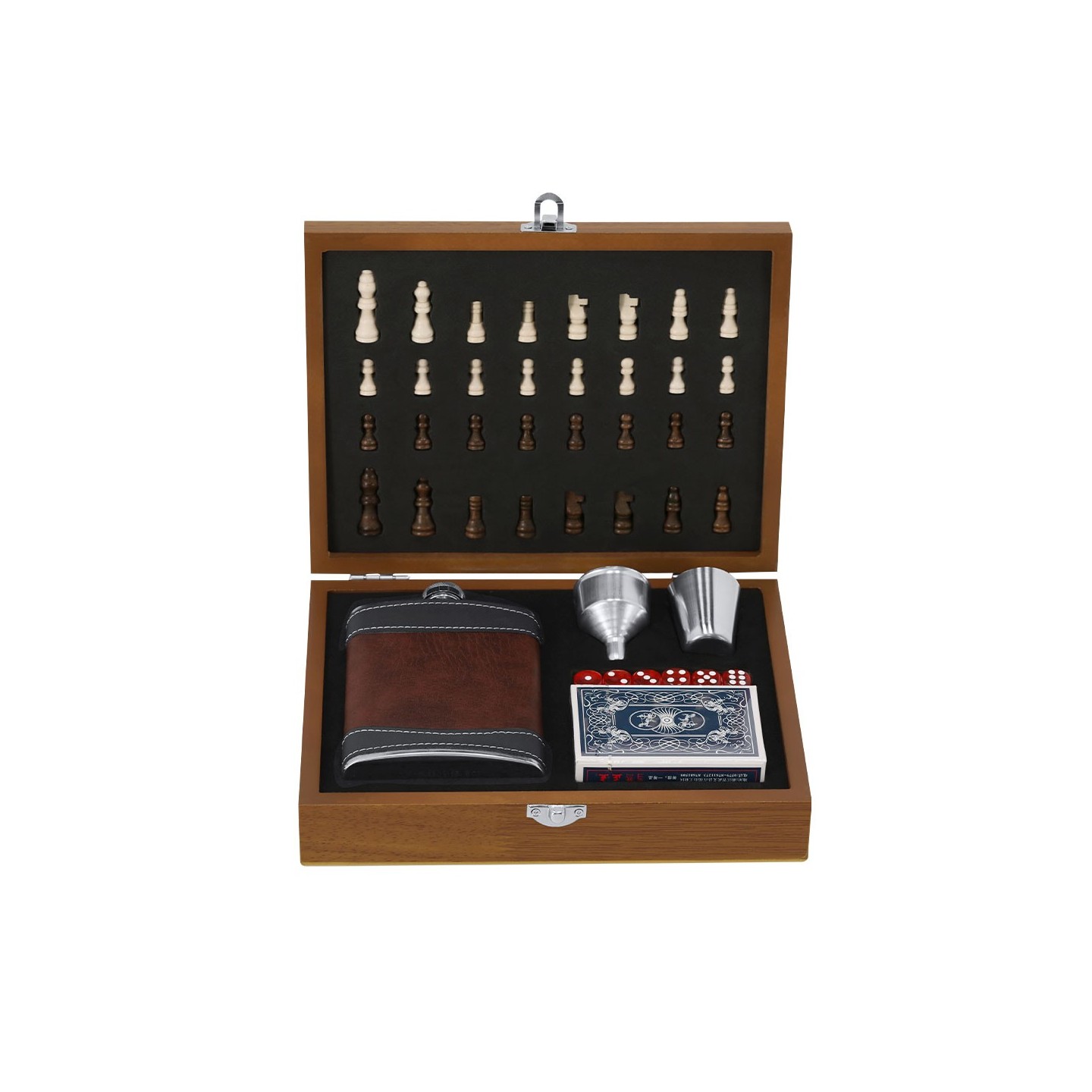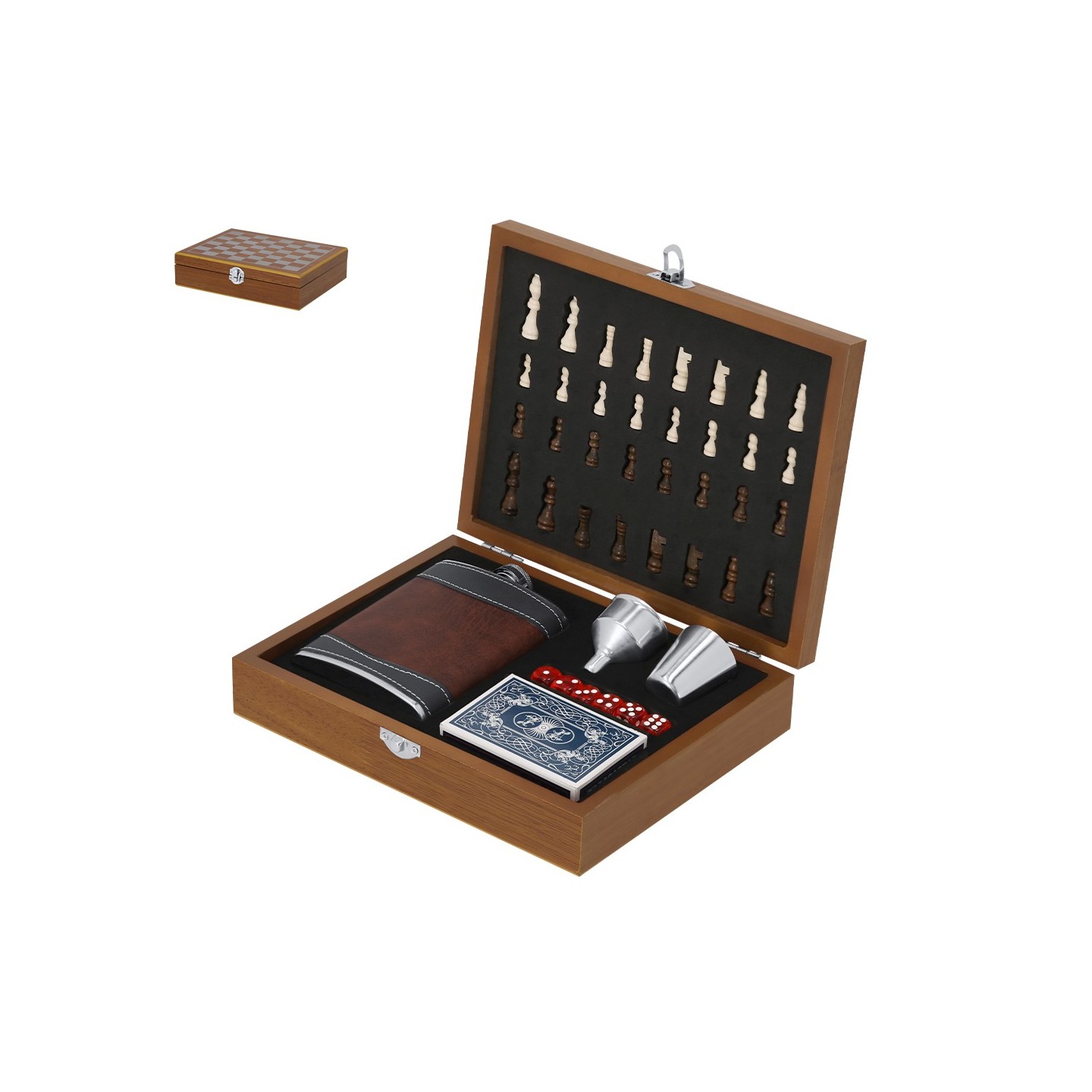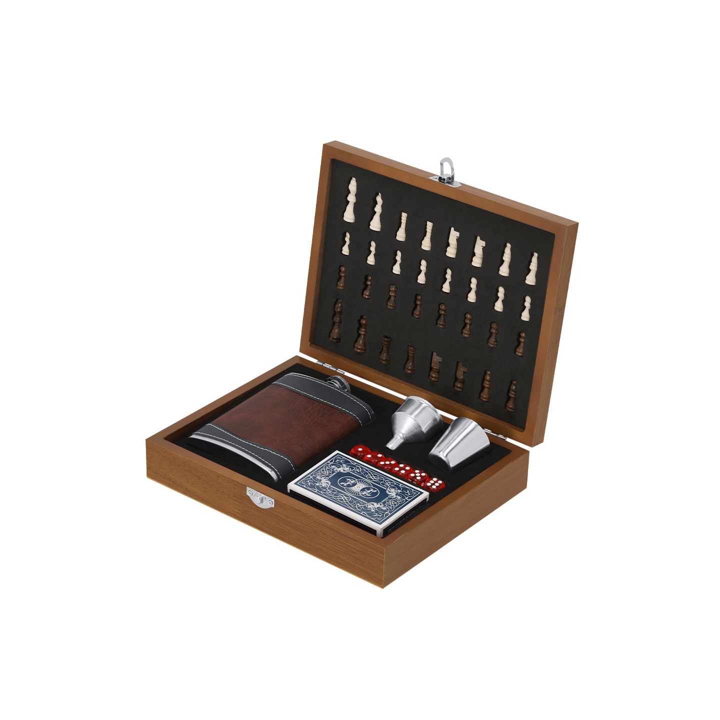 Set Petaca MENZIE con diseño de ajedrez, incluye petaca de 220 ml, vaso, embudo, baraja de cartas, dados y juego de ajedrez. Personalizable con logotipo.