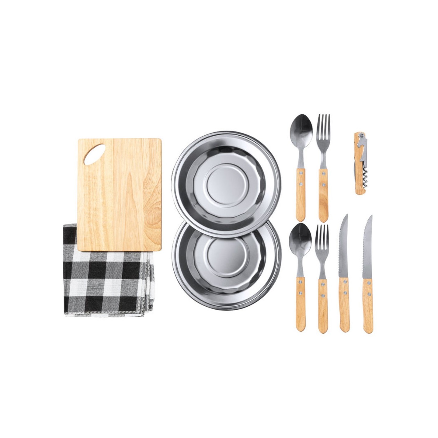 La calidad y la elegancia se fusionan en el contenido de este set excepcional. Encontrarás 2 cucharas, 2 cuchillos y 2 tenedores en acero inoxidable con mangos de madera natural, una selección que no solo es funcional y duradera, sino que también añade un toque rústico y sofisticado a tus comidas al aire libre.