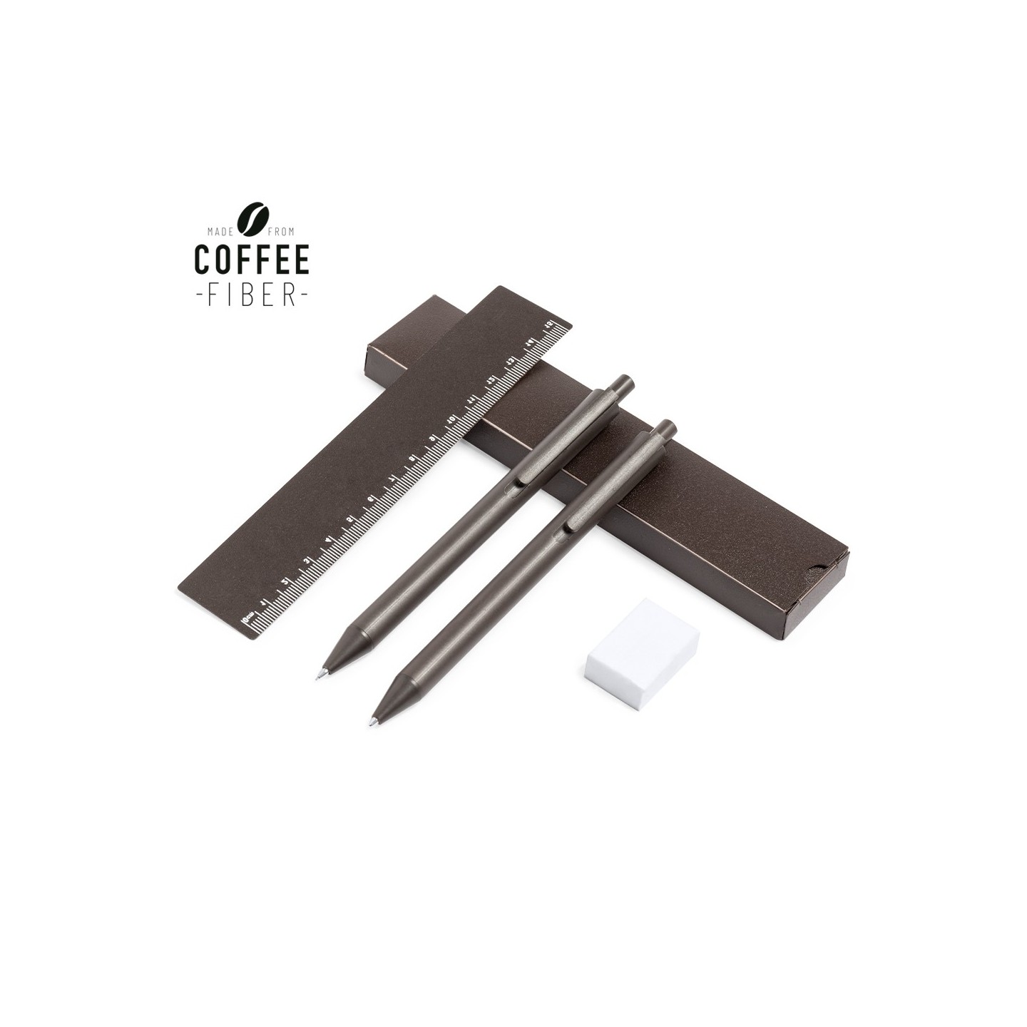El Set Proston consta de bolígrafo, portaminas, regla en fibra de café y goma. Sostenible y práctico. Personalizable para tu marca