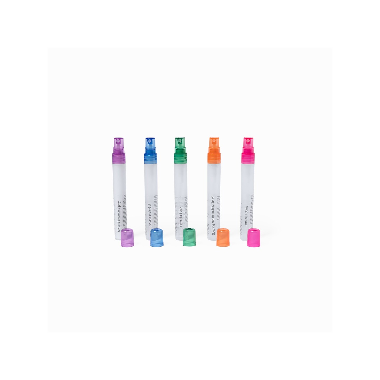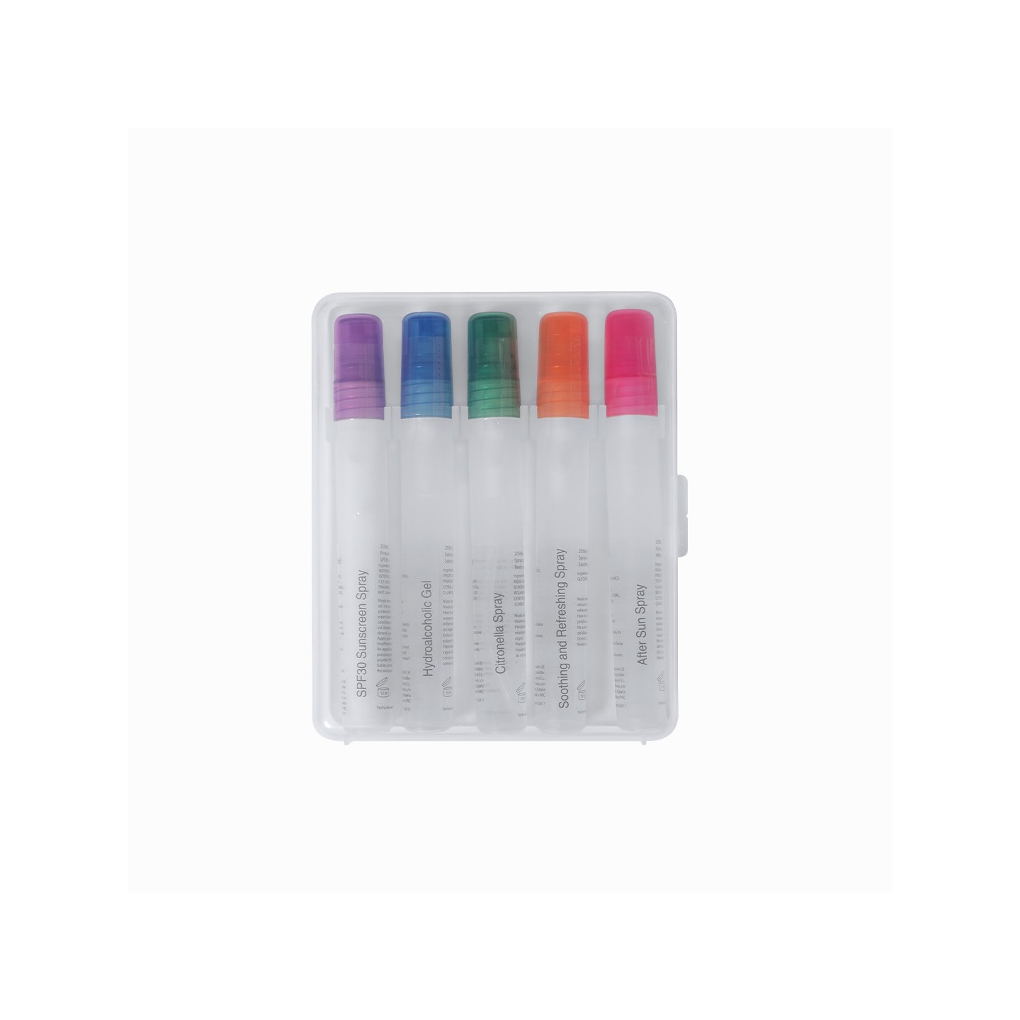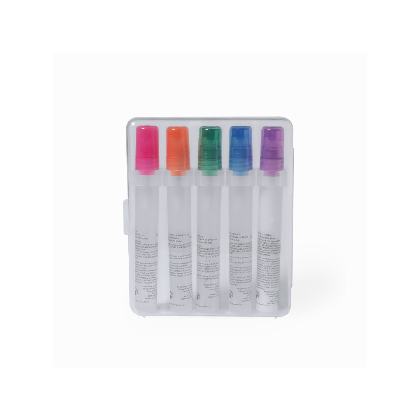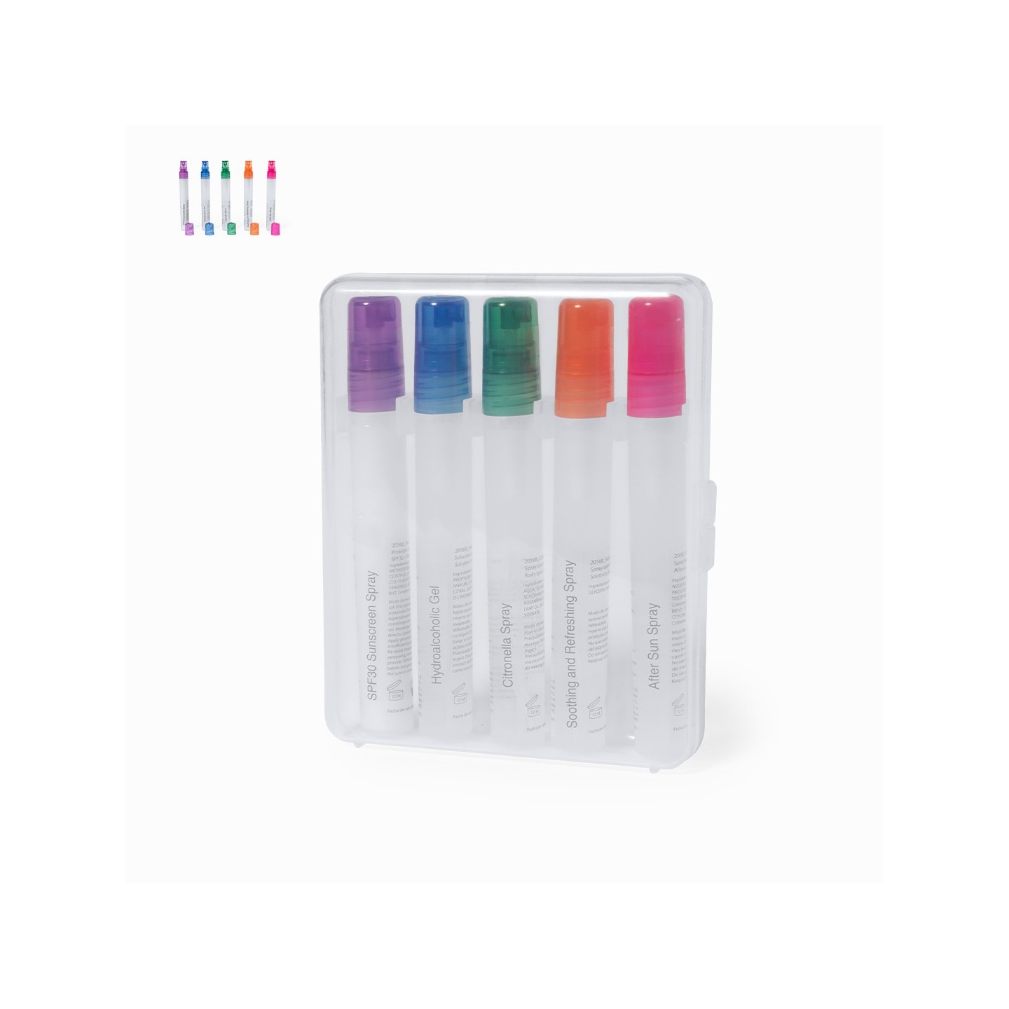 El Set Yohan trae 5 sprays para protección solar, hidratación post-sol, higiene de manos, citronela y alivio de picaduras. Presentado en estuche transparente. Personalizable.