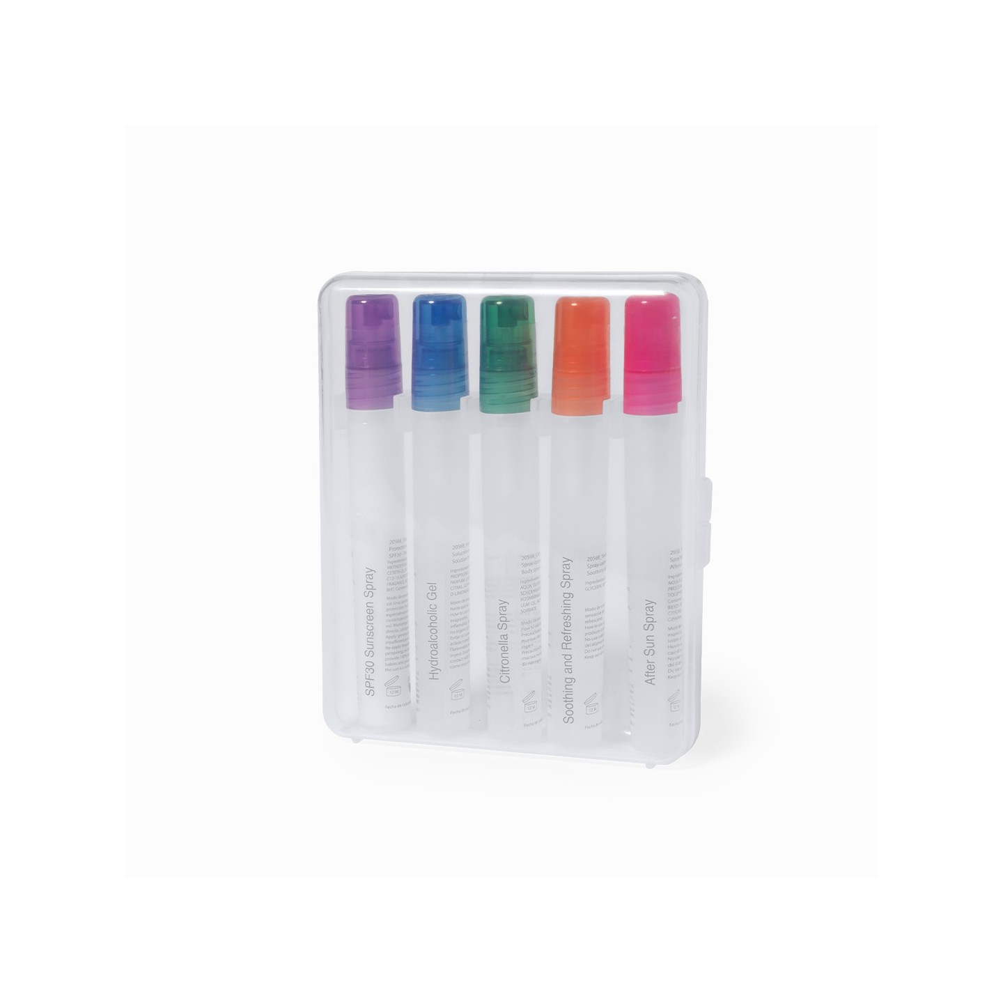 El Set Yohan trae 5 sprays para protección solar, hidratación post-sol, higiene de manos, citronela y alivio de picaduras. Presentado en estuche transparente. Personalizable.