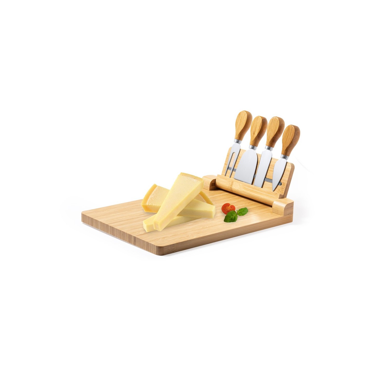 El Set Quesos Mildred trae una tabla de bambú, accesorios de acero inoxidable en elegante caja kraft. Regalo corporativo perfecto.