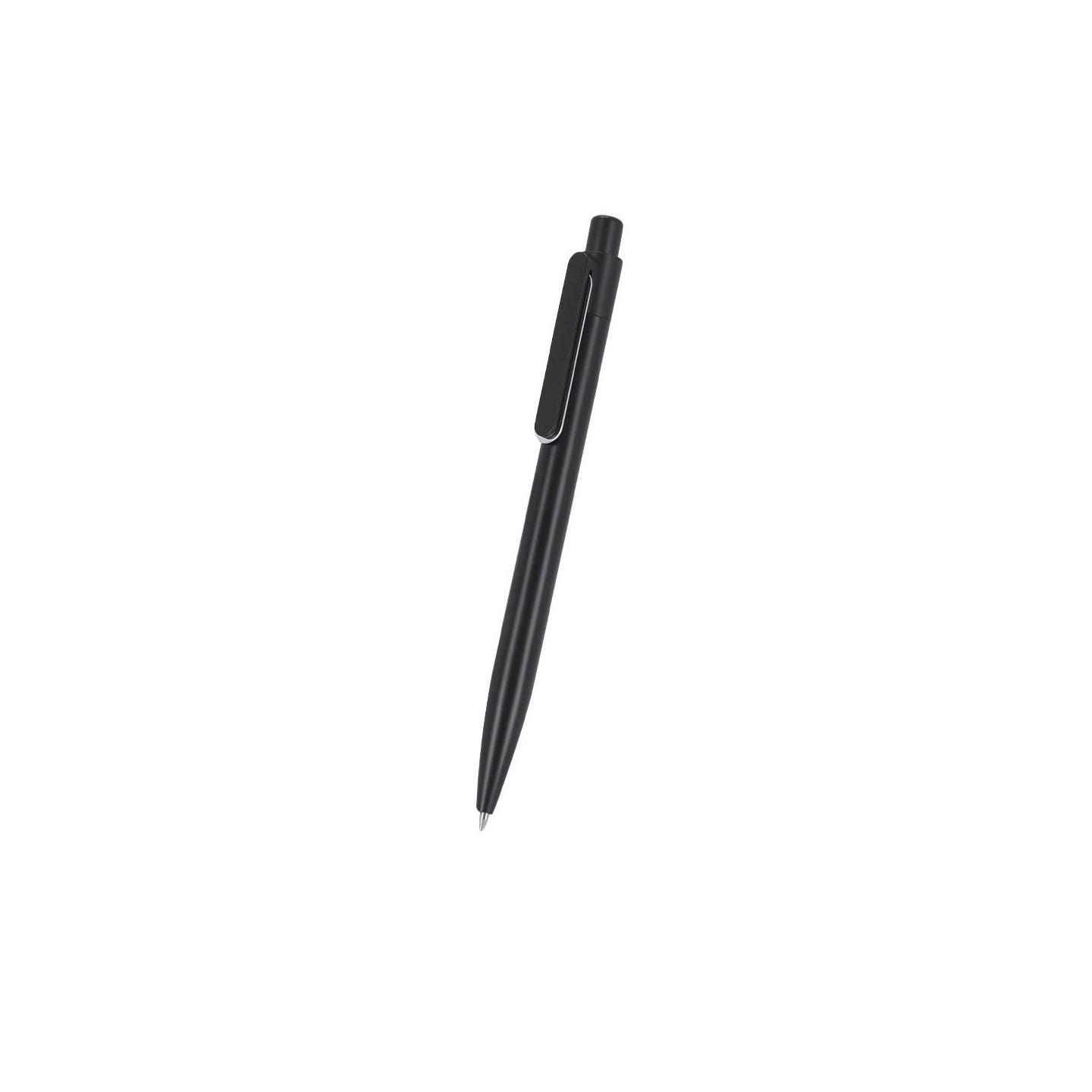 El bolígrafo, de acabado negro mate, está fabricado en Aluminio Reciclado y presenta un mecanismo pulsador, clip y un detalle decorativo en metal pulido, lo que le otorga un toque distintivo y profesional. Este bolígrafo es ideal para marcar la diferencia en el día a día, con un diseño elegante y práctico.