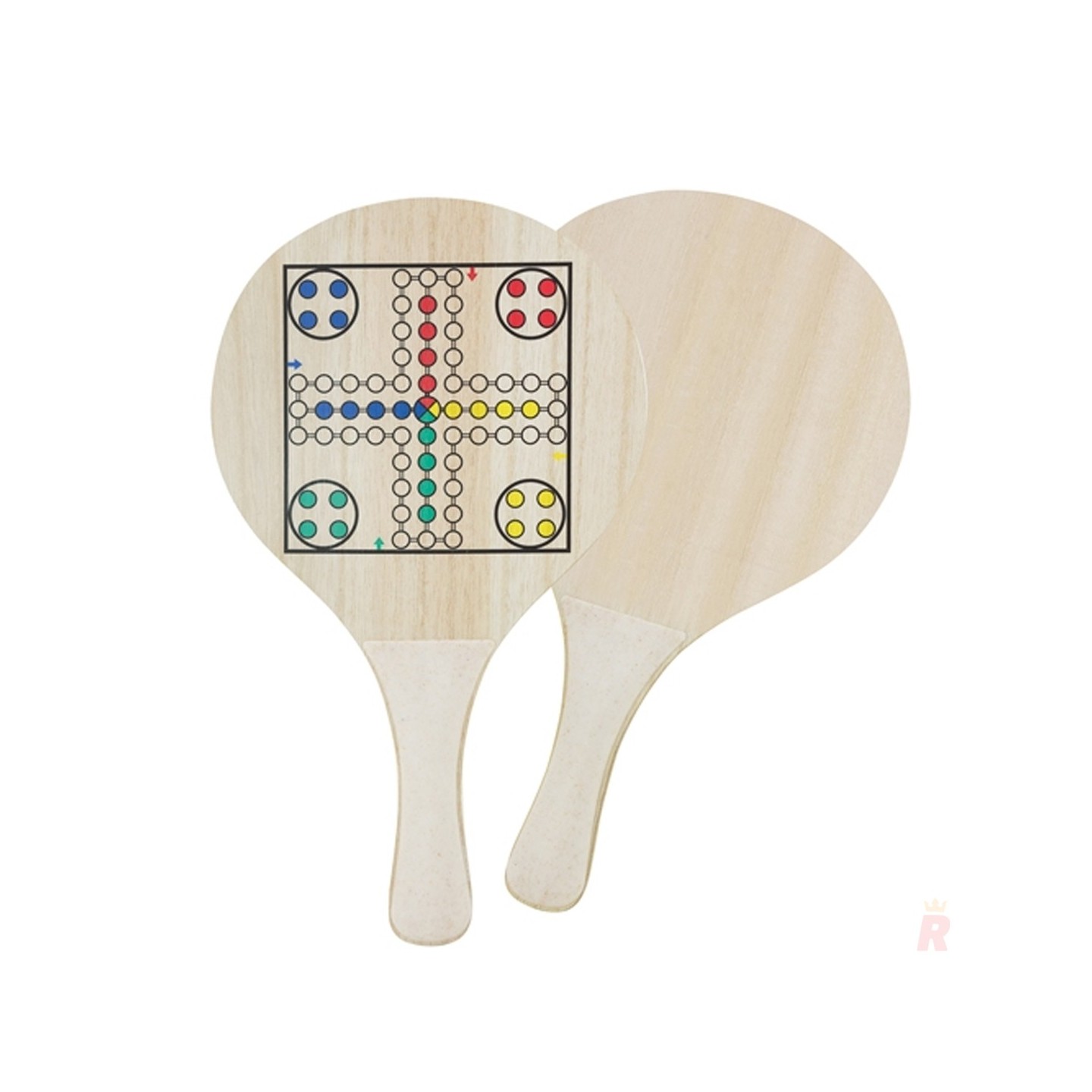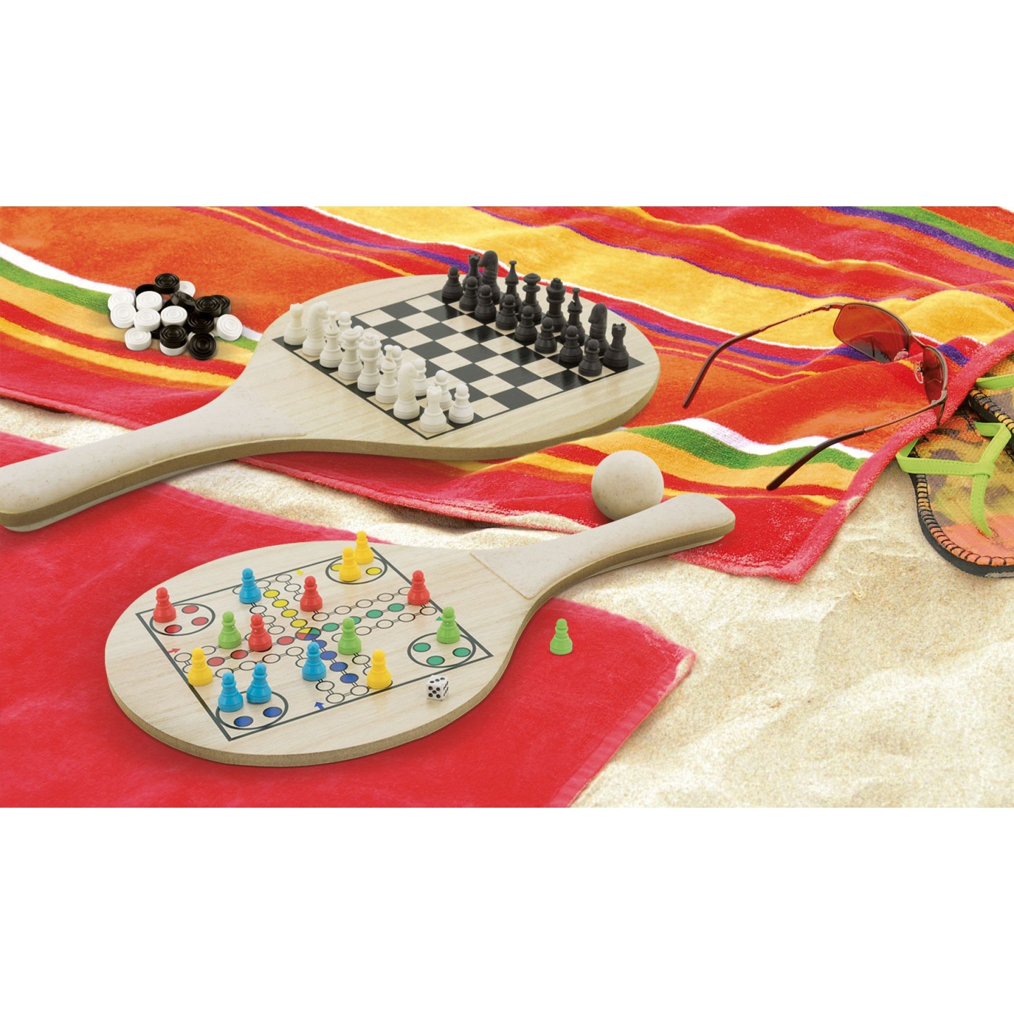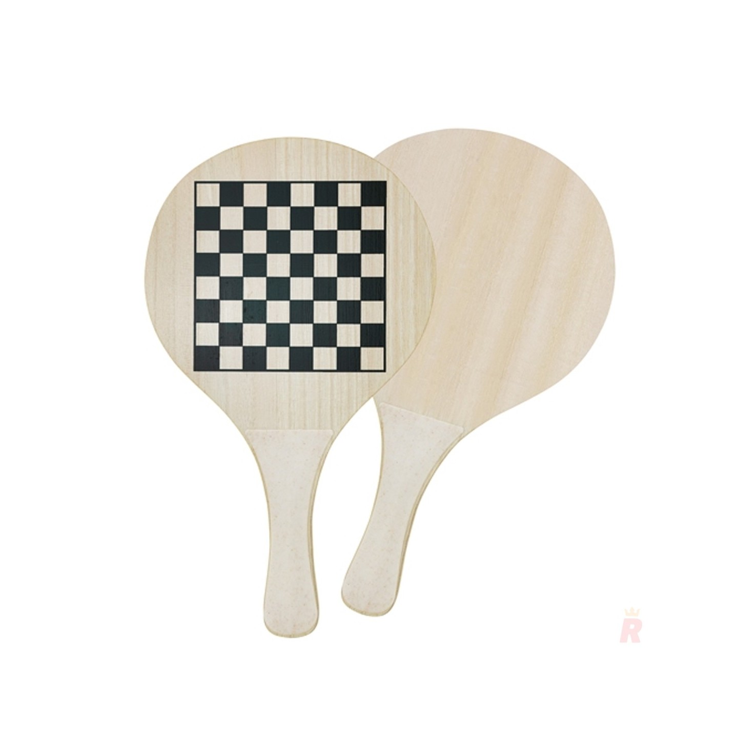Set ecológico de raquetas de playa en madera y fibra de trigo, con un lado para ajedrez y otro para parchís. Incluye bolsa con piezas y pelota, ideal para personalizar