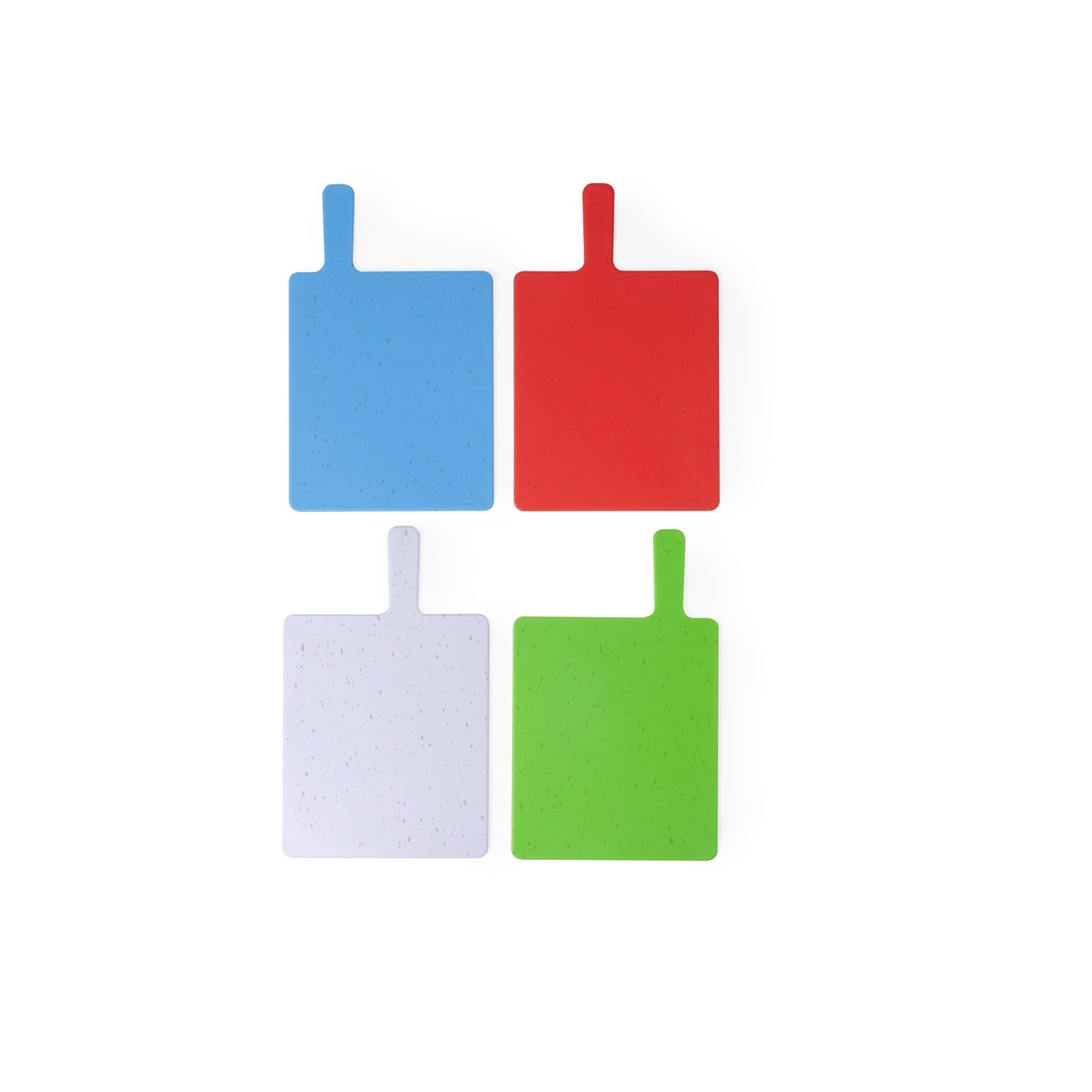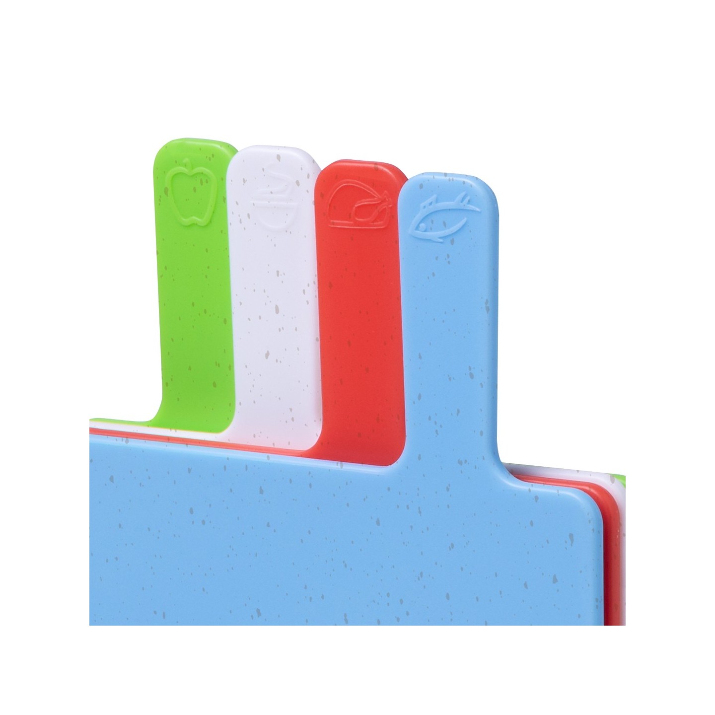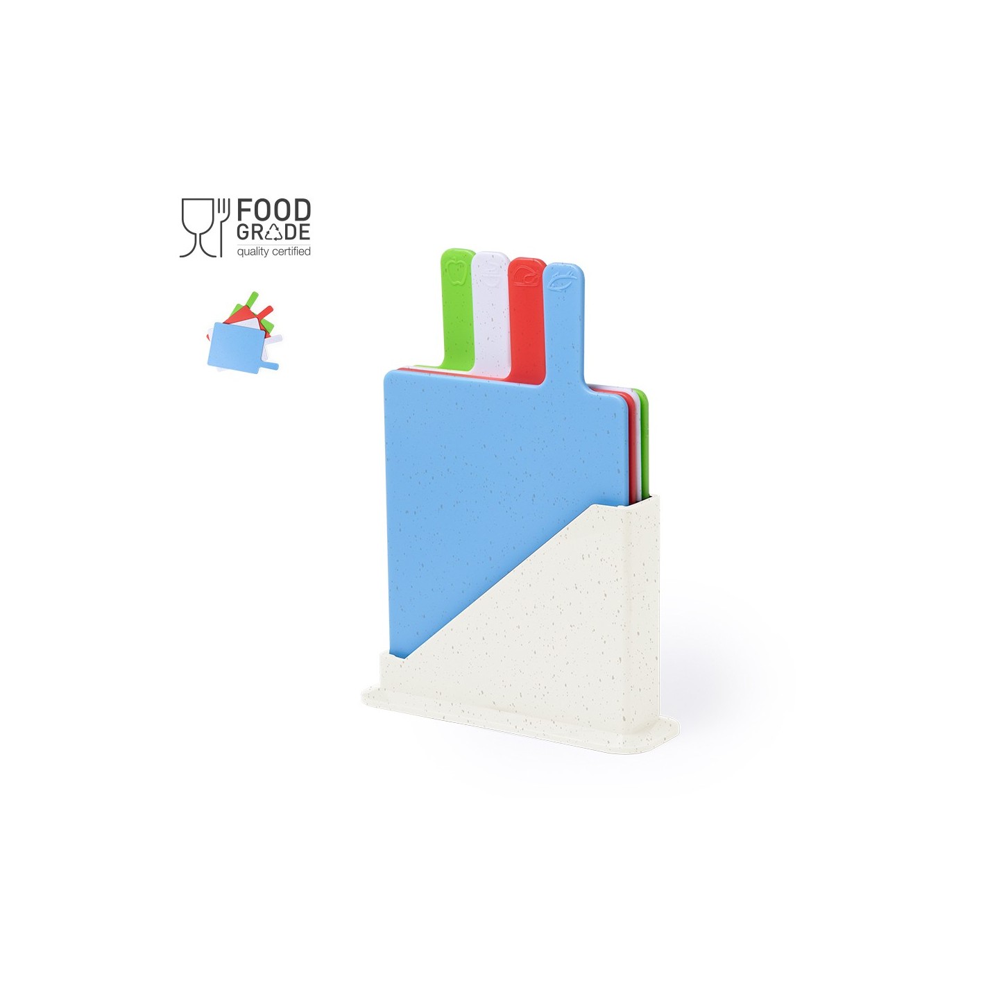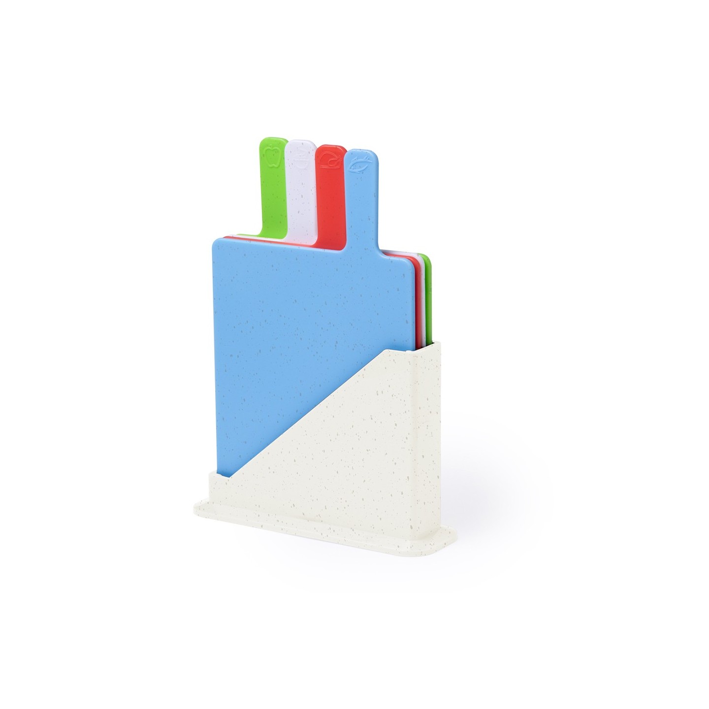 El Set Tablas Miquelson trae 4 tablas de PP con soporte, colores y dibujos grabados. Personalizable. Ideal para cocina organizada