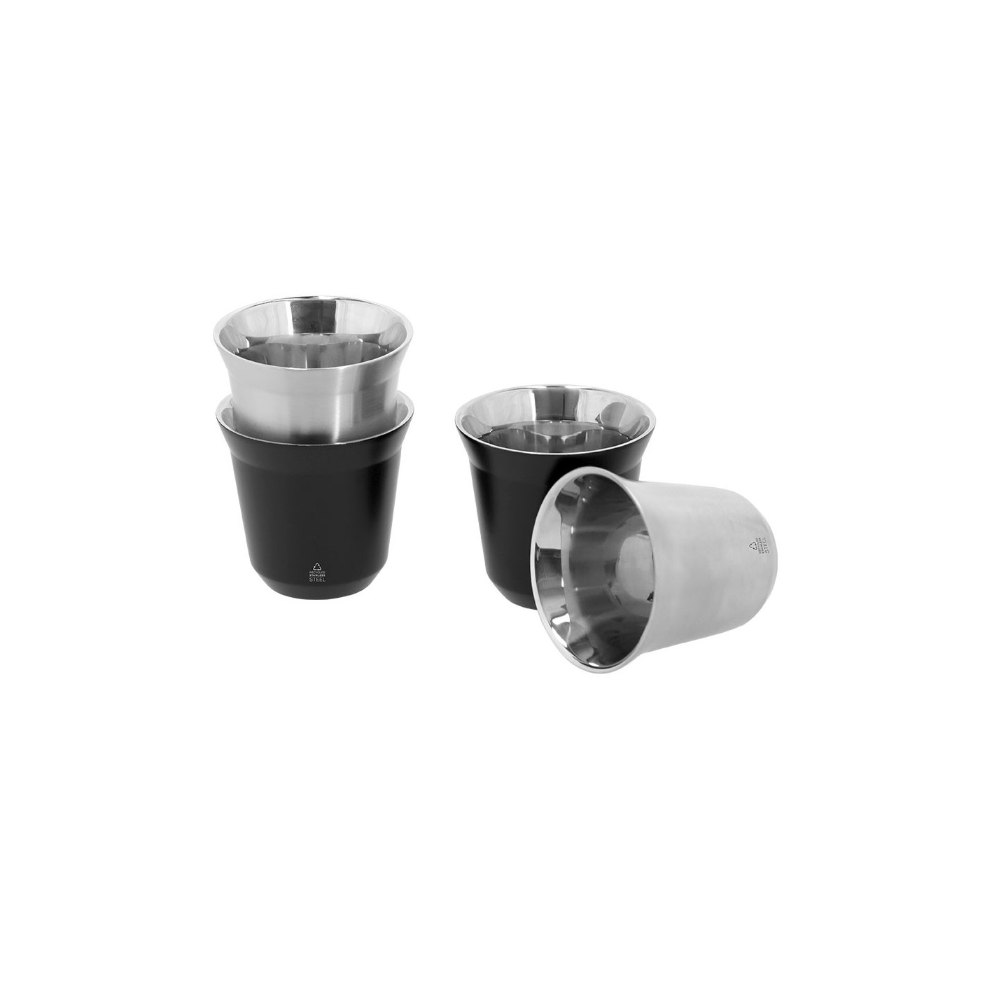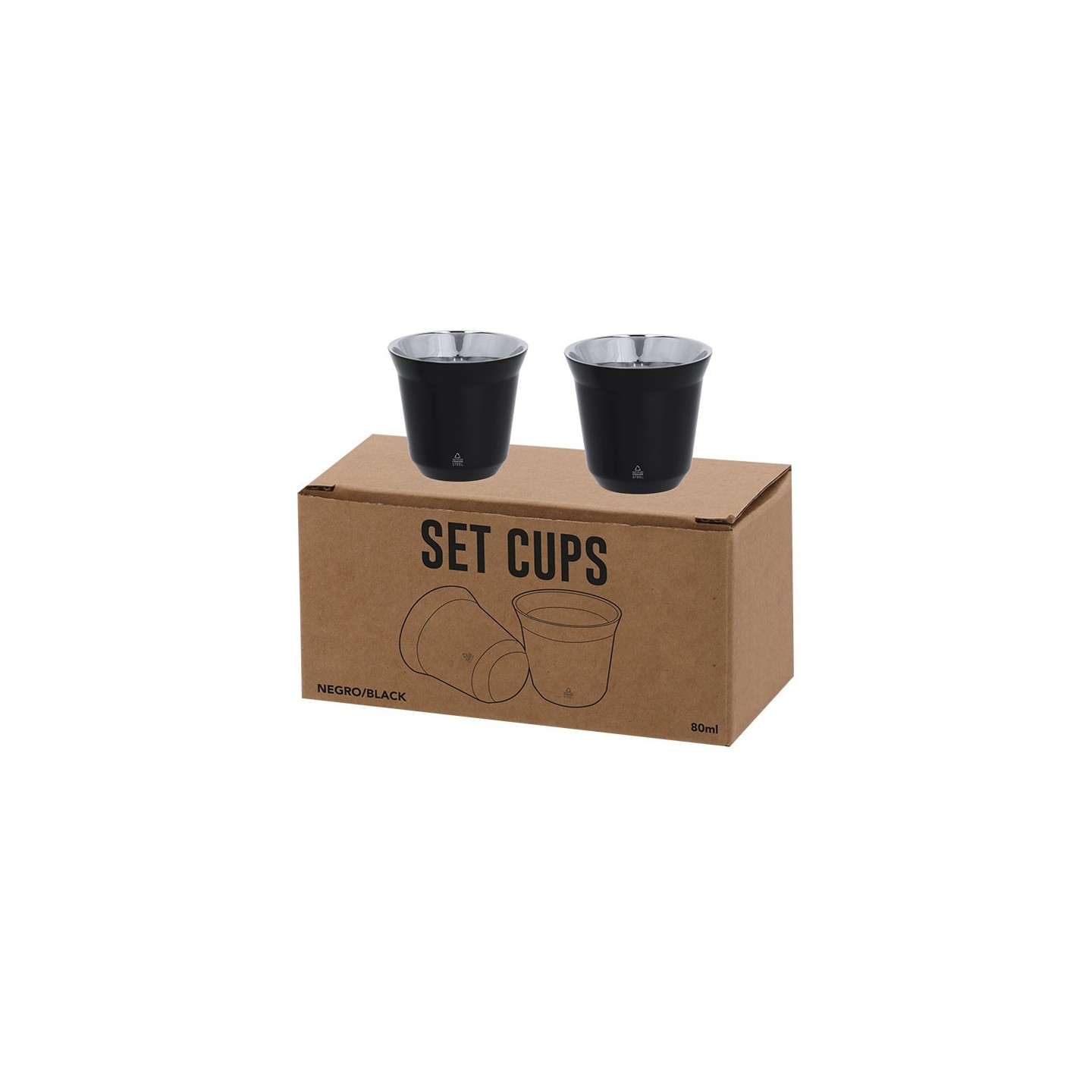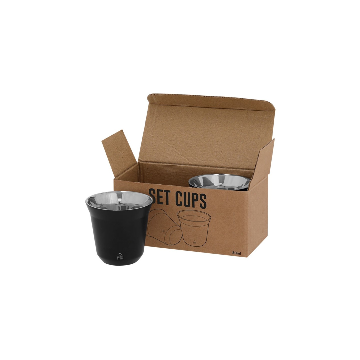 Set de 2 vasos de acero inoxidable reciclado de doble pared, con capacidad de 80 ml. Personalizables con logotipo, ideales para regalos corporativos sostenibles.
