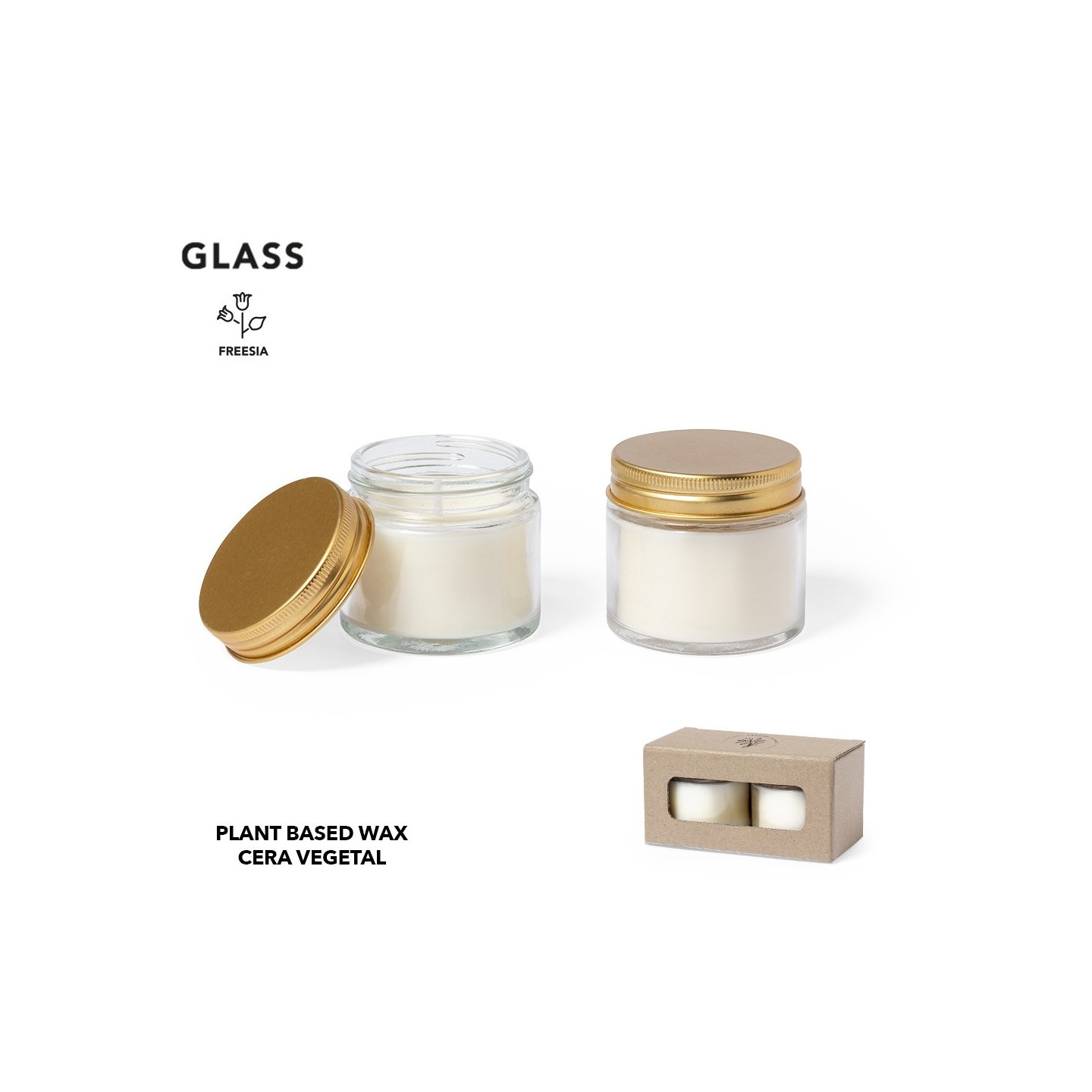 Este set incluye velas aromáticas de alta calidad, elaboradas con cera vegetal y con un exquisito aroma a flor de Fresia. Cada vela viene presentada en un elegante tarrito de cristal con tapón a rosca metálico y un sofisticado acabado dorado.