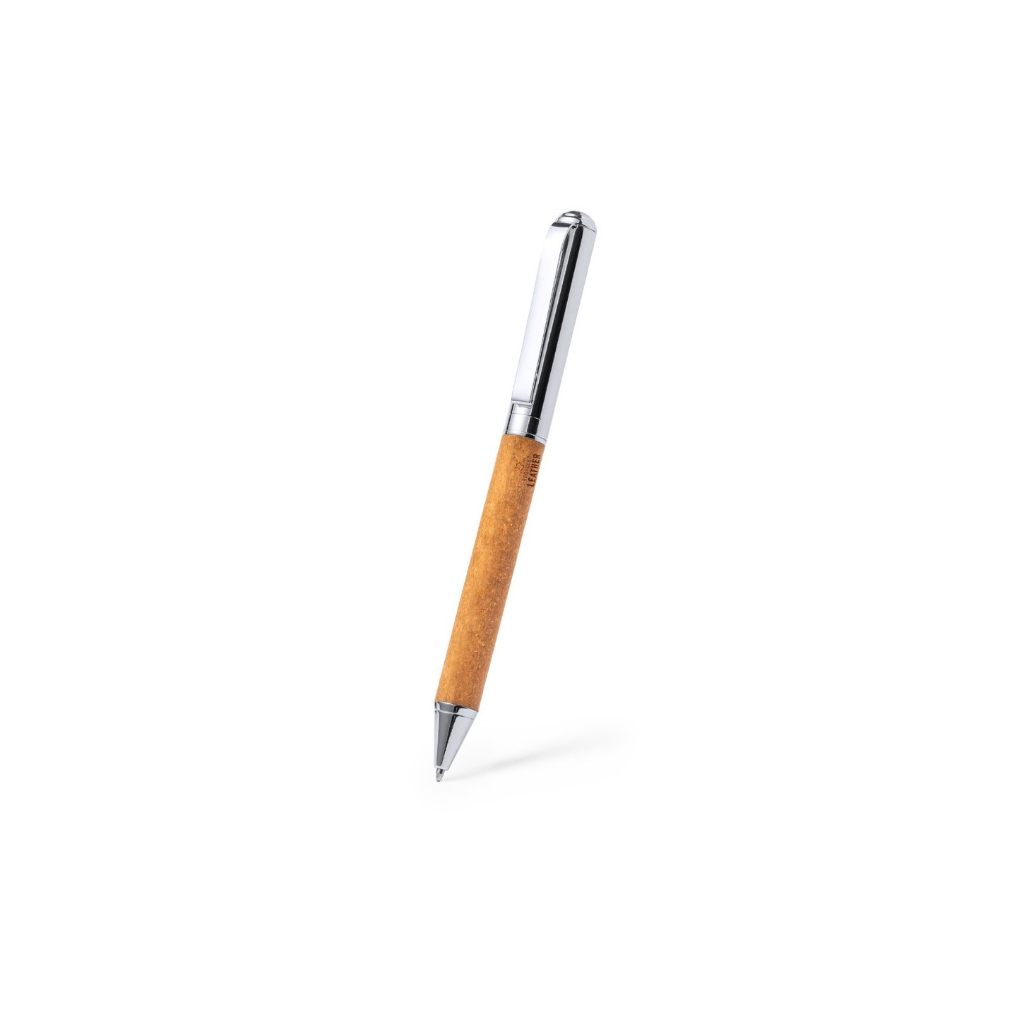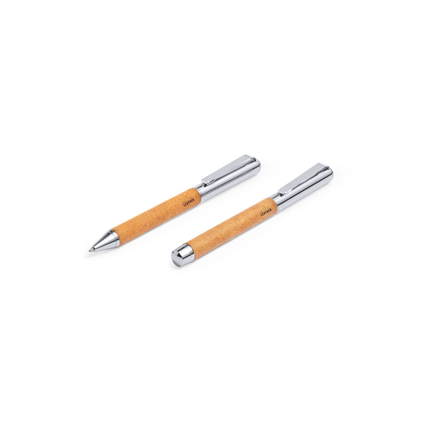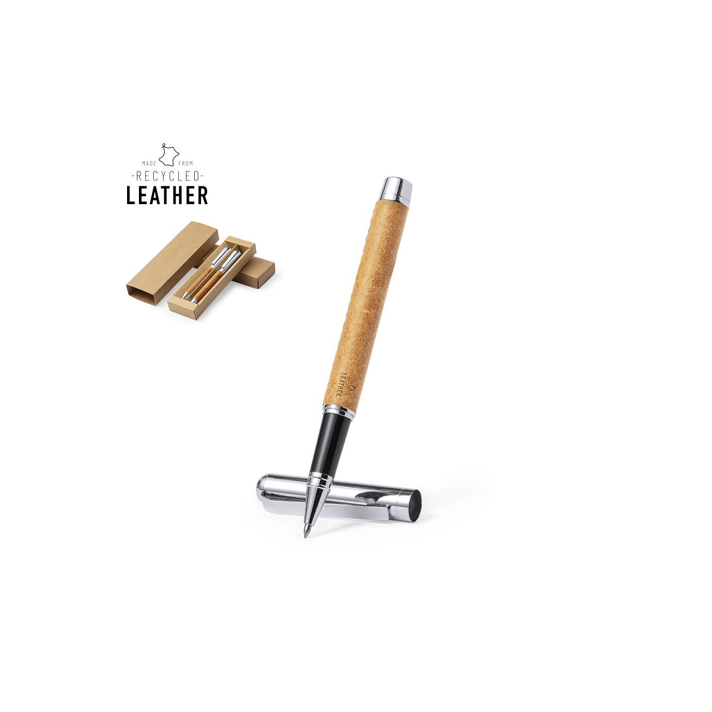El set Vincen es la combinación perfecta de elegancia y sostenibilidad. Este set incluye un bolígrafo y un roller metálicos, con cuerpos recubiertos en cuero reciclado, destacando su compromiso con el medio ambiente.