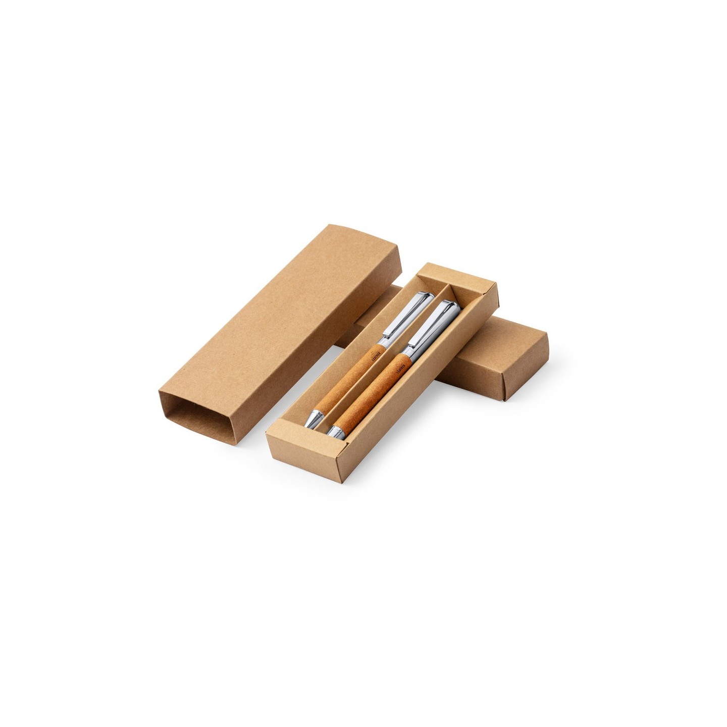 Set Vincen con bolígrafo y roller metálicos con cuerpo en cuero reciclado. Estuche de diseño kraft. Elegancia y sostenibilidad en un conjunto.