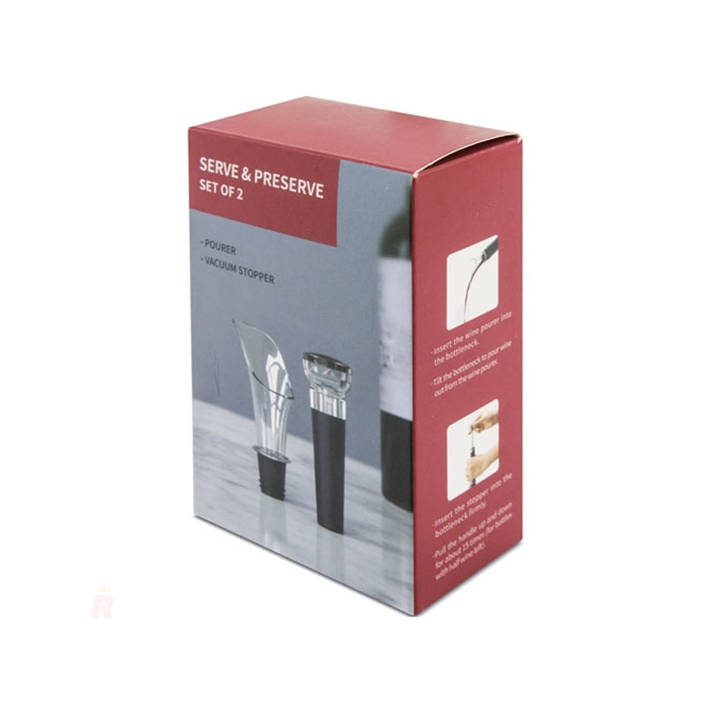 Set de vino de 2 piezas, incluye decantador y tapón de vacío. Fabricado en ABS y silicona, ideal para amantes del vino y regalos promocionales de empresa