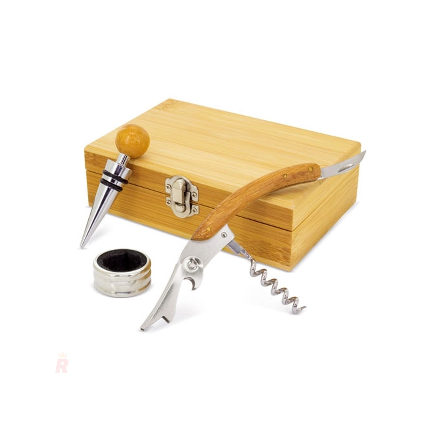 Set vino con abrebotellas, anillo antigoteo y tapón, presentado en un estuche bambú. Personalizable con logotipo. Medidas: 10.40 x 5 x 16.20 cm.