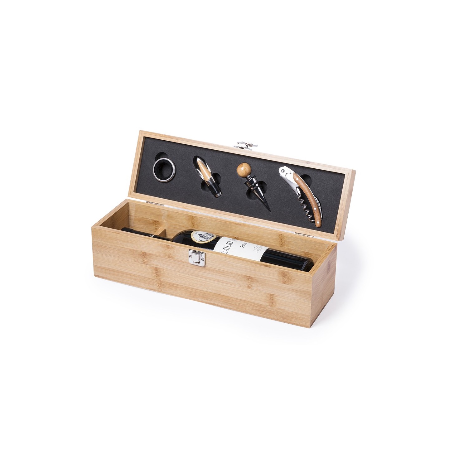 El estuche individual de madera de bambú no solo protege y presenta los accesorios de manera sofisticada, sino que también cuenta con un compartimento interior especialmente diseñado para alojar una botella de vino (botella no incluida). Es el regalo perfecto para ocasiones especiales, eventos corporativos o para aquellos que aprecian la excelencia enológica.