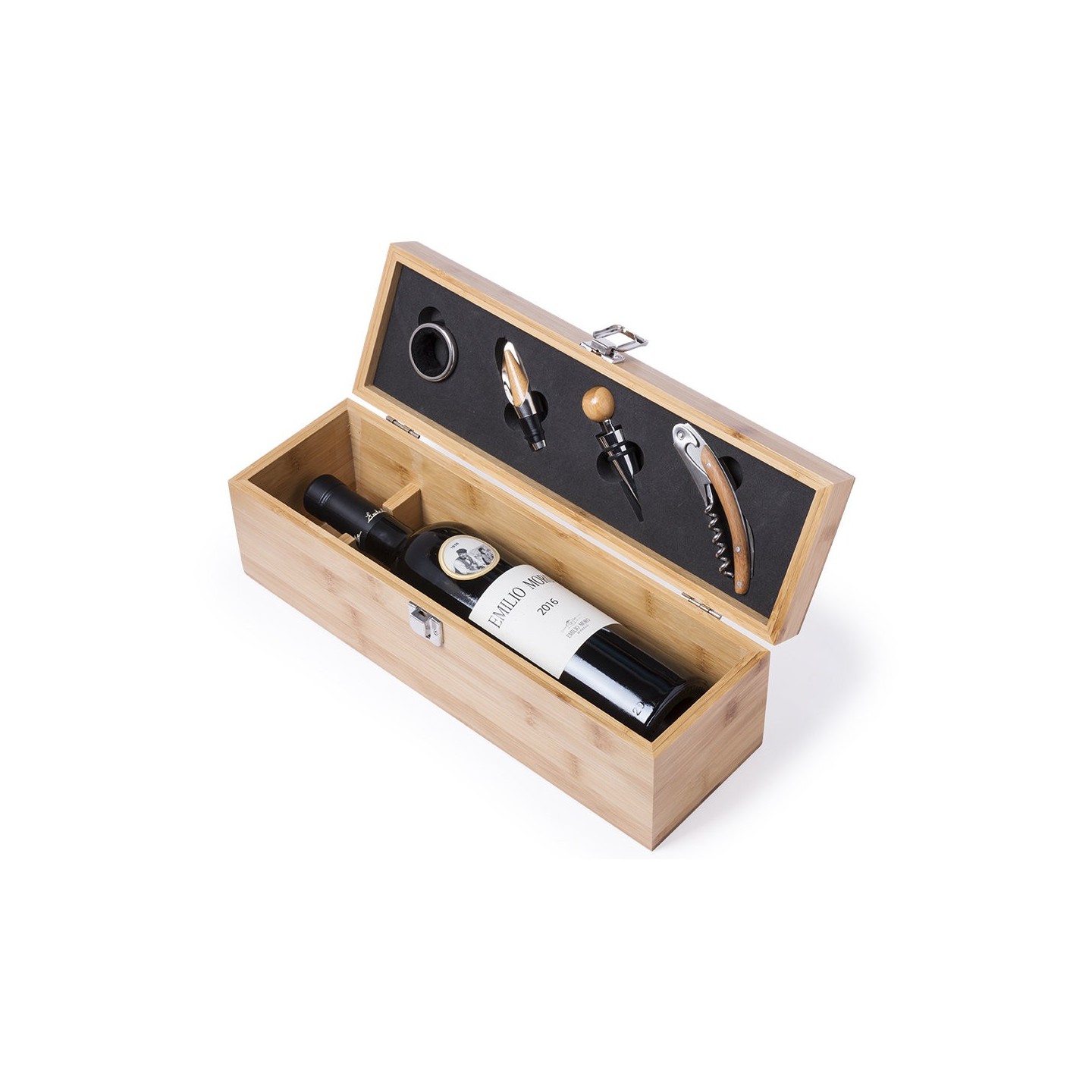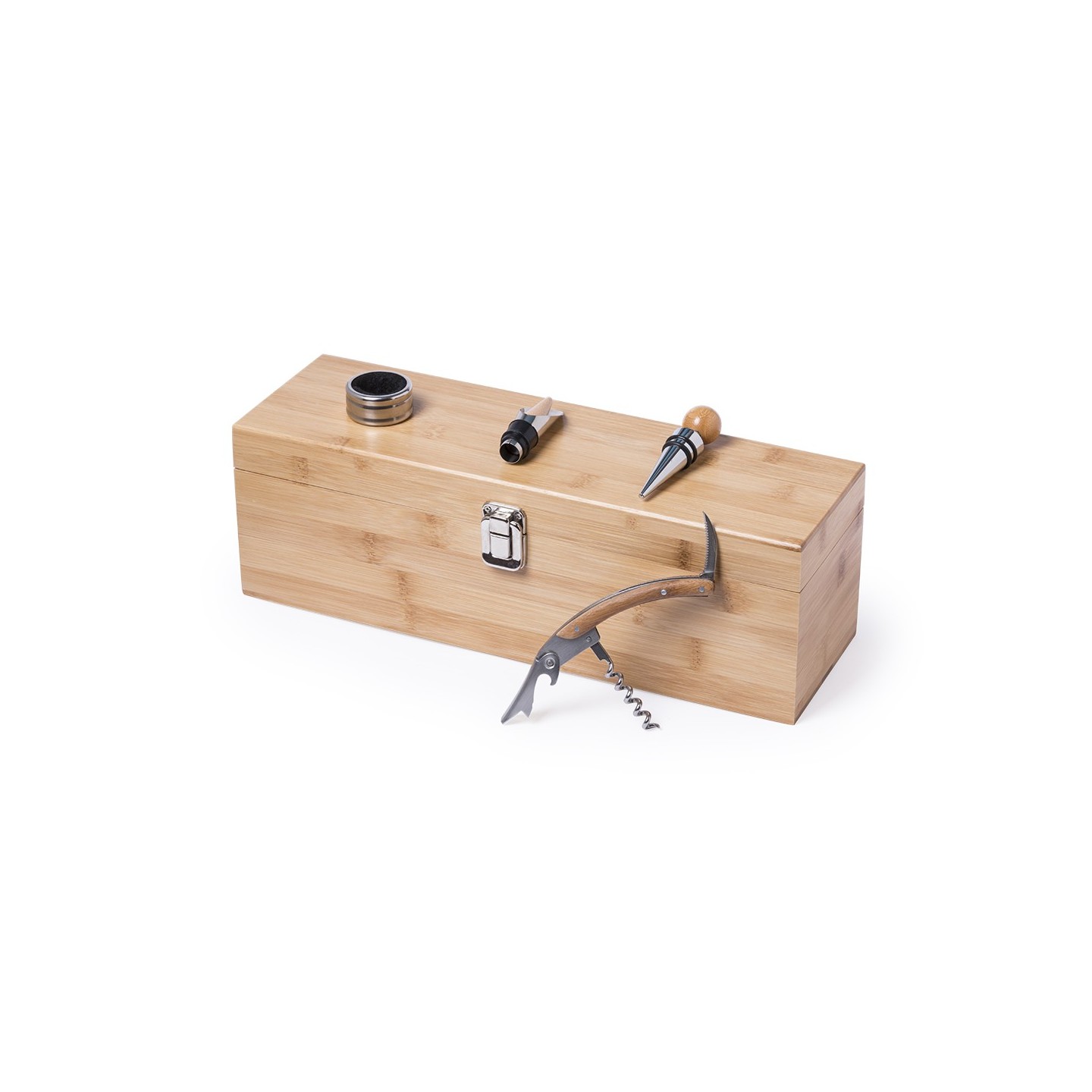 Un set premium de vinos con accesorios de acero inoxidable y estuche de madera de bambú. Ideal para los amantes del vino.