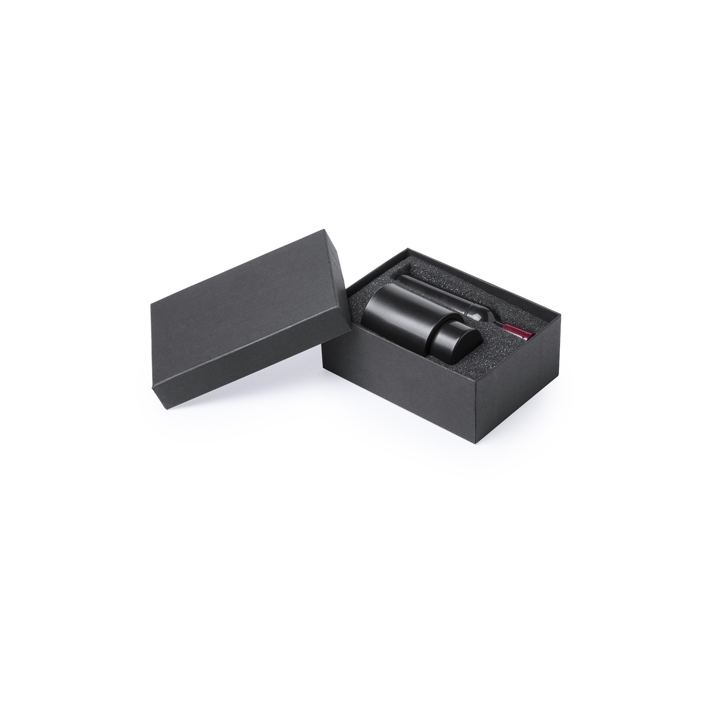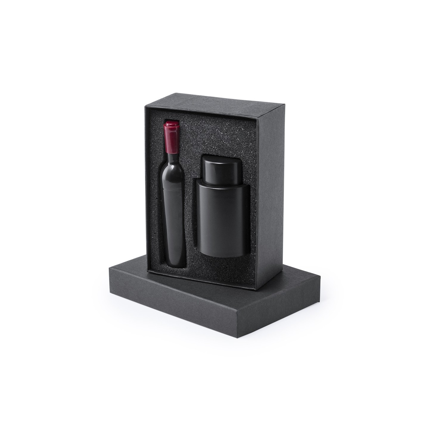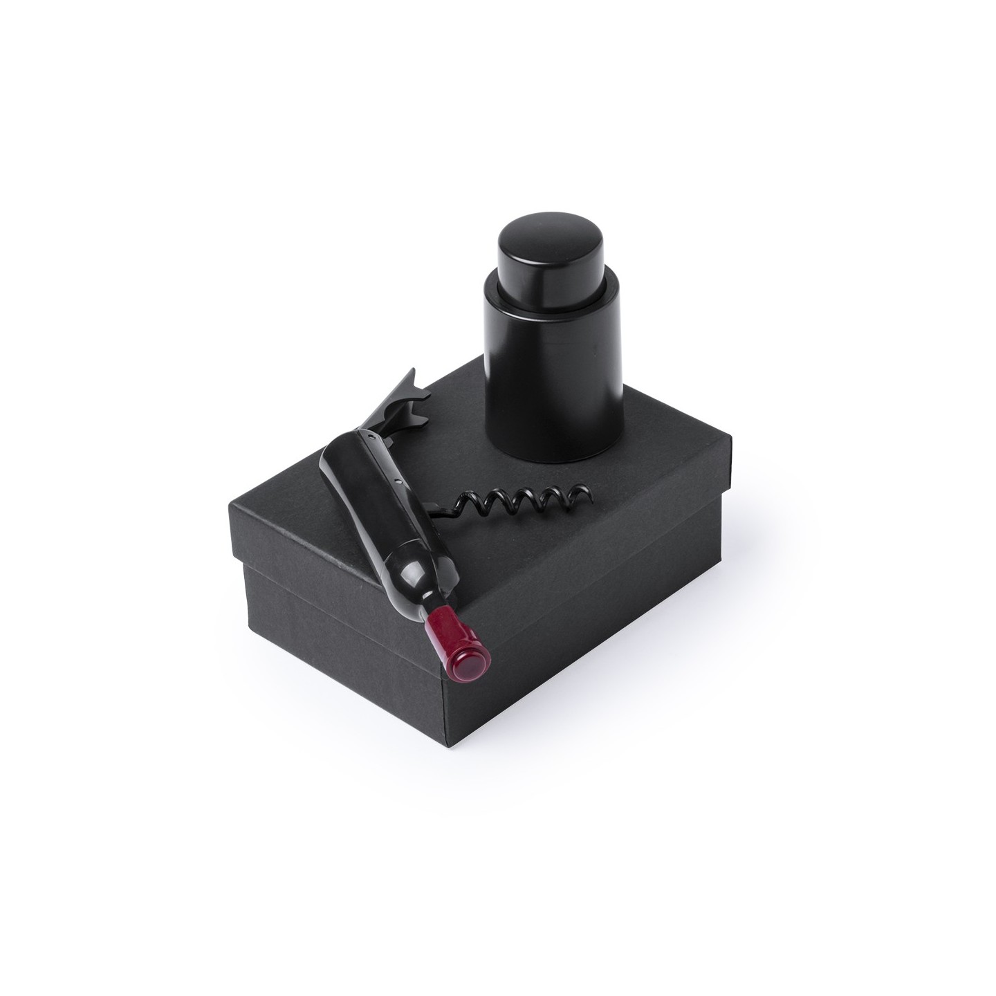 Disfruta del placer del vino con el Set Vinos Kazan. Incluye sacacorchos en forma de botella y tapón con bomba de vacío en estuche de cartón negro.