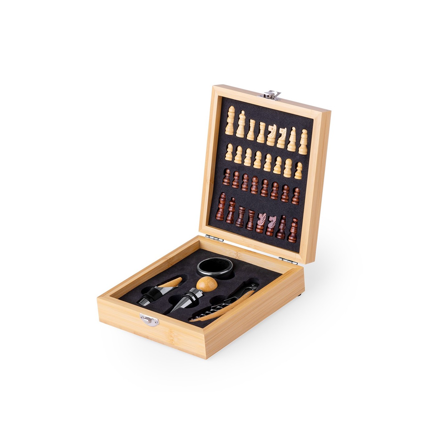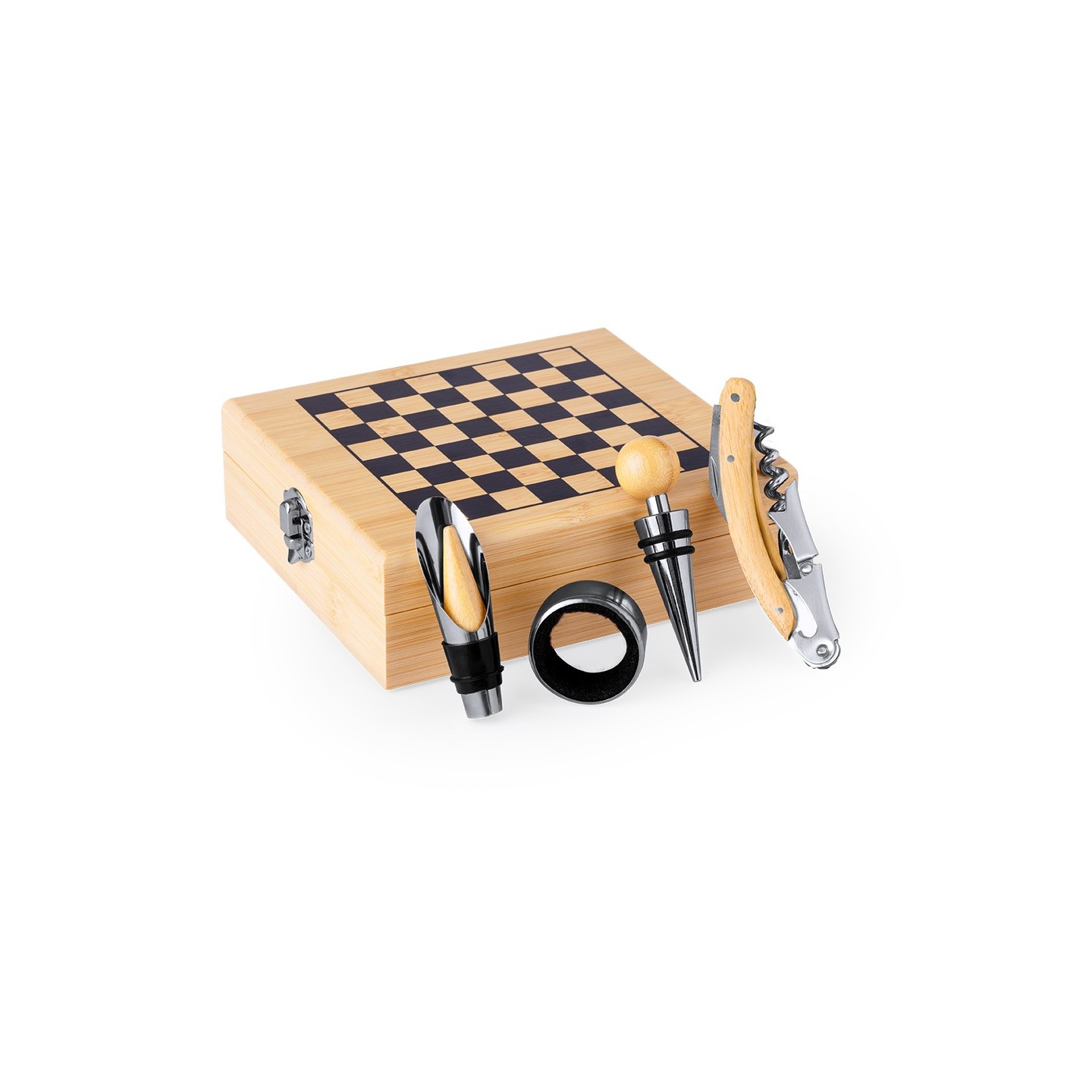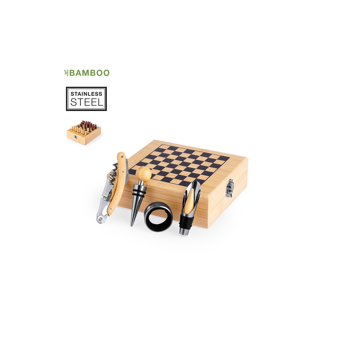 Original set de vinos ajedrez -piezas incluidas- acabado en bambú natural. Con cierre de seguridad y accesorios de acero inox y bambú. Incluye sacacorchos con cortacápsulas y abridor; tapón, decantador y recogegotas. Presentado en estuche individual con interior en suave espuma troquelada.