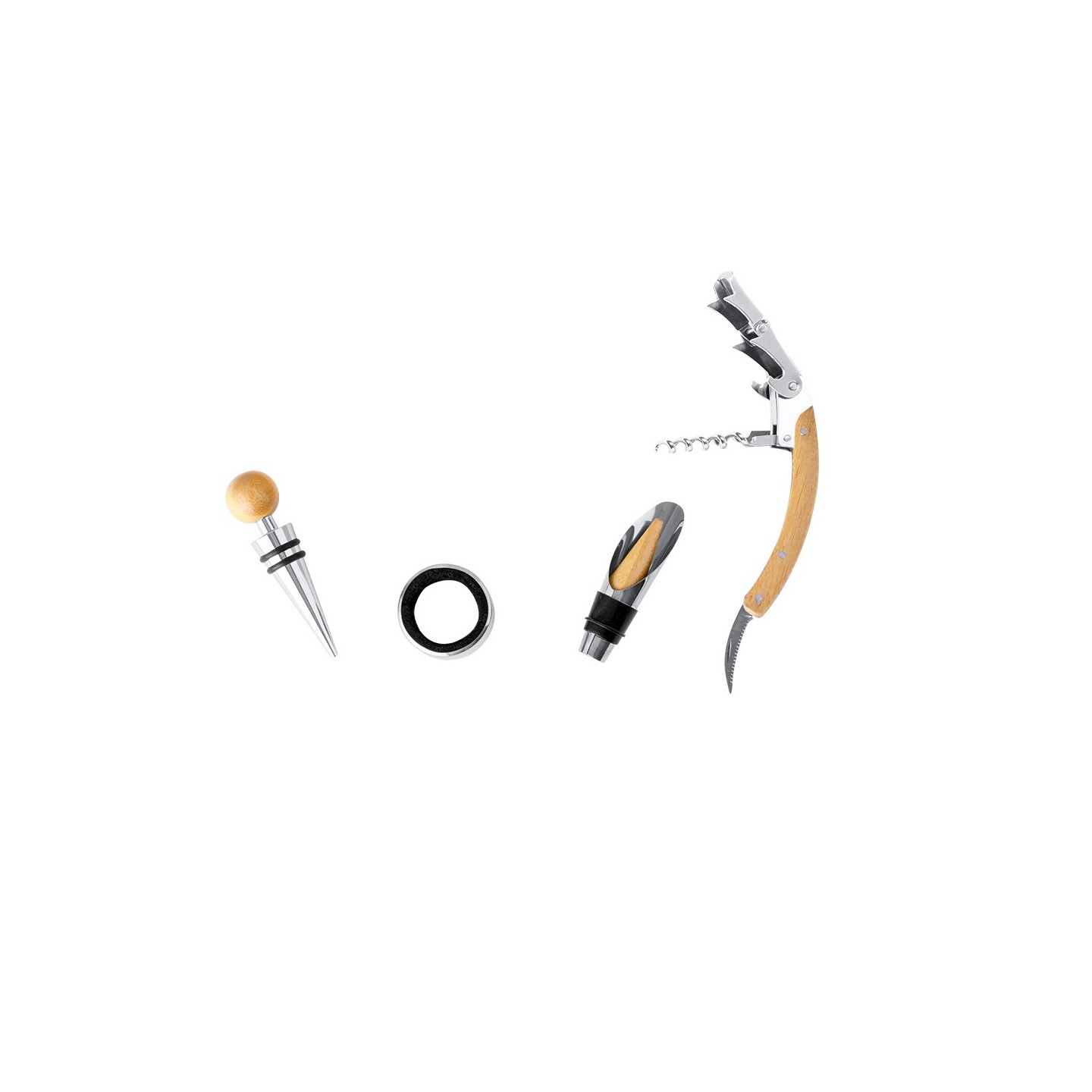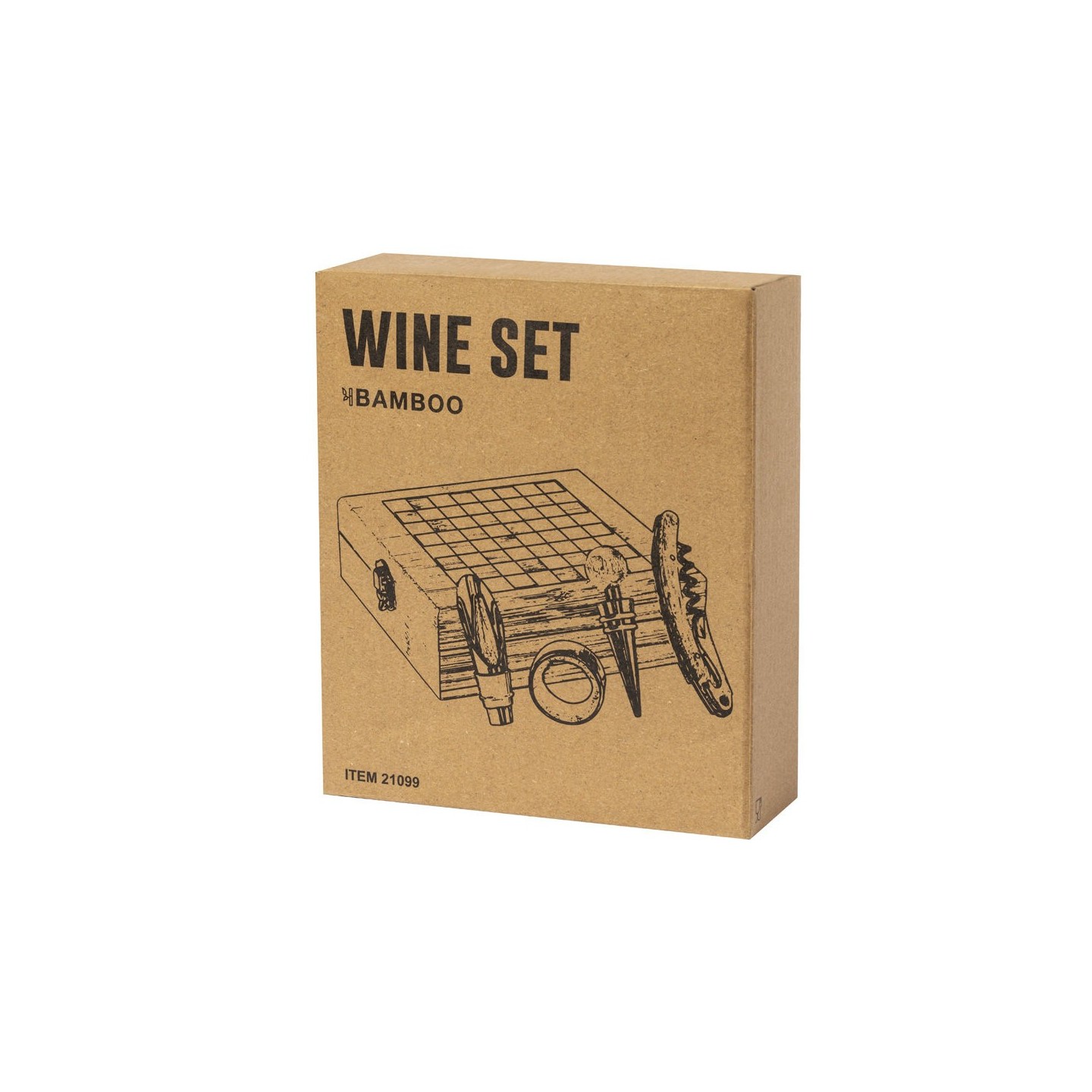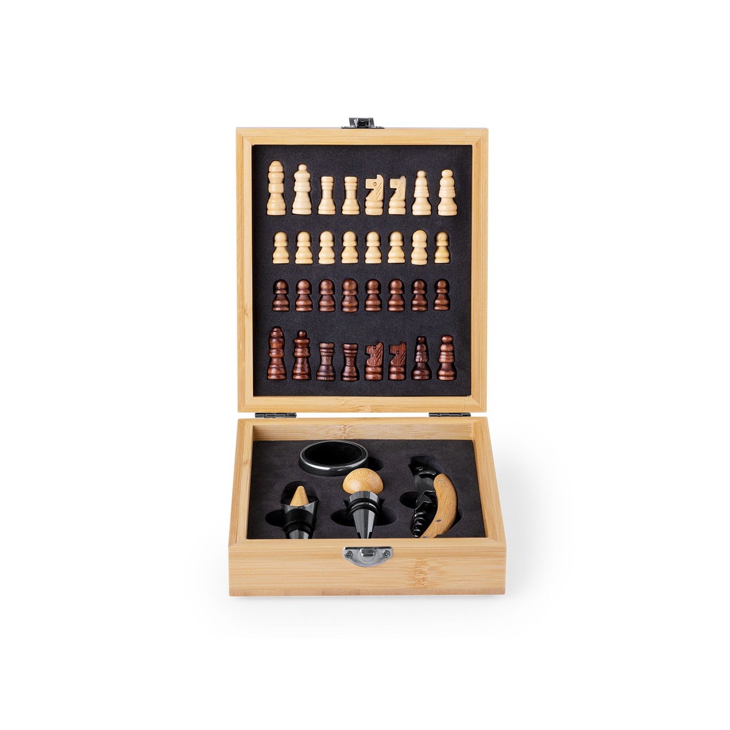 Original set de vinos ajedrez -piezas incluidas- acabado en bambú natural. Con cierre de seguridad y accesorios de acero inox y bambú. Incluye sacacorchos con cortacápsulas y abridor; tapón, decantador y recogegotas. Presentado en estuche individual con interior en suave espuma troquelada.