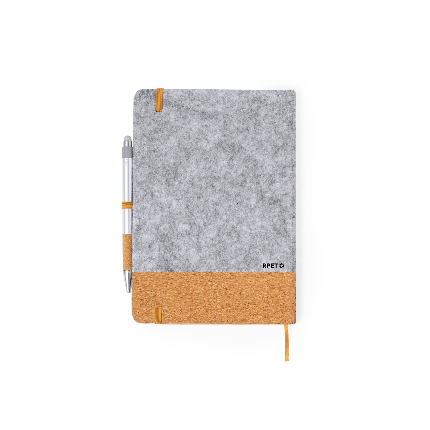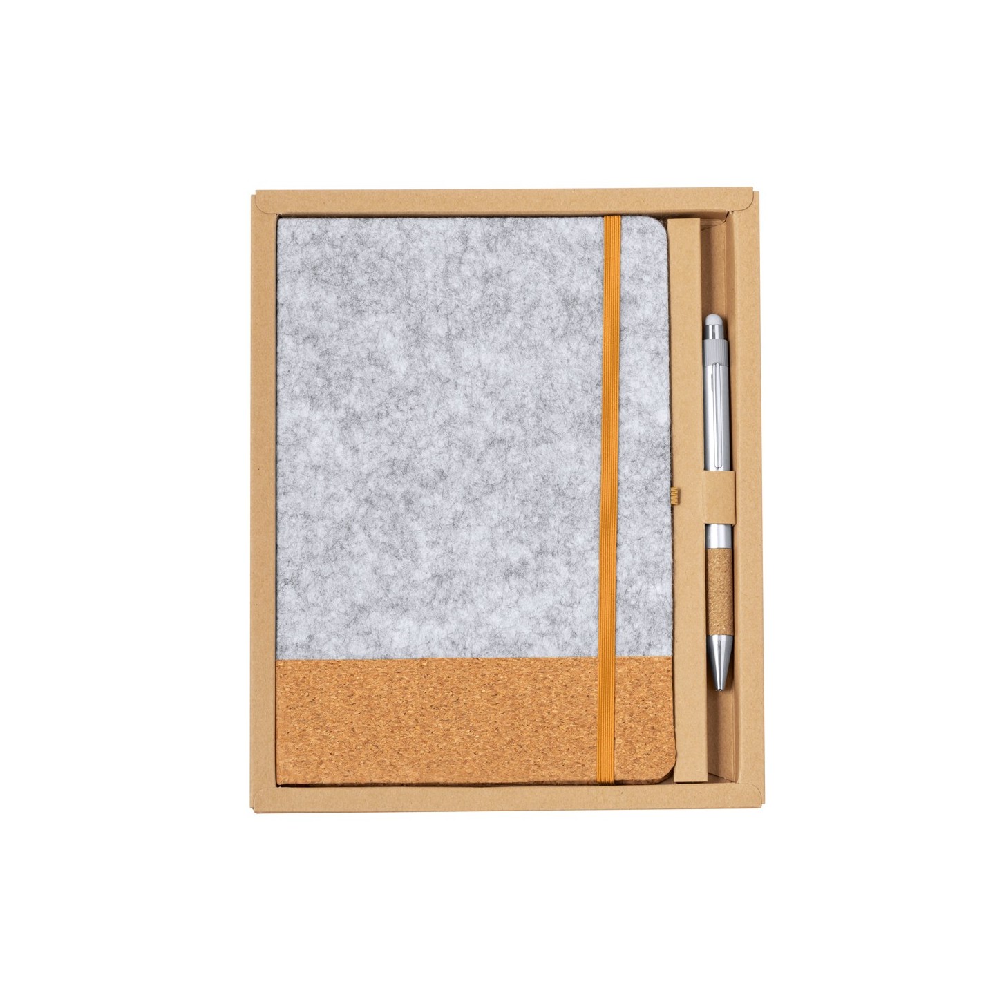 El bloc de notas está elaborado en fieltro RPET y corcho natural, lo que le confiere una apariencia única y respetuosa con el medio ambiente. Con tapas rígidas y 80 páginas lisas, ofrece una superficie ideal para tomar notas en cualquier momento. Además, cuenta con una banda elástica, marcapáginas y un elástico para sujetar el bolígrafo de color marrón incluido en el set.