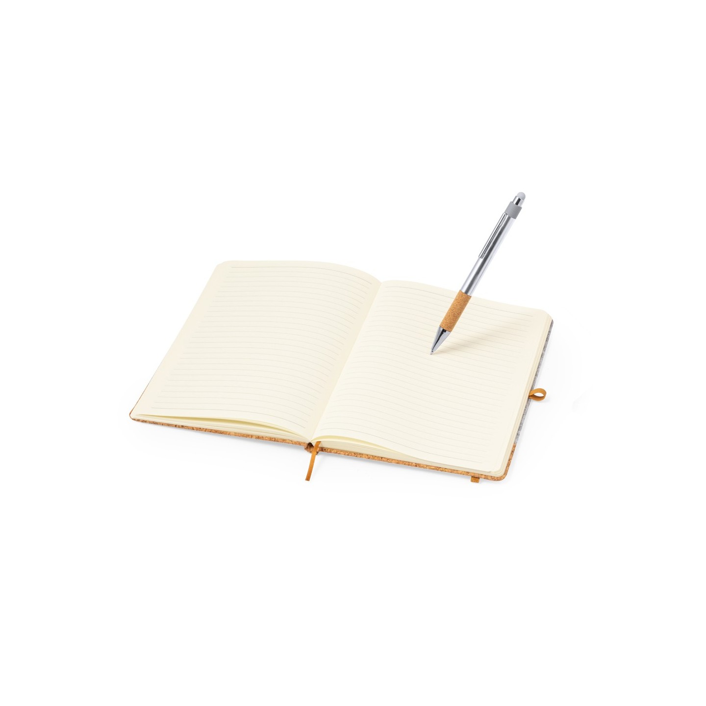 El bolígrafo, por su parte, está fabricado en aluminio reciclado, con una empuñadura de corcho natural que proporciona un agarre cómodo y ergonómico. Equipado con un mecanismo pulsador y tinta azul de alta calidad, es perfecto para acompañar al bloc de notas en reuniones, conferencias o en el día a día en la oficina.