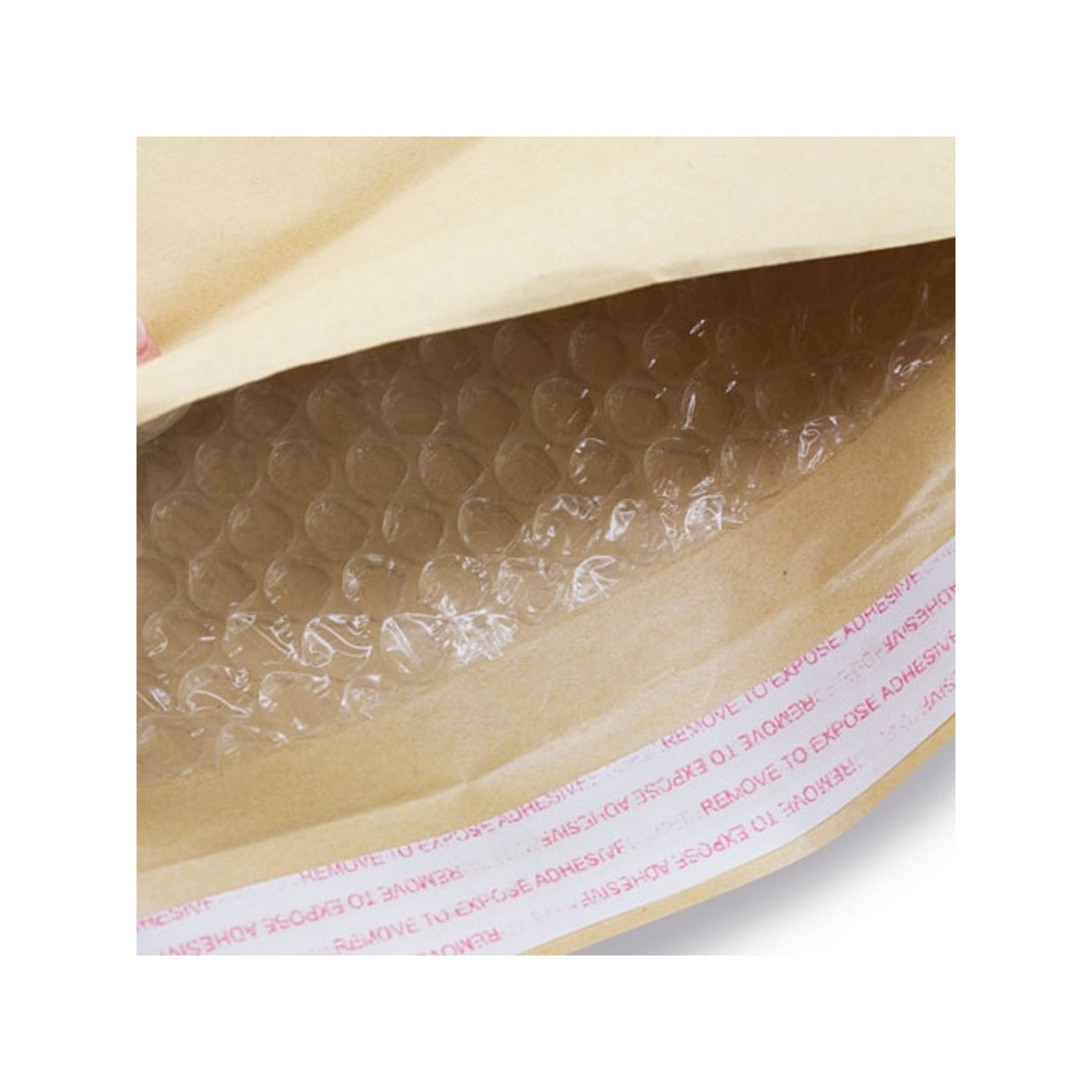 Sobre acolchado fabricado en papel kraft con interior de burbujas de aire para mayor protección. Cierre adhesivo seguro y superficie personalizable con logotipo, ideal para envíos y regalos promocionales