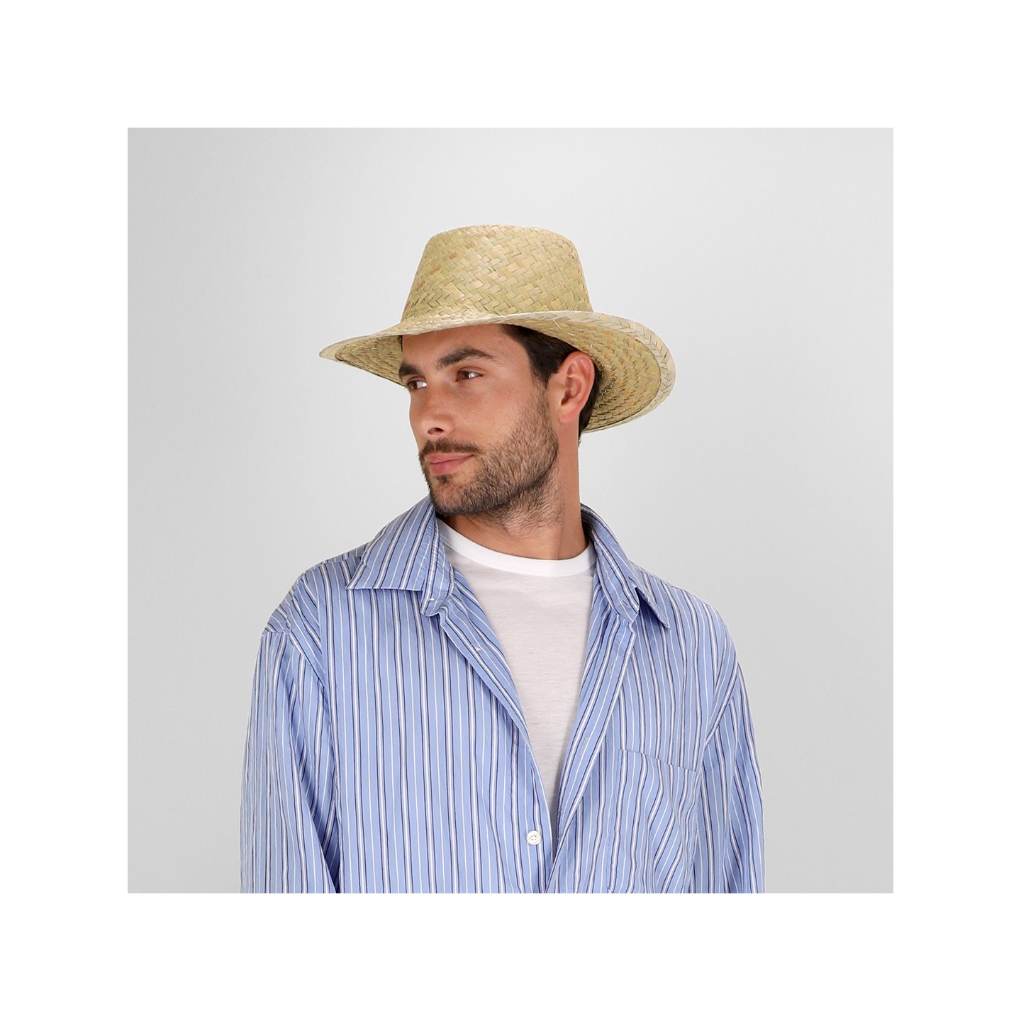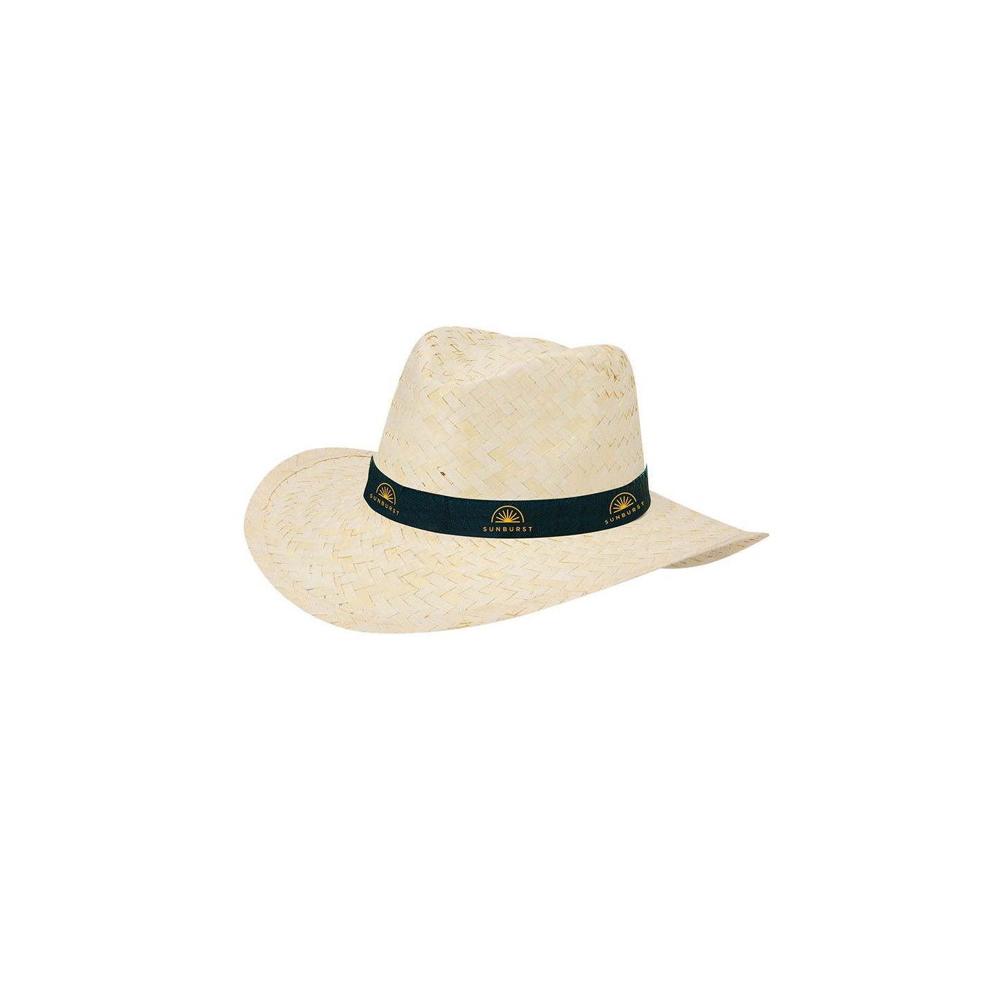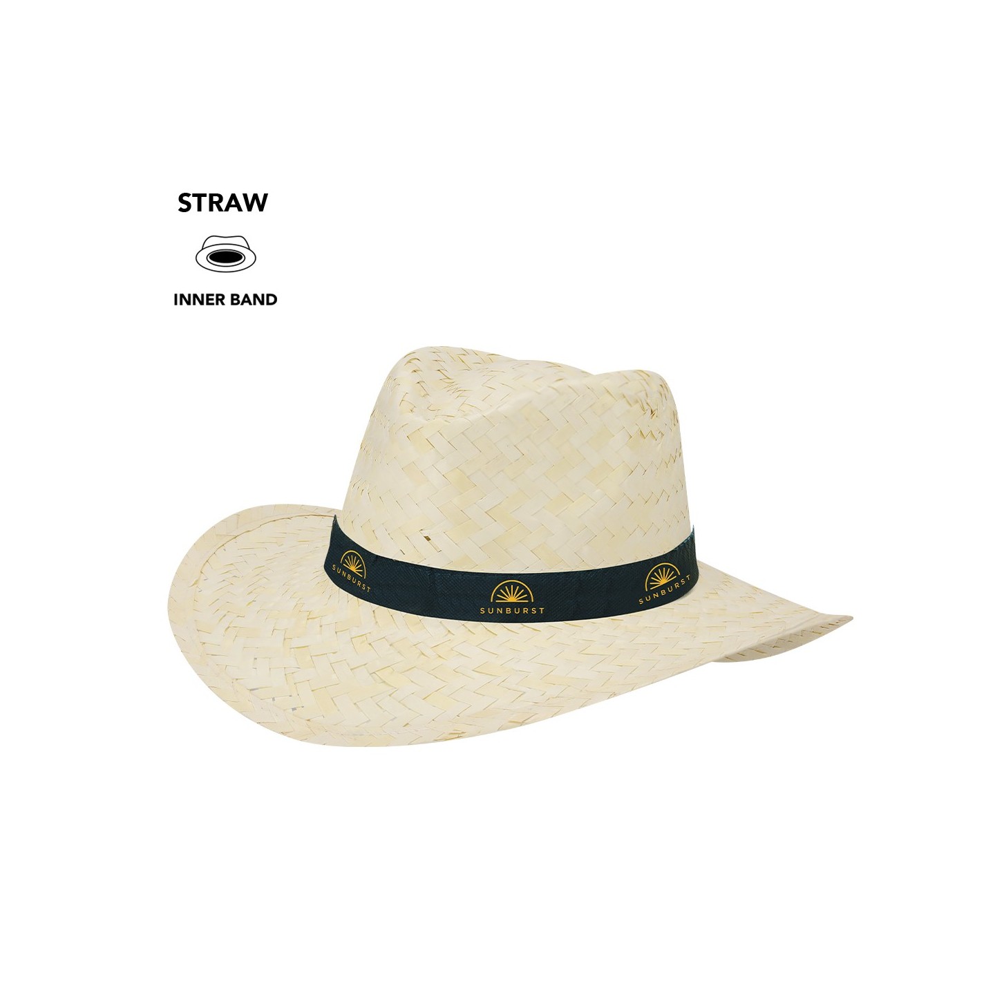 Sombrero de paja trenzada en blanco, ligero y cómodo, con cinta interior para mayor confort. Personalizable con tu logotipo, ideal para promociones o eventos.