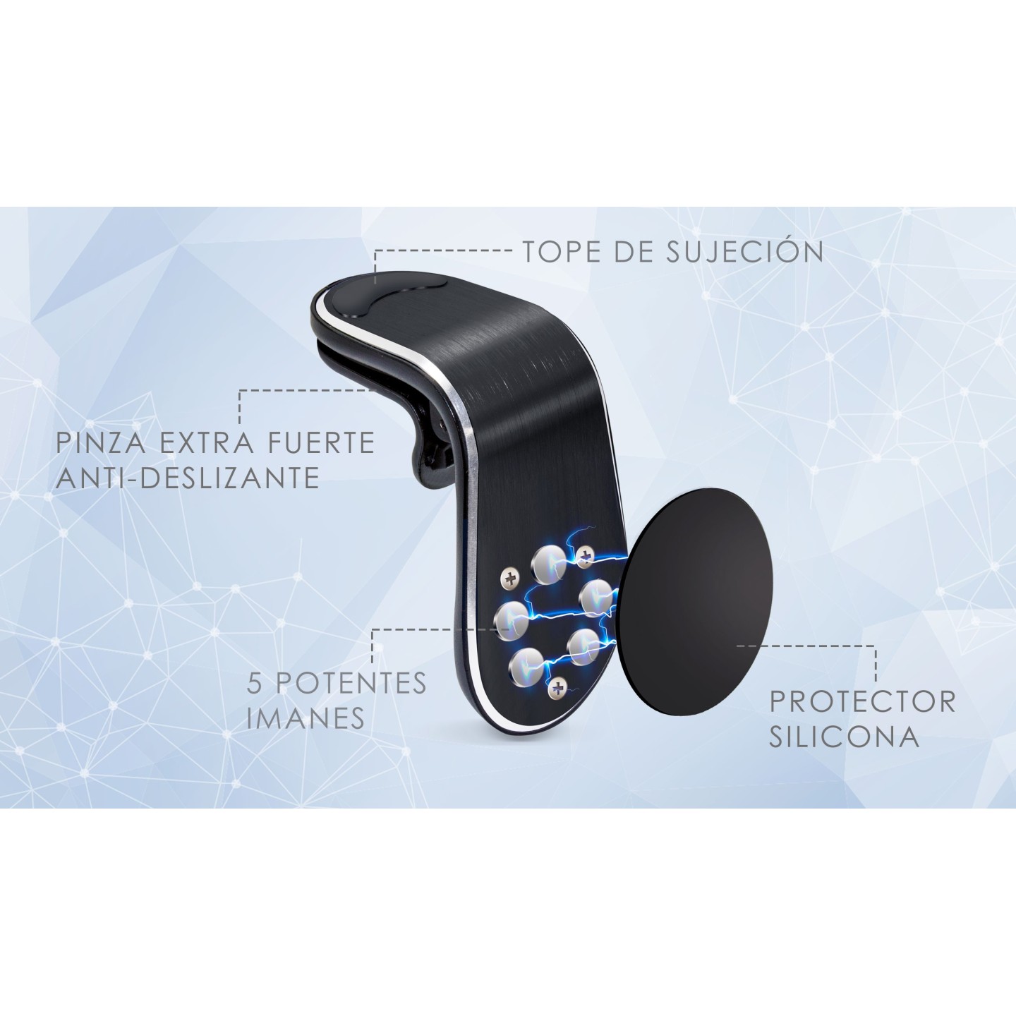 Soporte sujetamóvil de aluminio y plástico con sujeción segura, imanes potentes y protector de goma. Ideal para coche, oficina o hogar, brindando estabilidad y comodidad