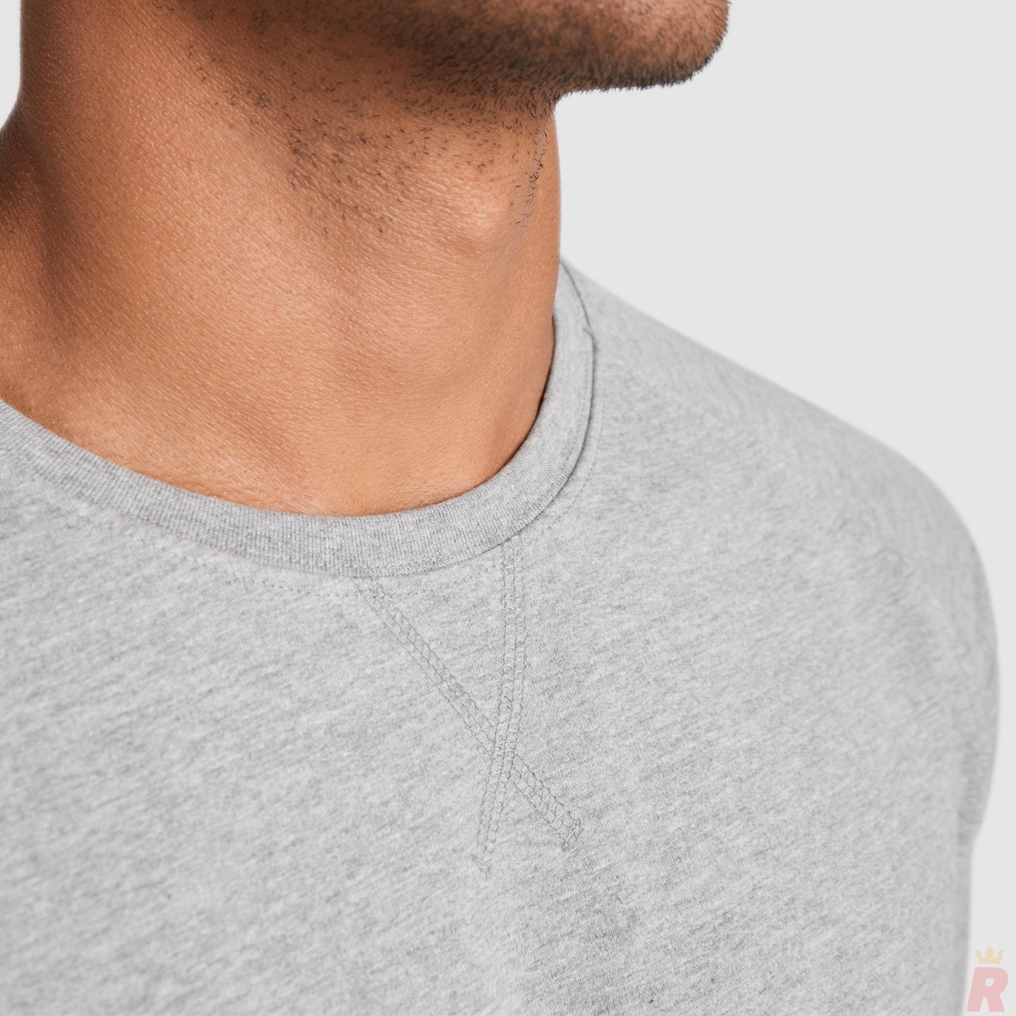 Los puños, cuello y cintura están confeccionados en canalé 1x1 para un ajuste cómodo y duradero. En el cuello redondo destaca un detalle cruzado en costuras remalladas que aporta carácter y refuerza la estética de la prenda. Además, el interior del cuello incluye cubrecosturas de refuerzo que garantizan una mayor resistencia y confort.