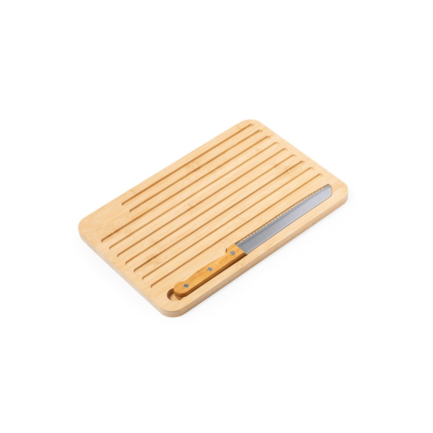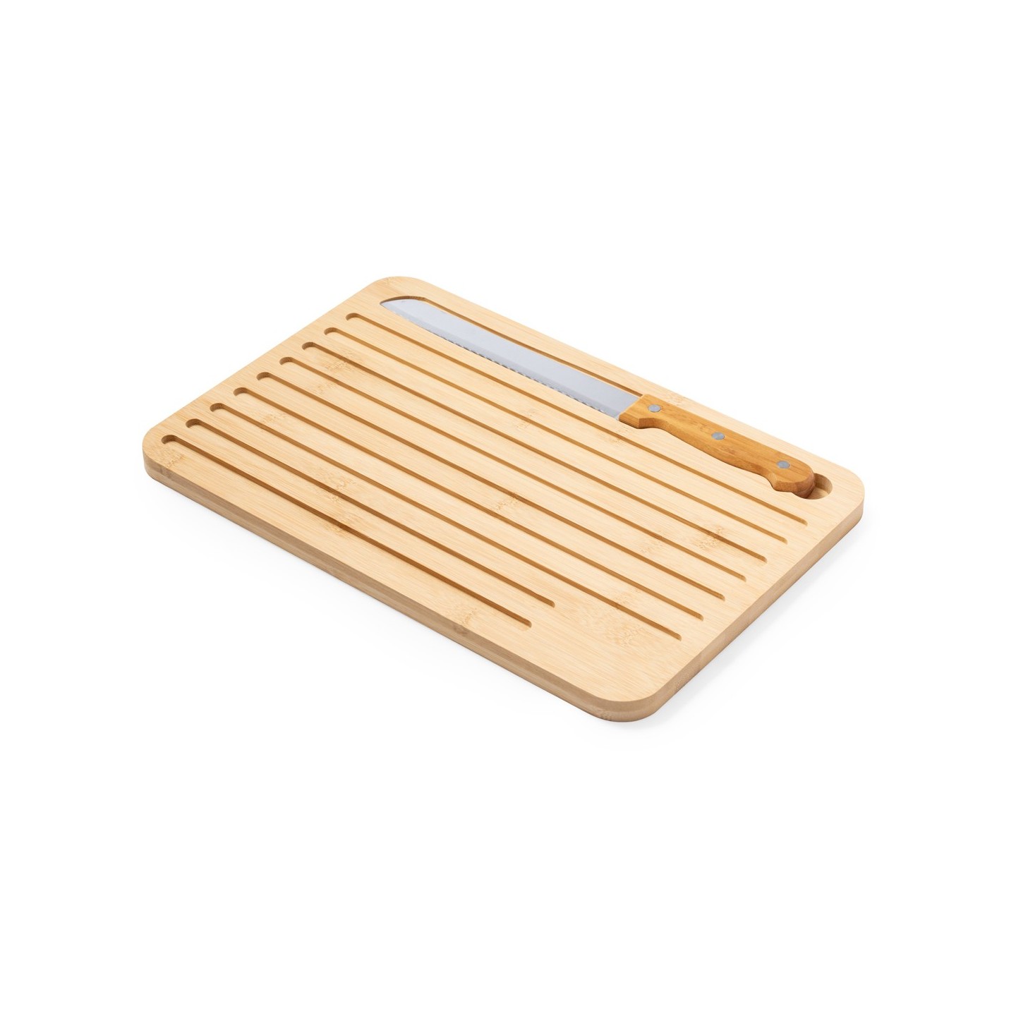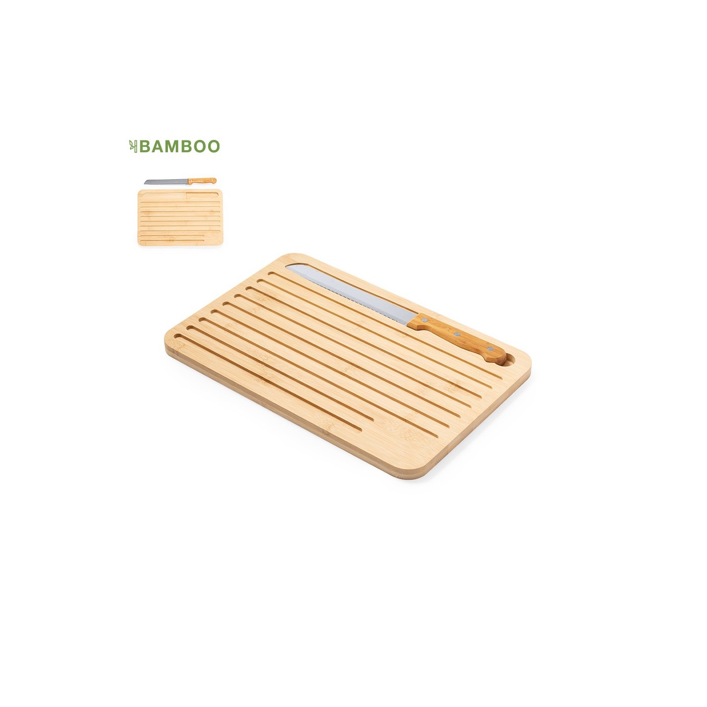 Tabla de cocina Myoria en bambú con cuchillo incluido. Diseño versátil con cara lisa y surcos grabados. Ideal para regalos personalizados.