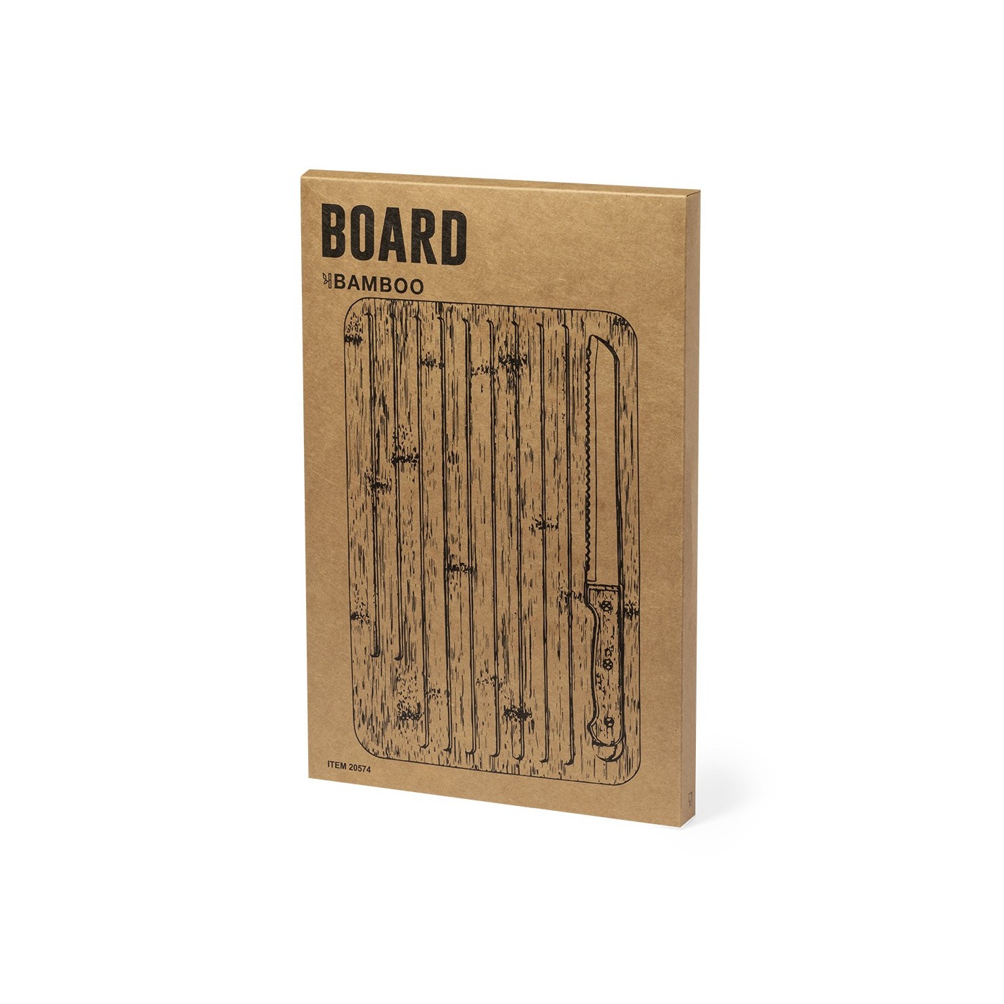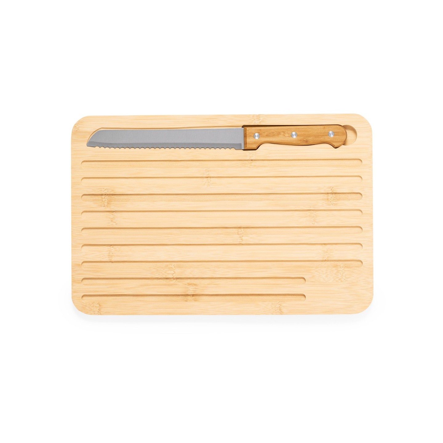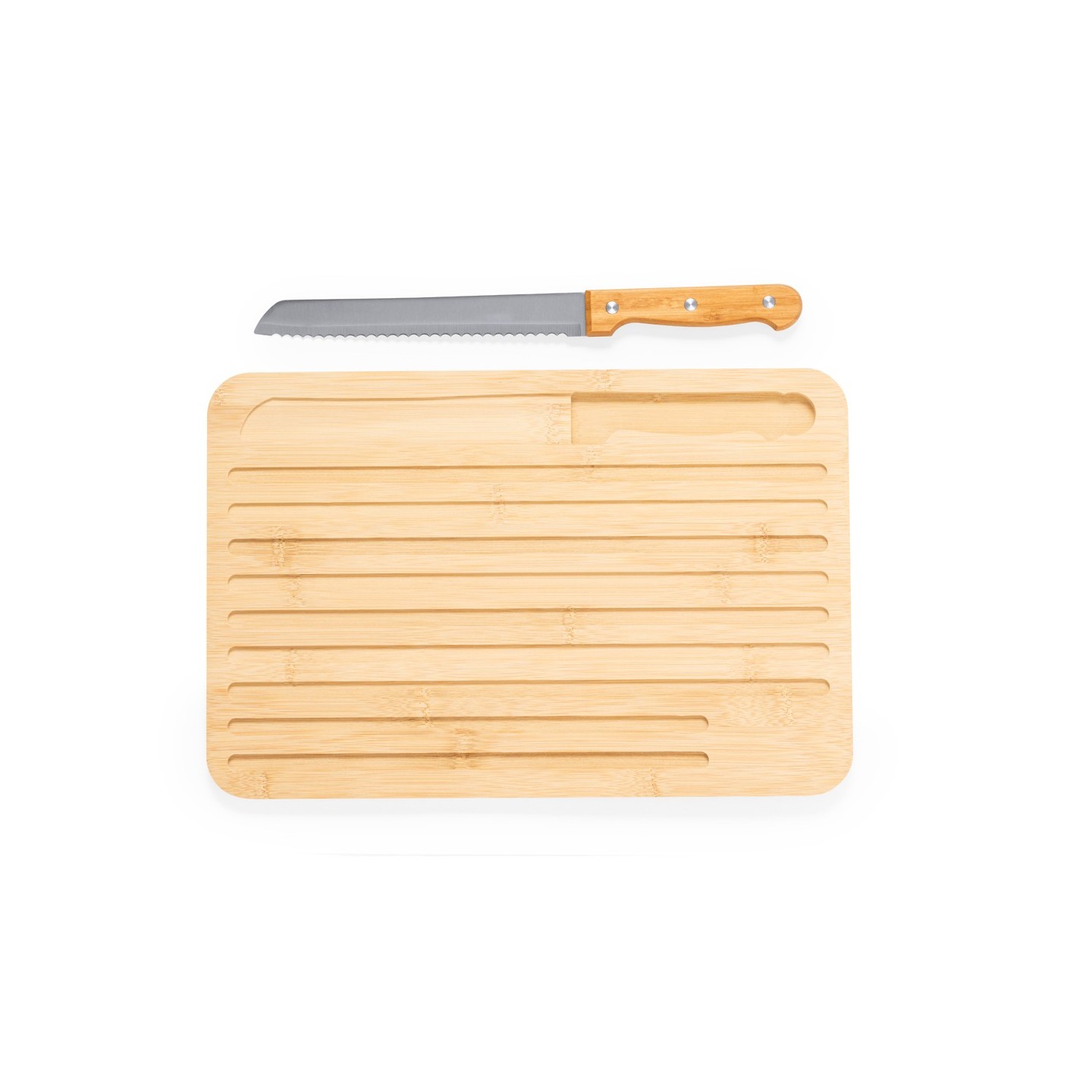 Tabla de cocina Myoria en bambú con cuchillo incluido. Diseño versátil con cara lisa y surcos grabados. Ideal para regalos personalizados.