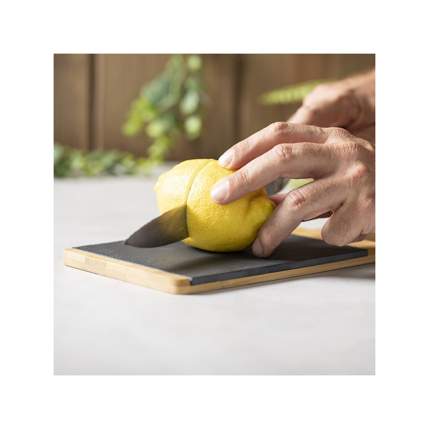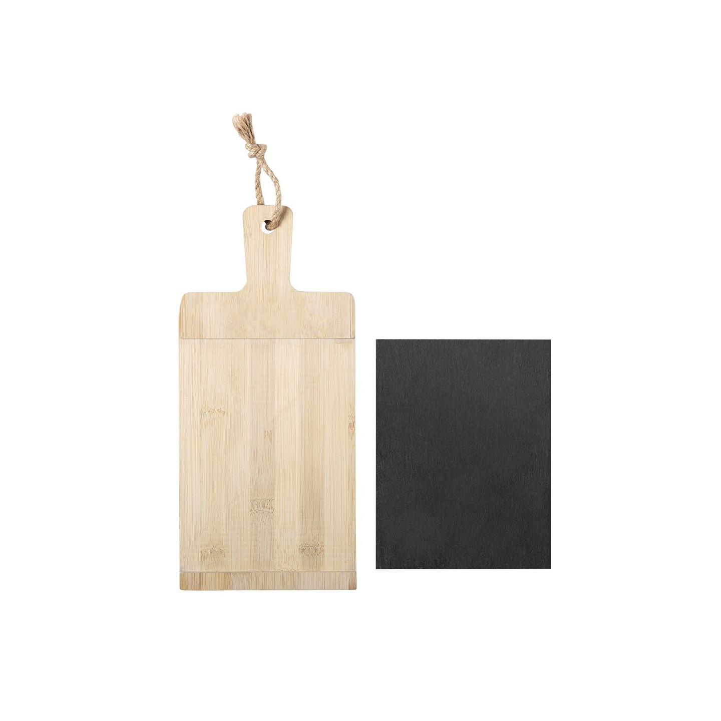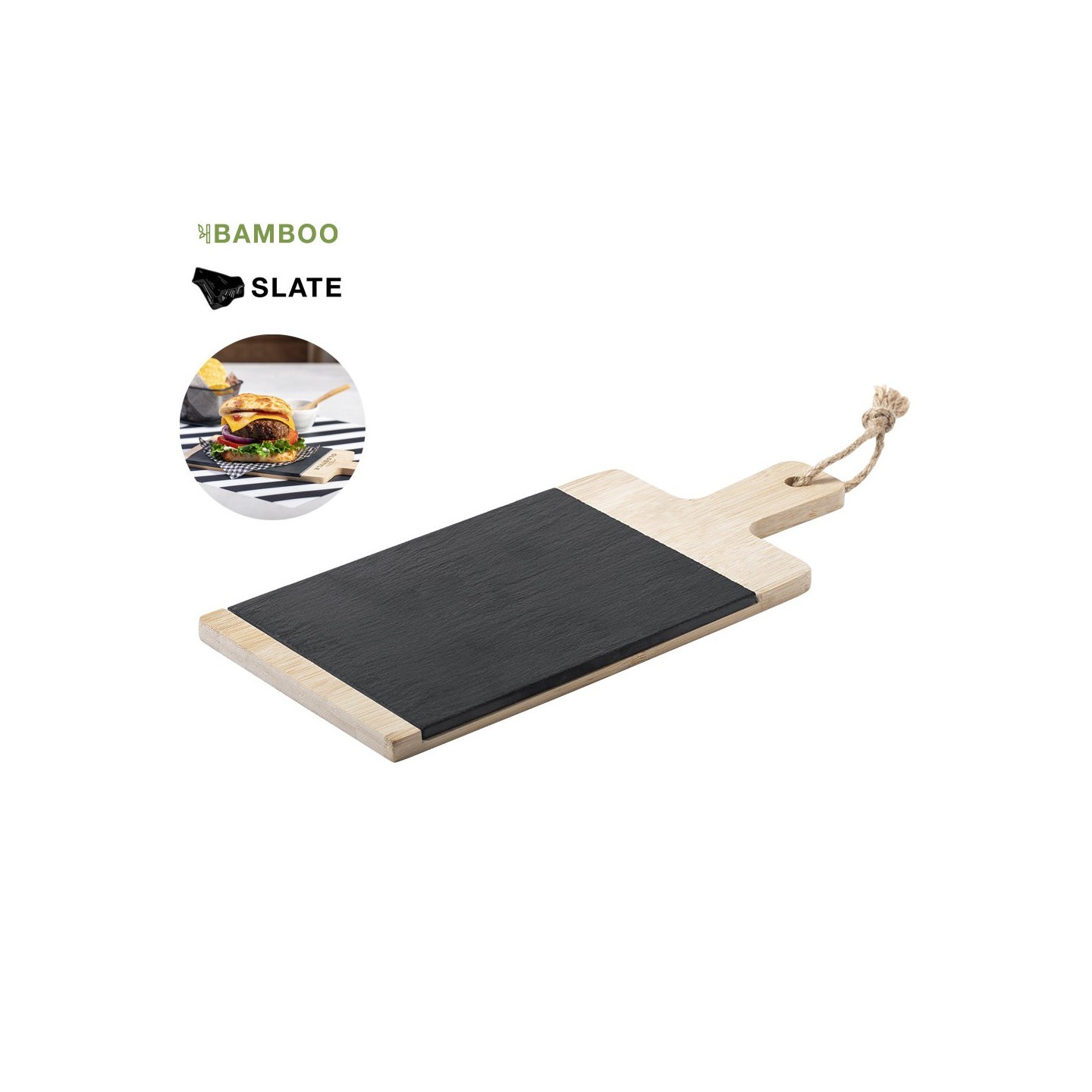 La Tabla Sisim es la combinación de bambú y pizarra para corte y presentación. Acabado pulido, asa, cordón y tabla de pizarra extraíble. ¡Elegancia funcional en tu cocina!