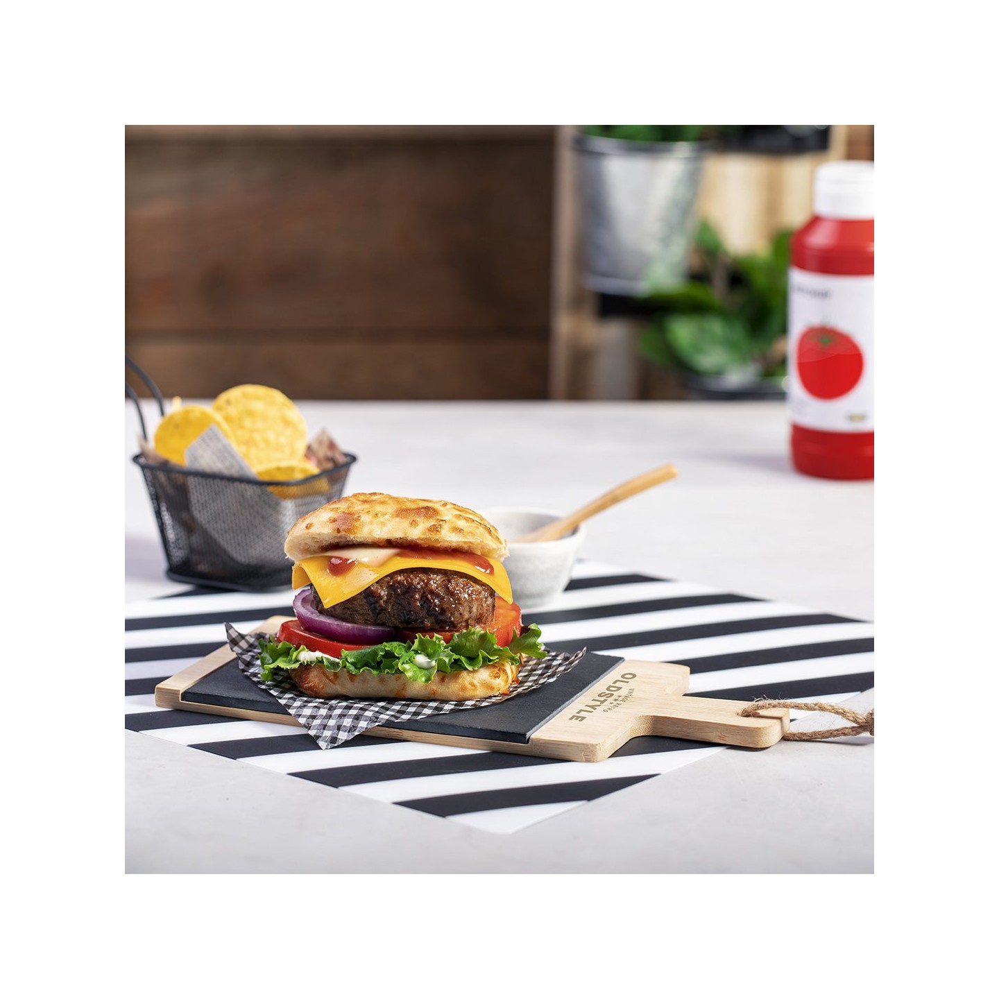 Esta tabla combina los materiales de bambú y pizarra, creando una fusión única de funcionalidad y estilo. La superficie de bambú, con su suave y resistente acabado pulido, proporciona un área ideal para el corte y la presentación de tus alimentos.