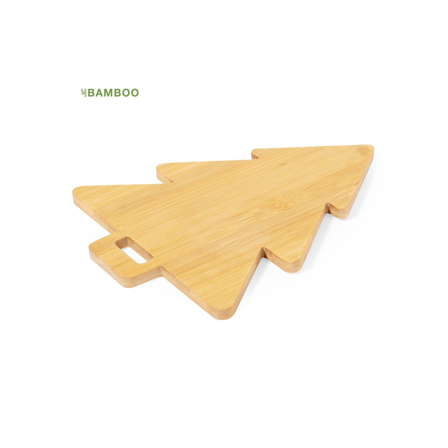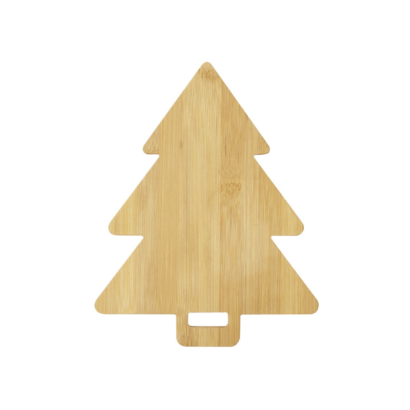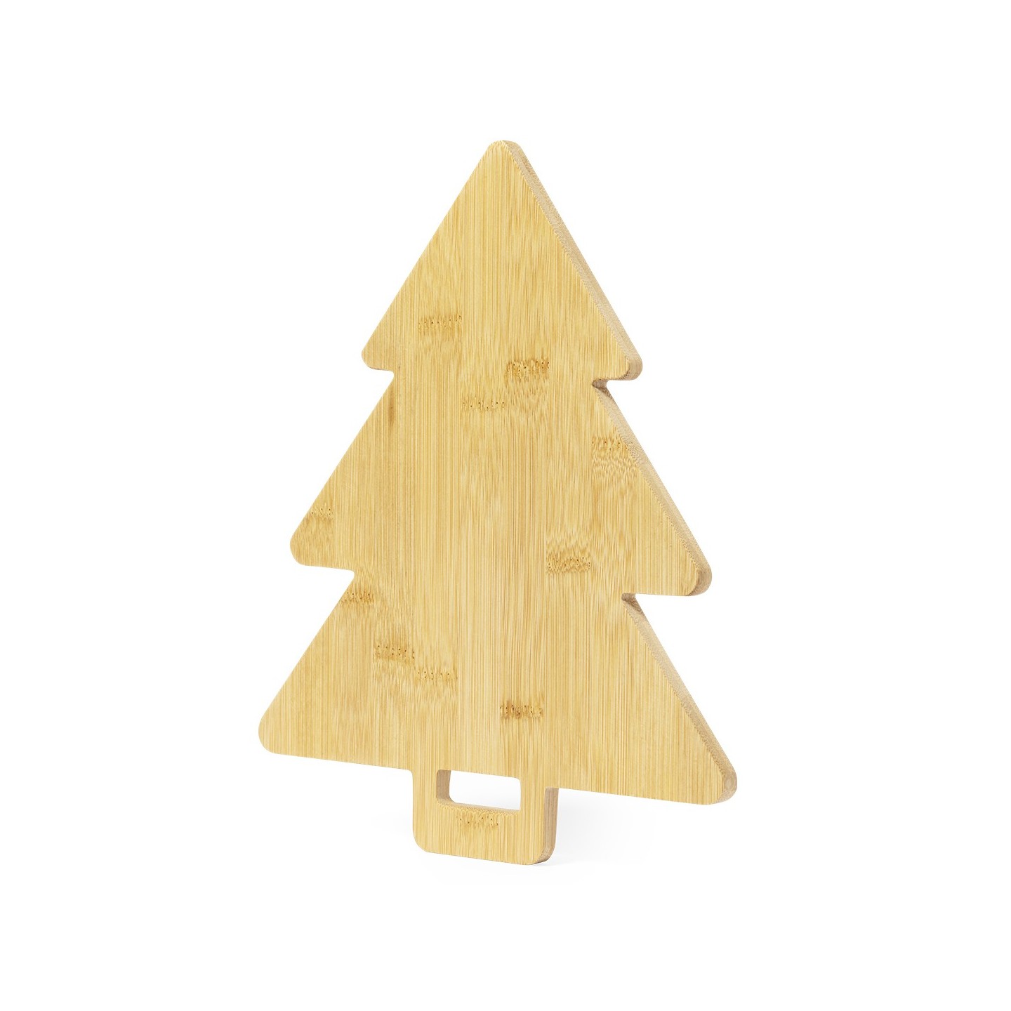 Tabla de cocina en forma de árbol de Navidad, fabricada en bambú con asa troquelada para fácil manejo. Personalizable con logotipo. Sostenible y elegante.