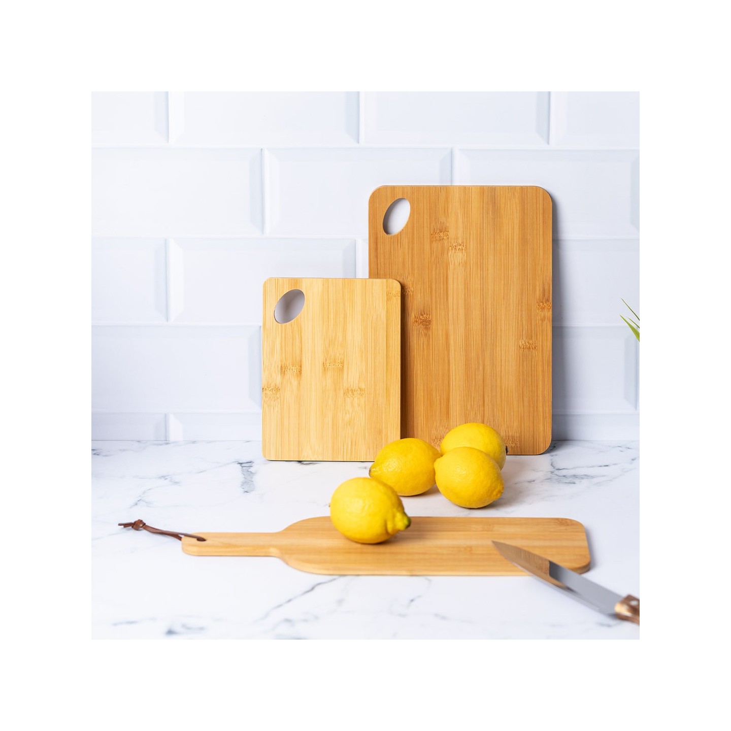 El bambú, conocido por su resistencia y durabilidad, es un material sostenible que se renueva rápidamente, lo que lo convierte en una opción respetuosa con el medio ambiente. Además, su superficie pulida y lisa es ideal para cortar alimentos sin dañar ni desgastar tus cuchillos.