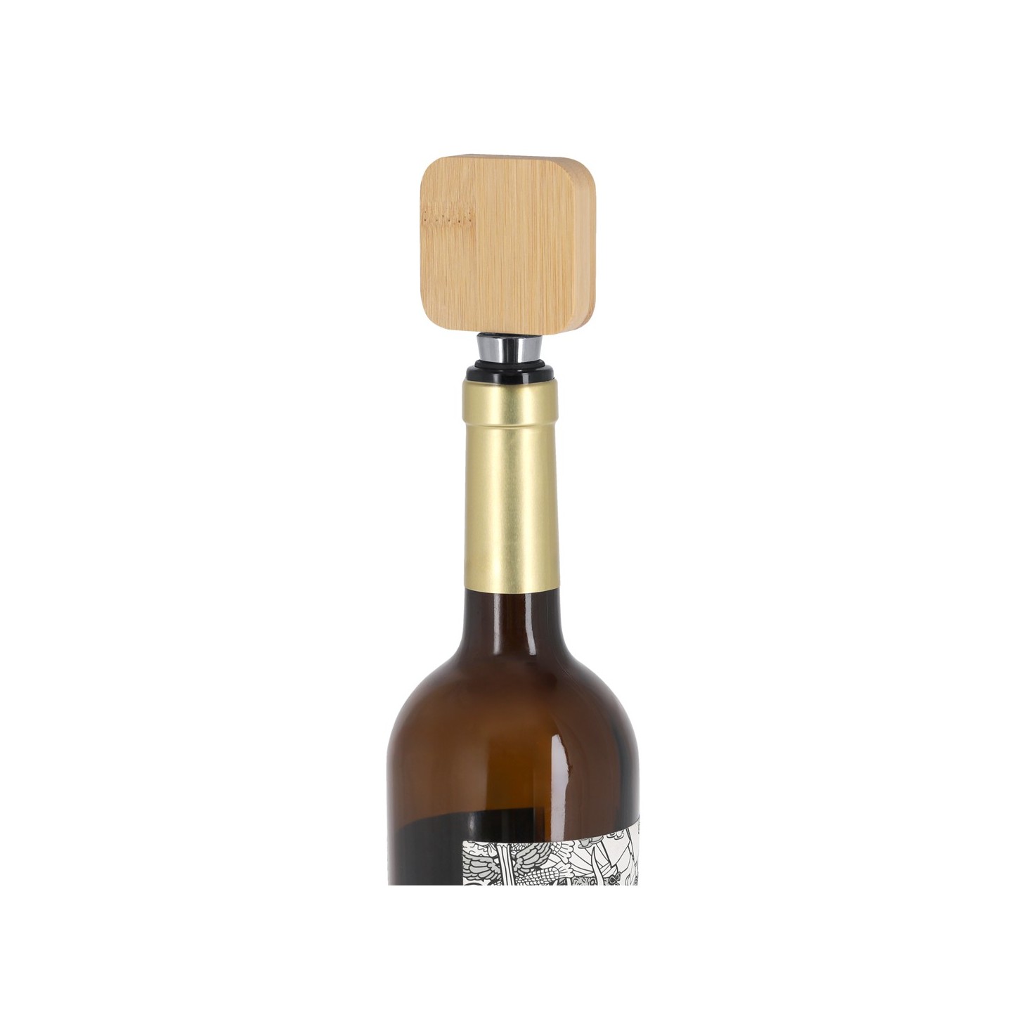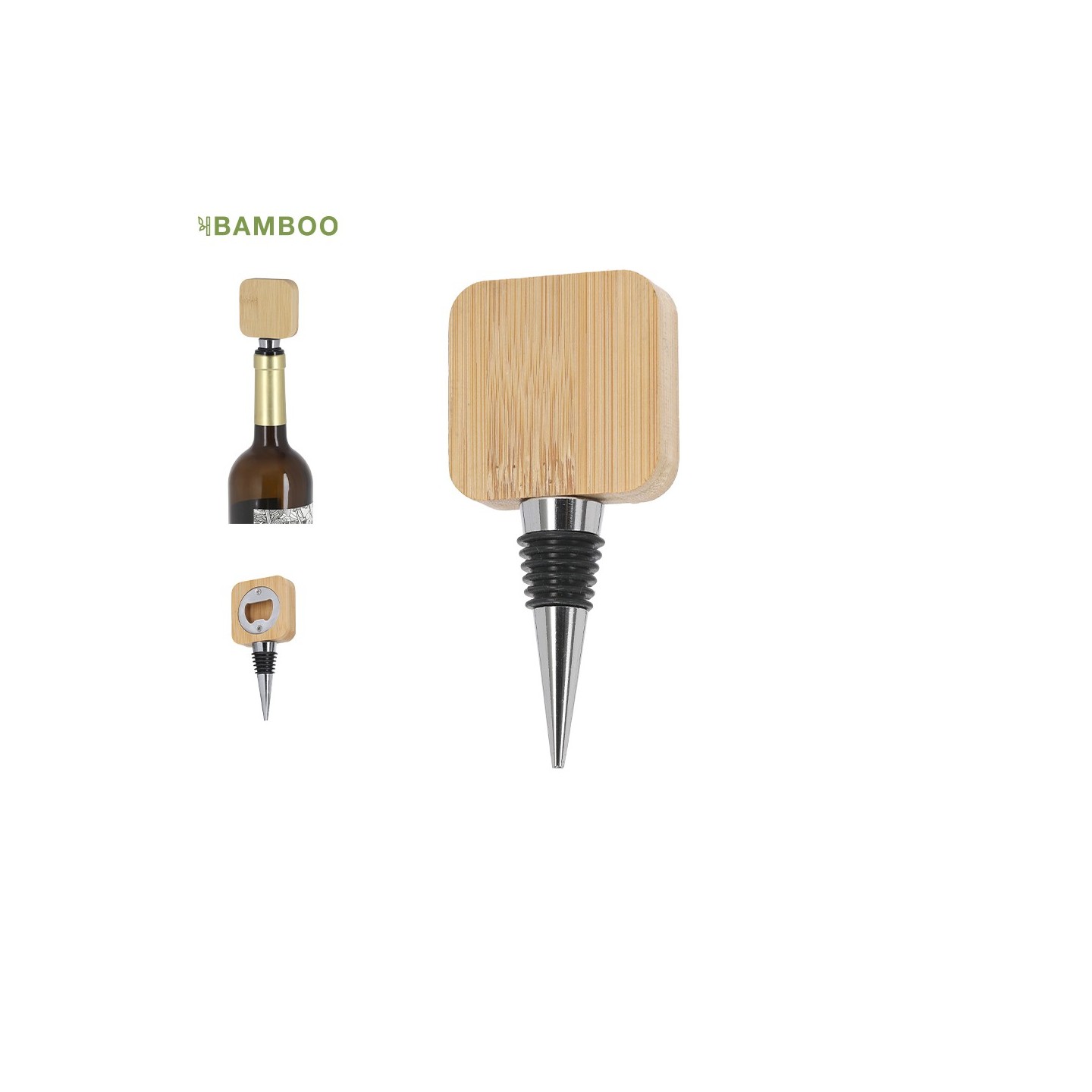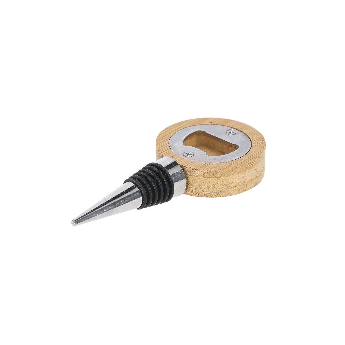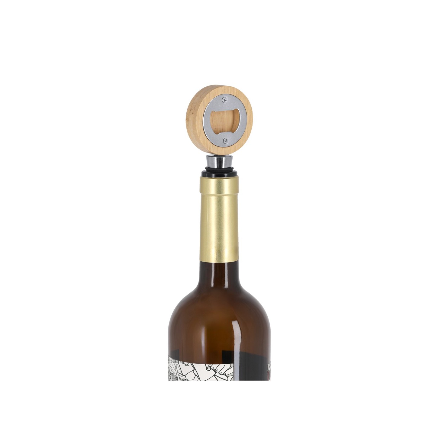 Tapón para botellas con abridor integrado, hecho de bambú y acero inoxidable. Incluye aros de silicona para ajuste perfecto. Ecológico y personalizable, ideal para regalos promocionales.