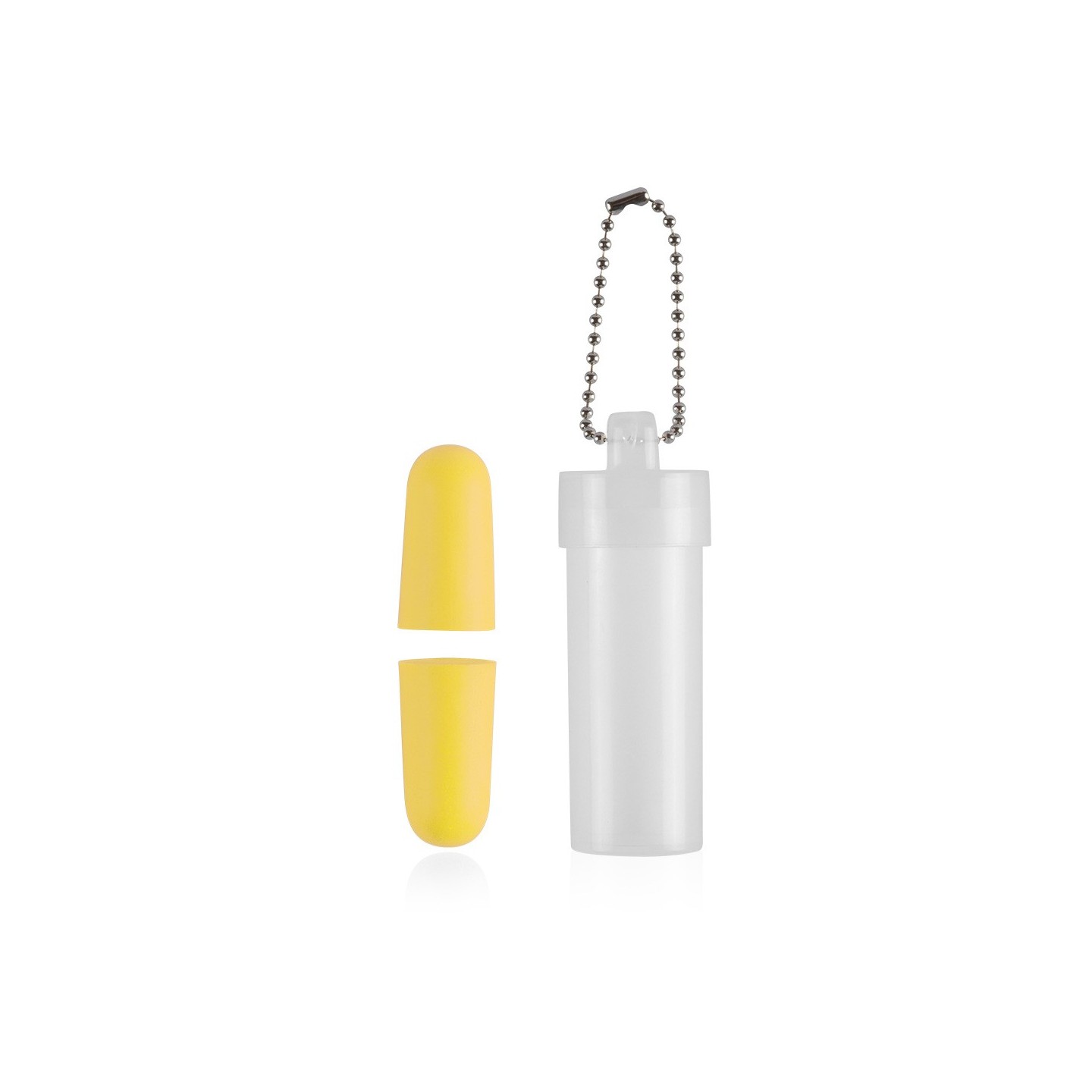 Tapones para oídos en EVA con estuche transparente. Cómodos y de vivos colores. Incluye cadena para transporte.