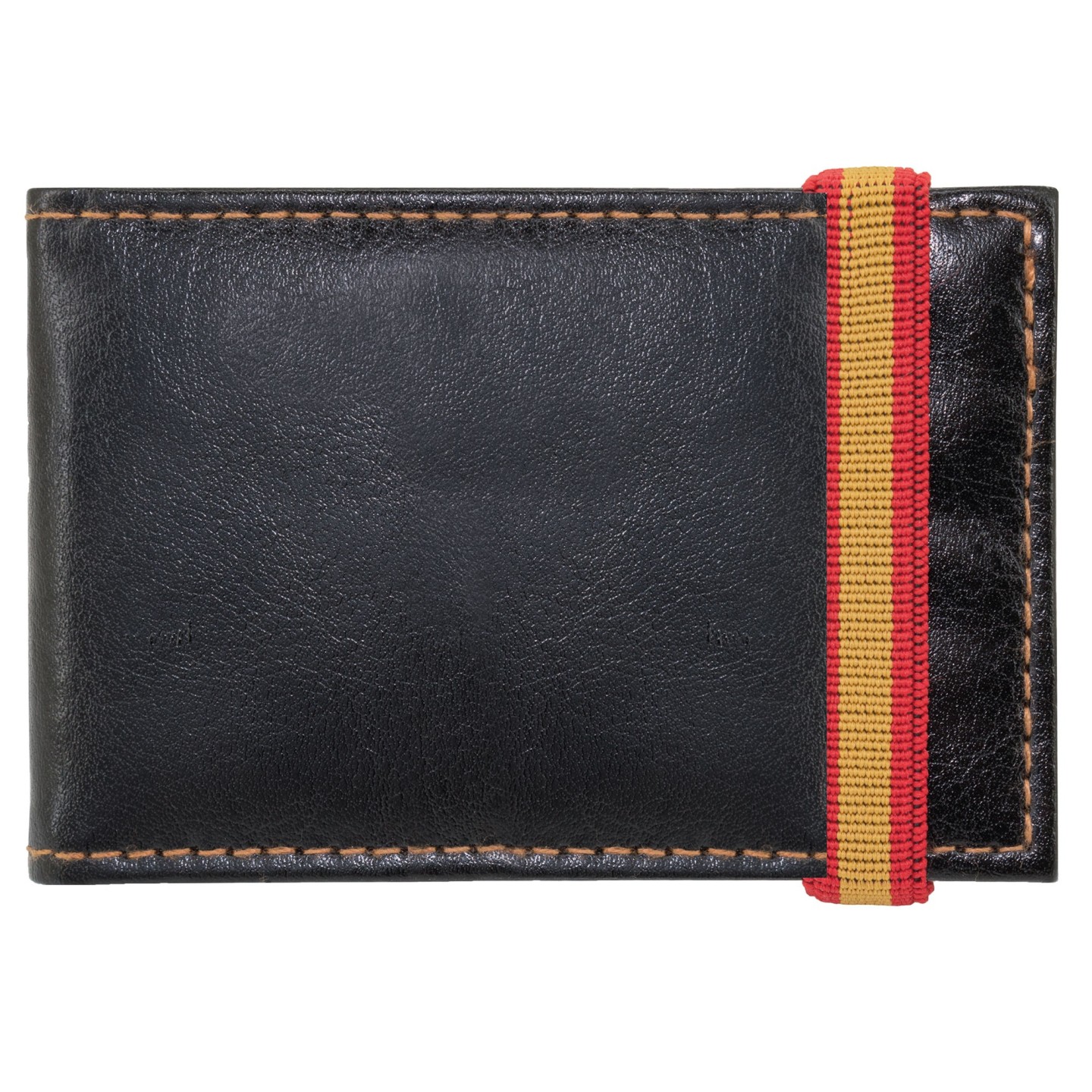 El Tarjetero Elástico LONDRES Bandera España es elegante y compacto, con una banda elástica en rojo y amarillo y costuras marrones, ideal para organizar tarjetas