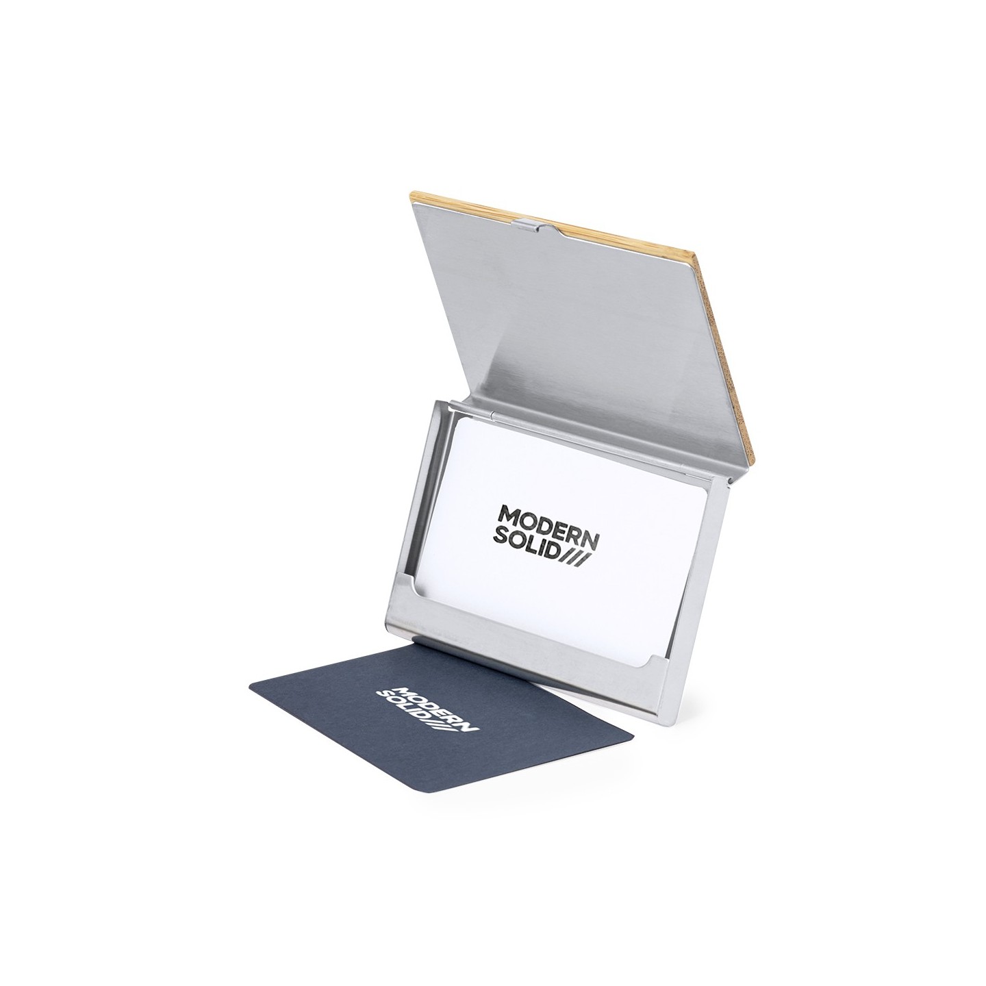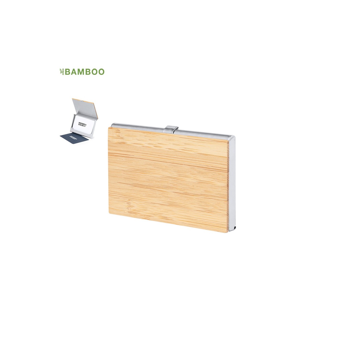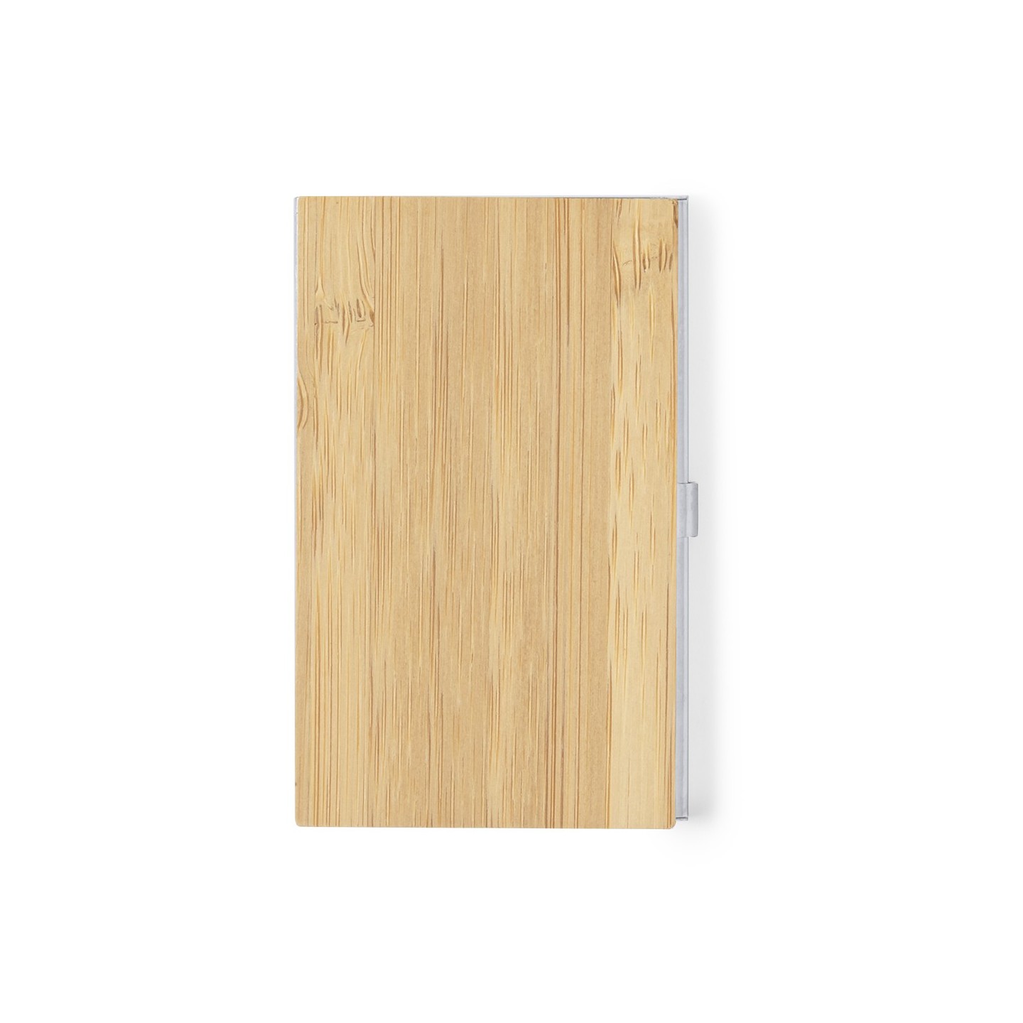 Elegante tarjetero fabricado en suave bambú, con tapas duras y cierre de presión. Destaca el detalle de bambú en la parte frontal y cuenta con un compartimento interior para almacenar tarjetas. Presentado en una bolsa individual de papel reciclado.