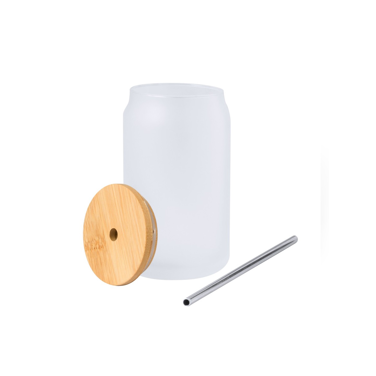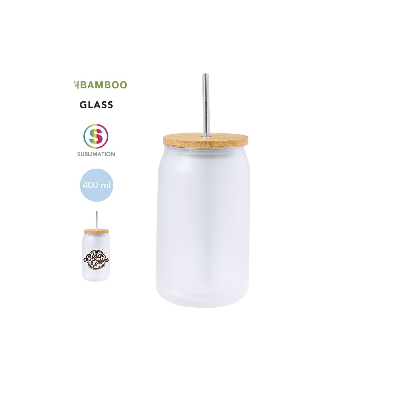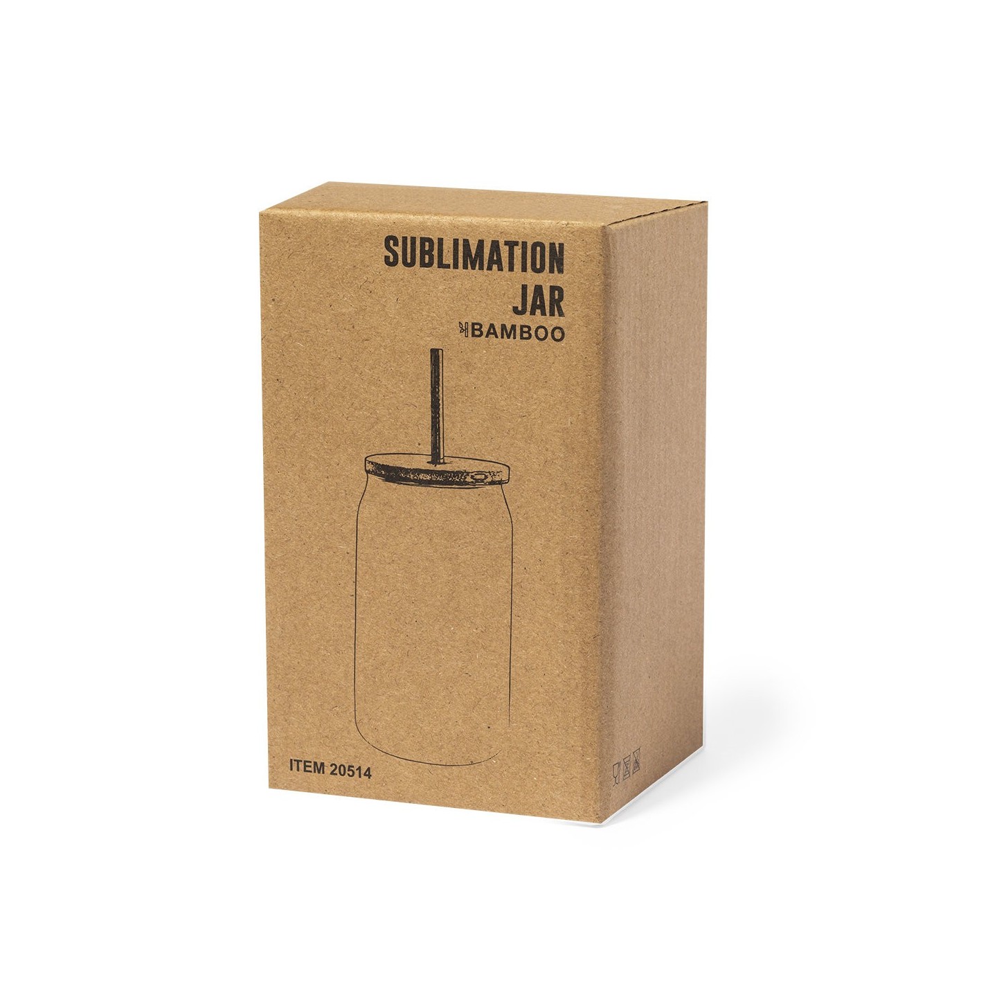El Tarro Sublimación Fonix es de cristal mate de 400 ml con tapa de bambú y pajita. Ideal para sublimación. Presentado en caja kraft."