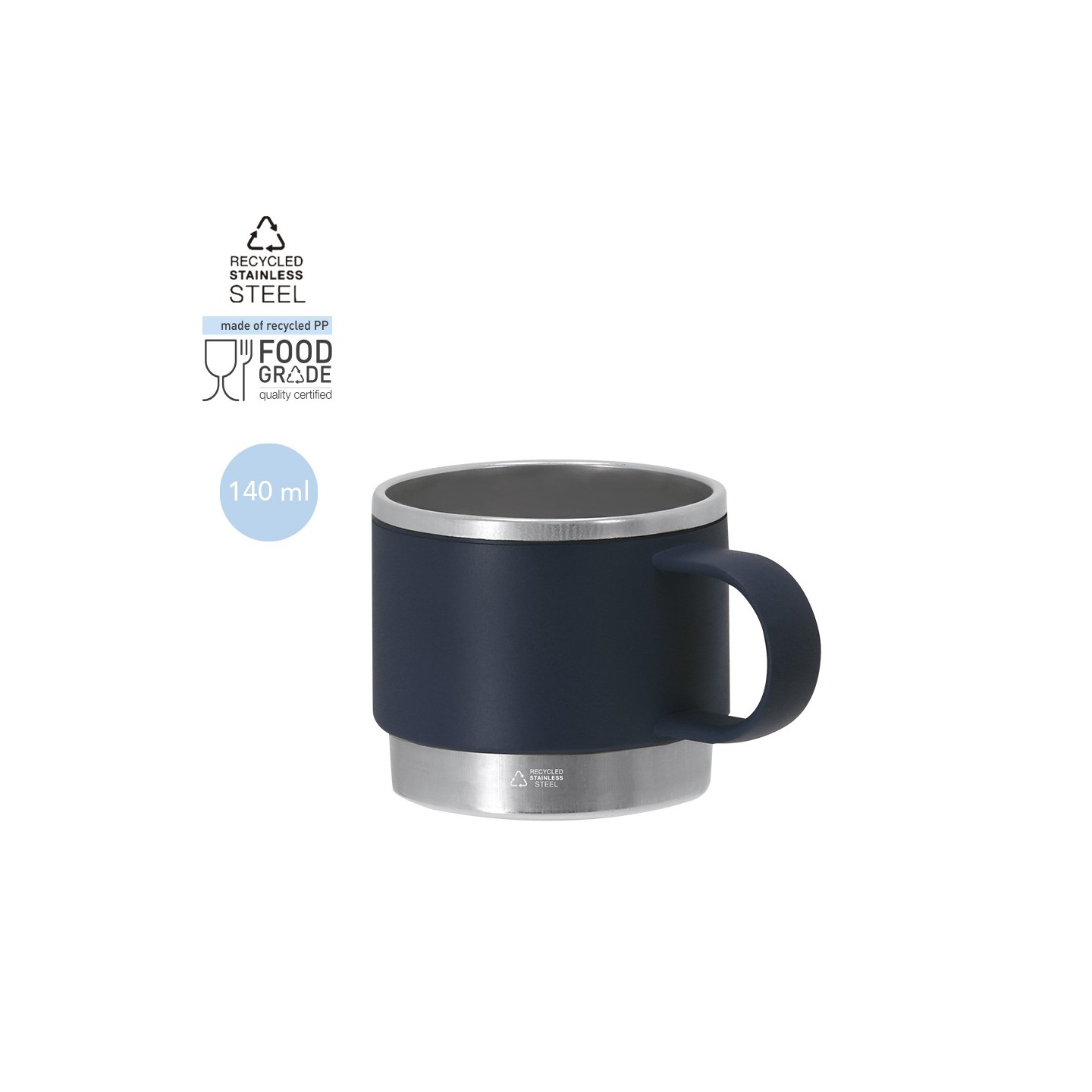Taza ecológica de PP reciclado con base y borde de acero inoxidable reciclado. Capacidad de 140 ml. Personalizable con tu logotipo para un regalo sostenible.