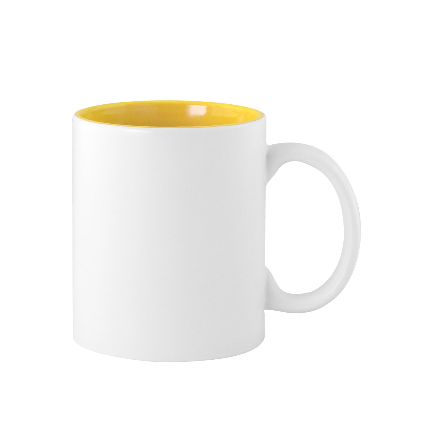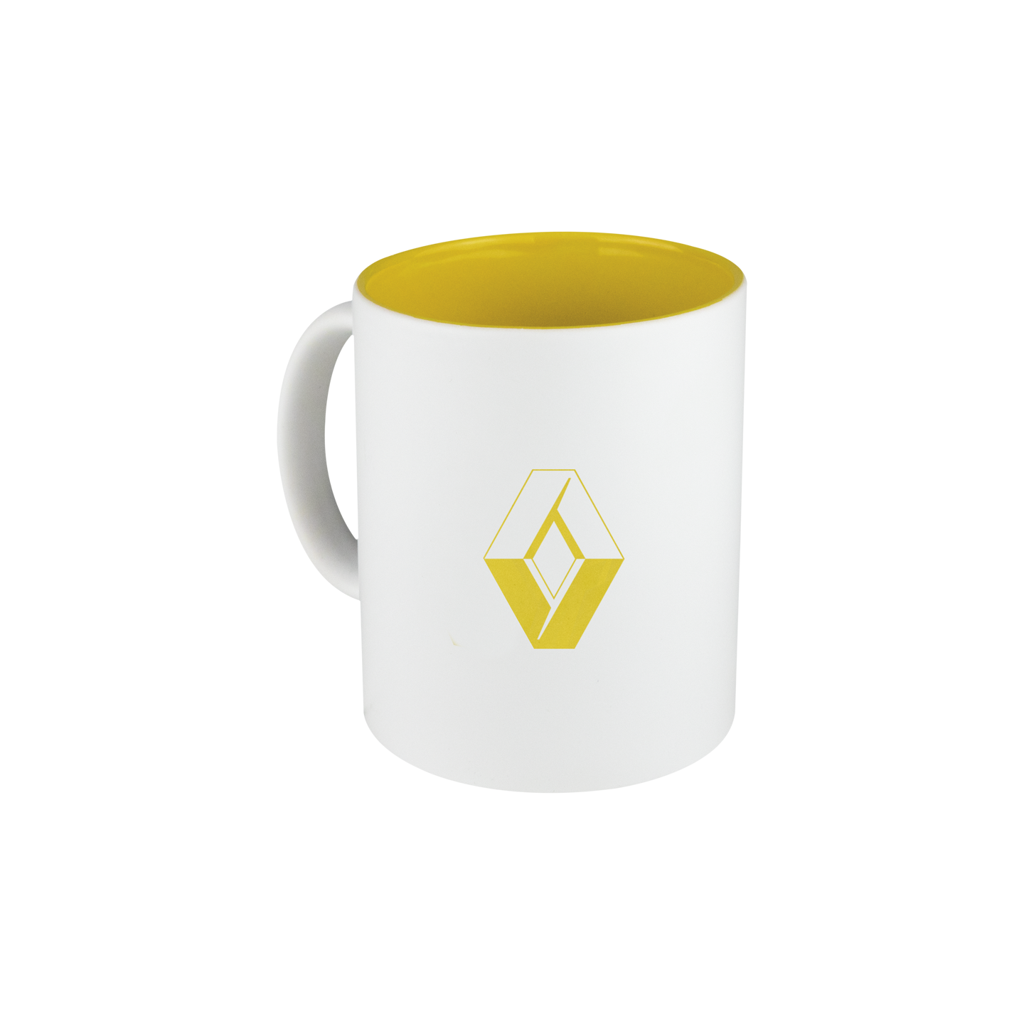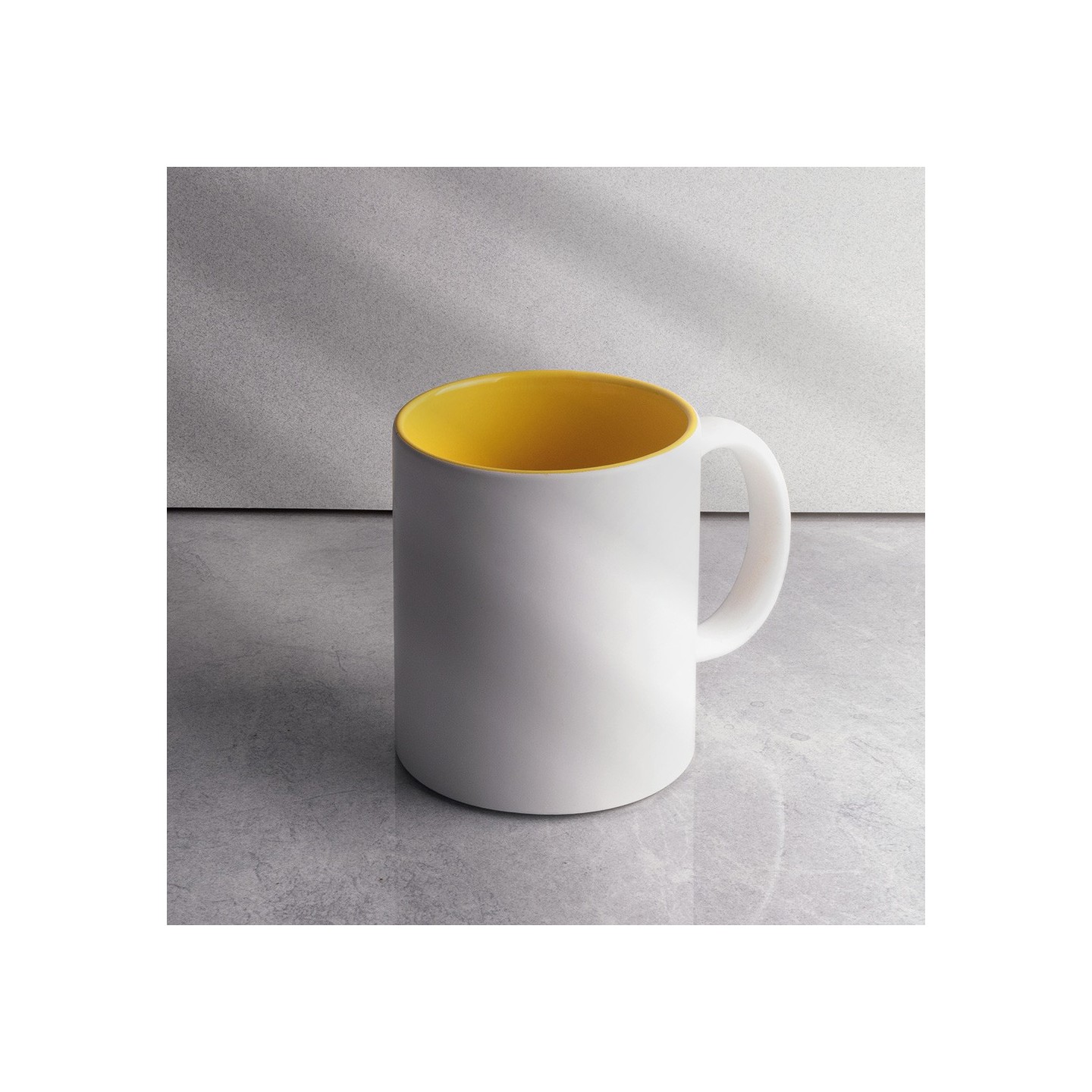 Taza Graven fabricada en cerámica con un volumen de 350 ml, exterior blanco e interior vibrante. Perfecta para marcaje láser. Certificada LFGB. Un toque de estilo para tu empresa.