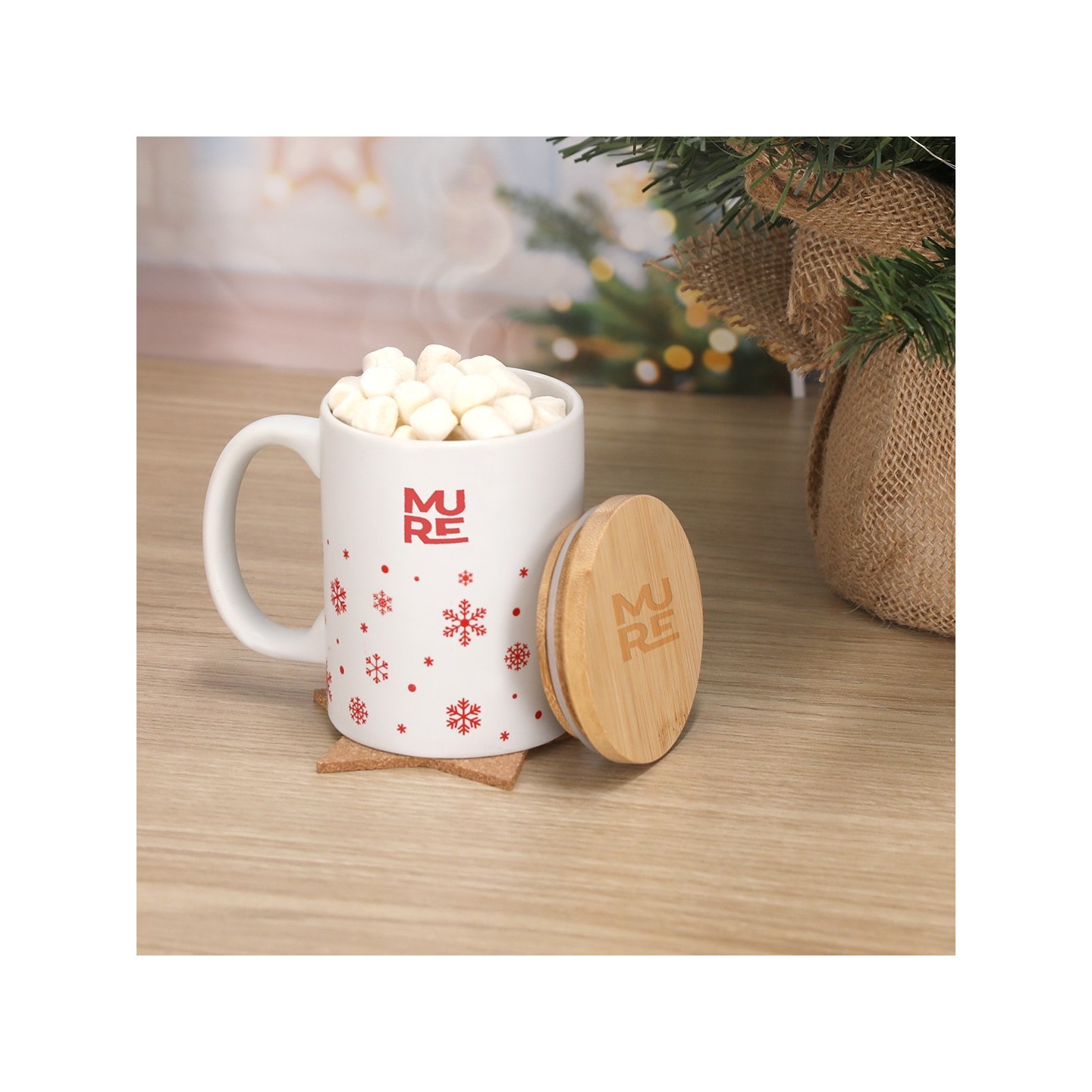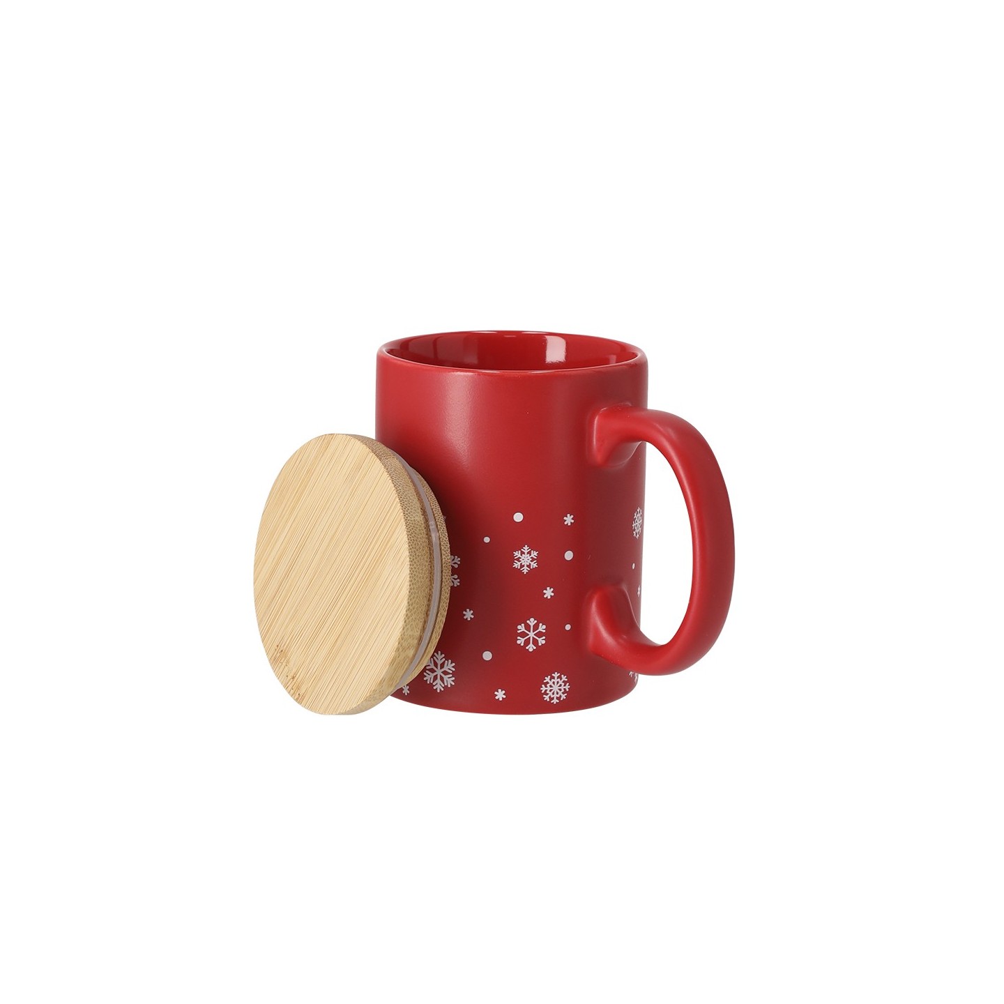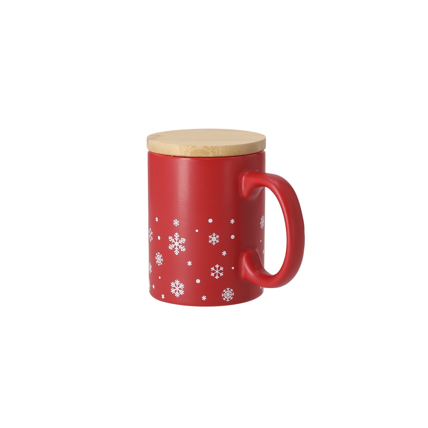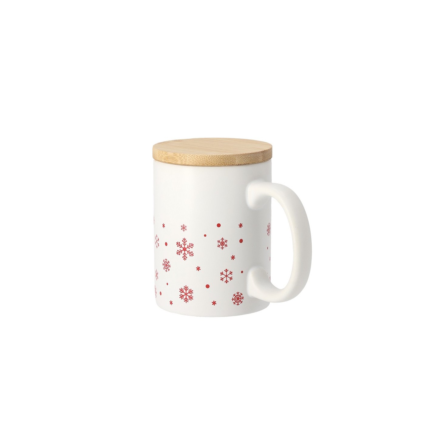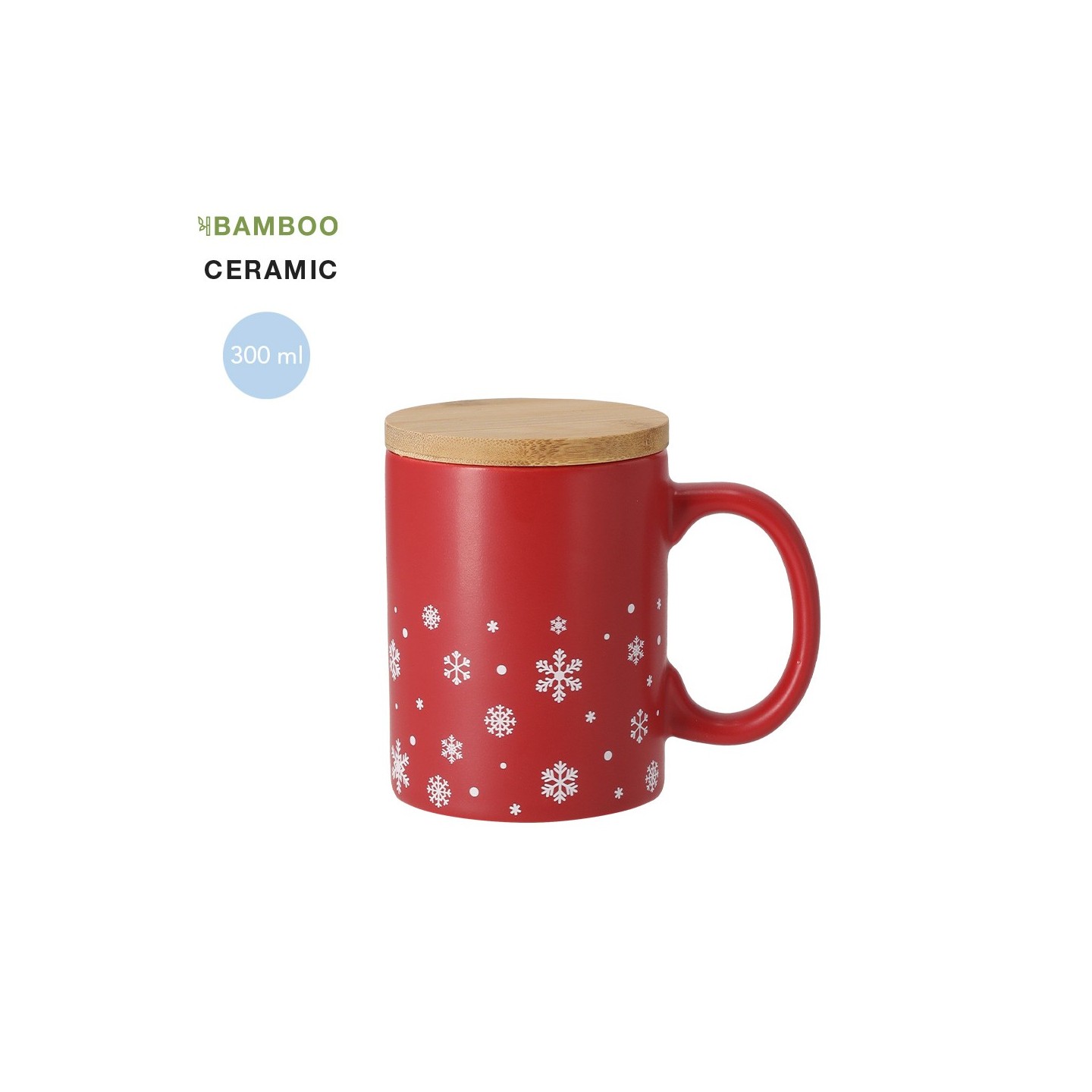 Taza de cerámica de 300 ml con diseño navideño de copos de nieve, disponible en rojo y blanco mate. Incluye tapadera de bambú, personalizable con logotipo.