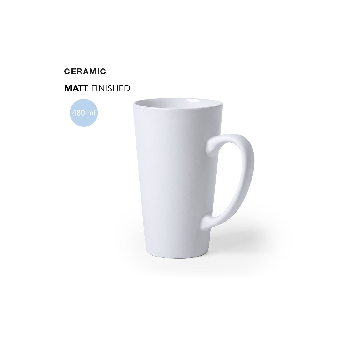La Taza Korpus es de cerámica con acabado mate, 480 ml. Diseño alargado y asa maxi. Presentada en caja. Moderna y cómoda, ideal para regalos o uso empresarial.
