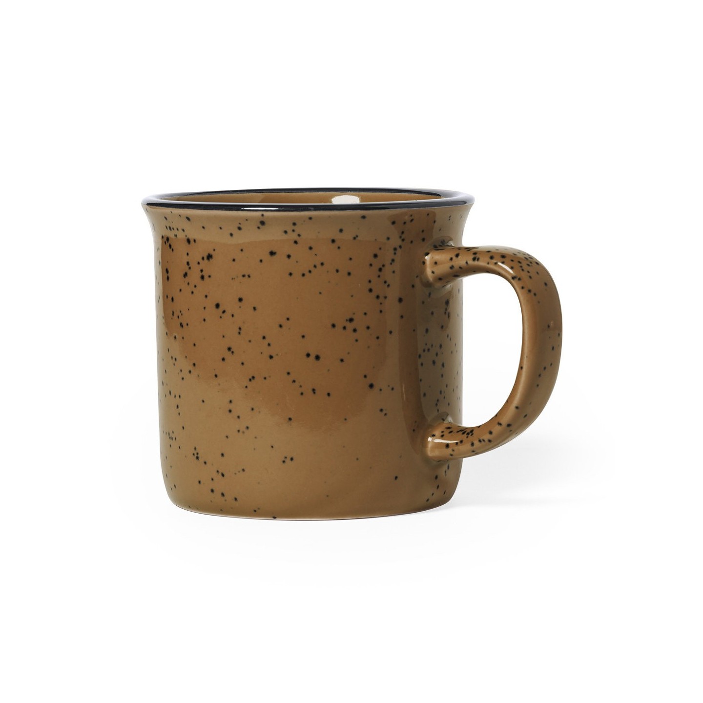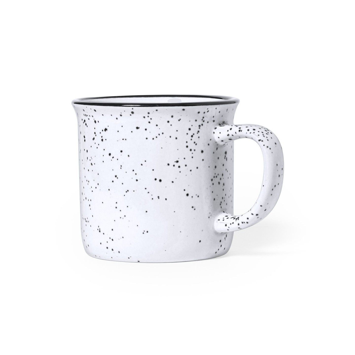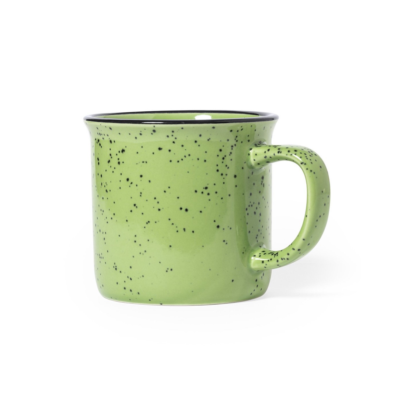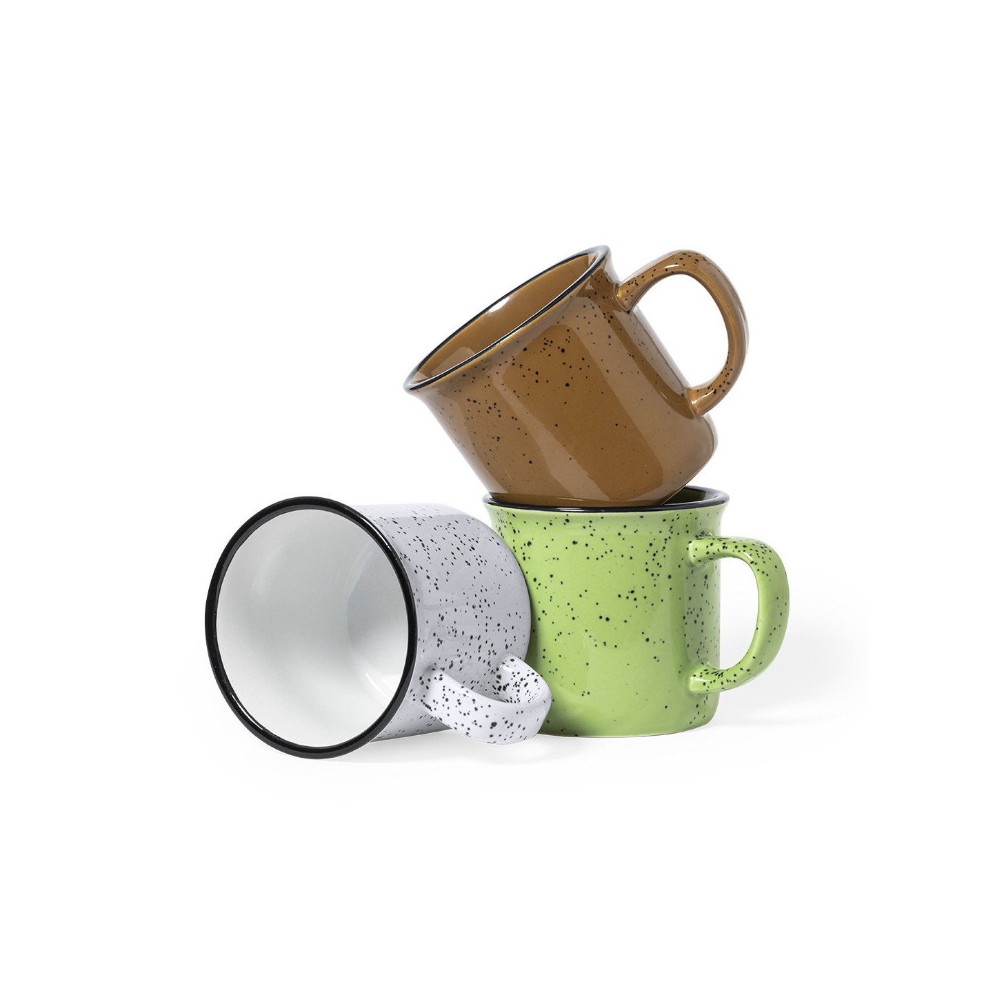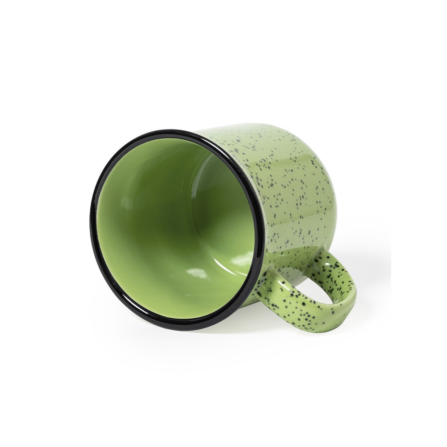 Su exterior presenta una estética moteada en distintos colores, lo que le confiere un aspecto original y llamativo. El interior de la taza está cuidadosamente diseñado para combinar a juego con el color del exterior, acentuado por un borde negro que añade un toque de elegancia.