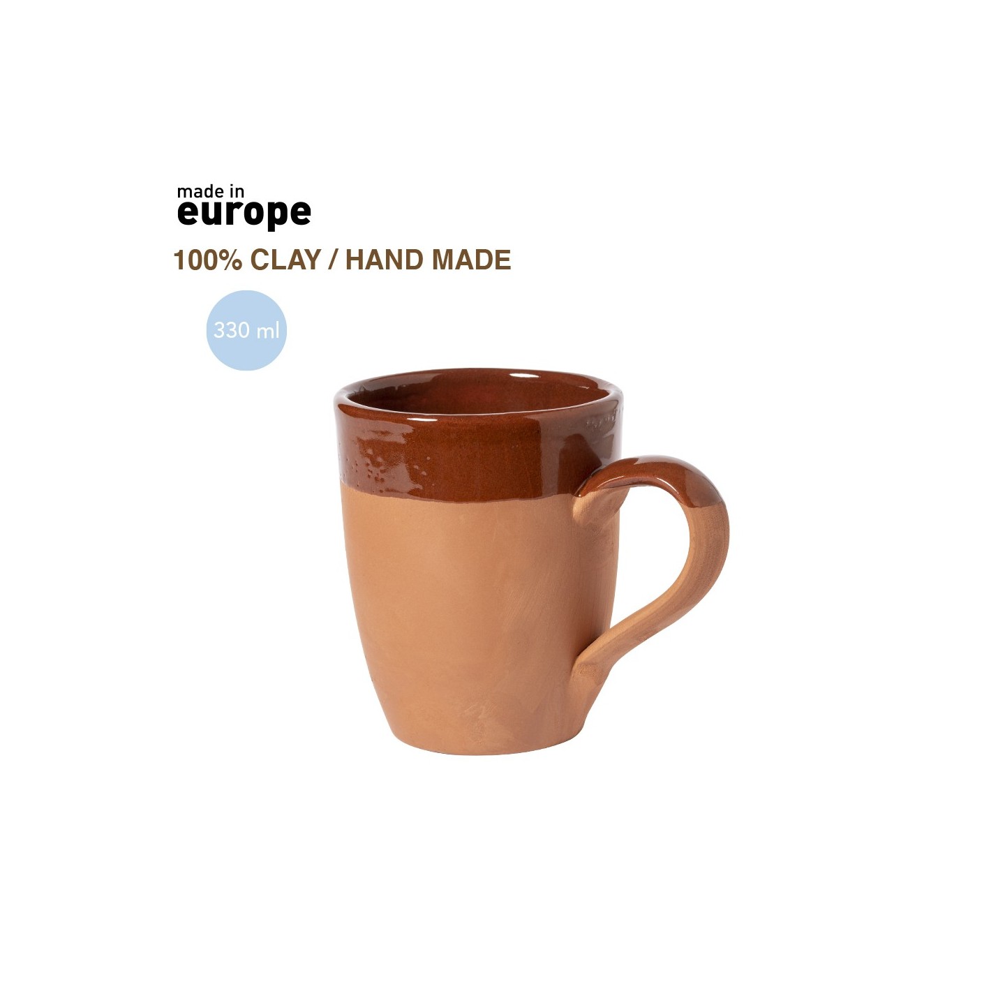 La taza Lixus tiene diseño clásico y curvado de 330 ml en barro, una opción sostenible y altamente reciclable. Fabricación europea con procesos artesanales en alfarería. Contraste de acabados natural y esmaltado.