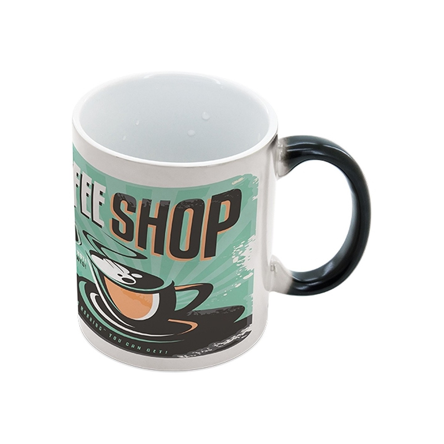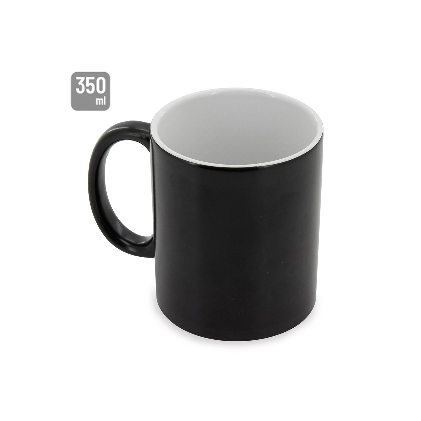 Taza MAGIC de 350 ml, cerámica negra que revela un diseño oculto con líquido caliente. Personalizable con tu logotipo. ¡Ideal para sorprender y promocionar!