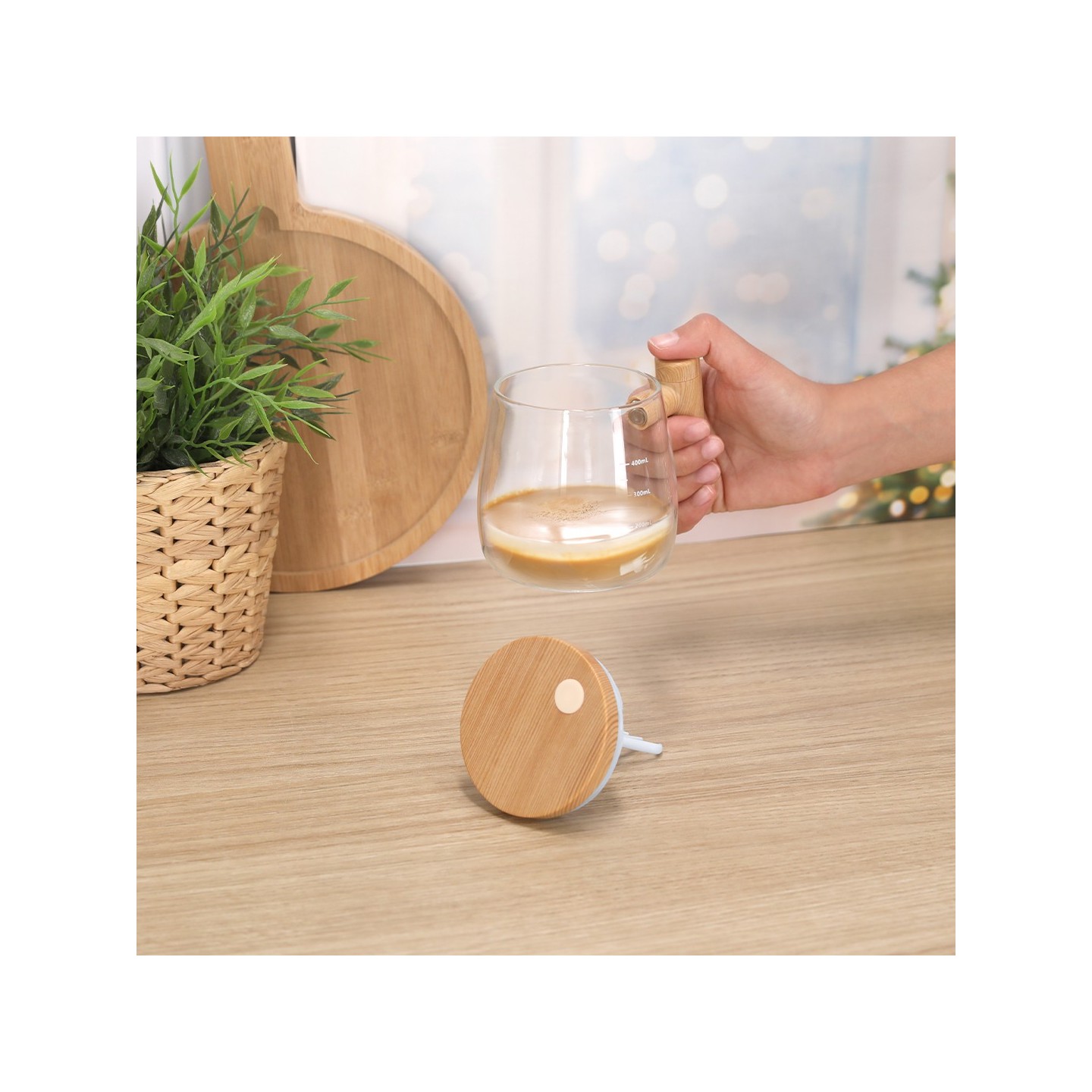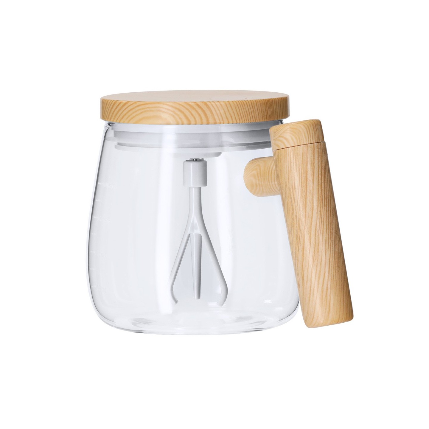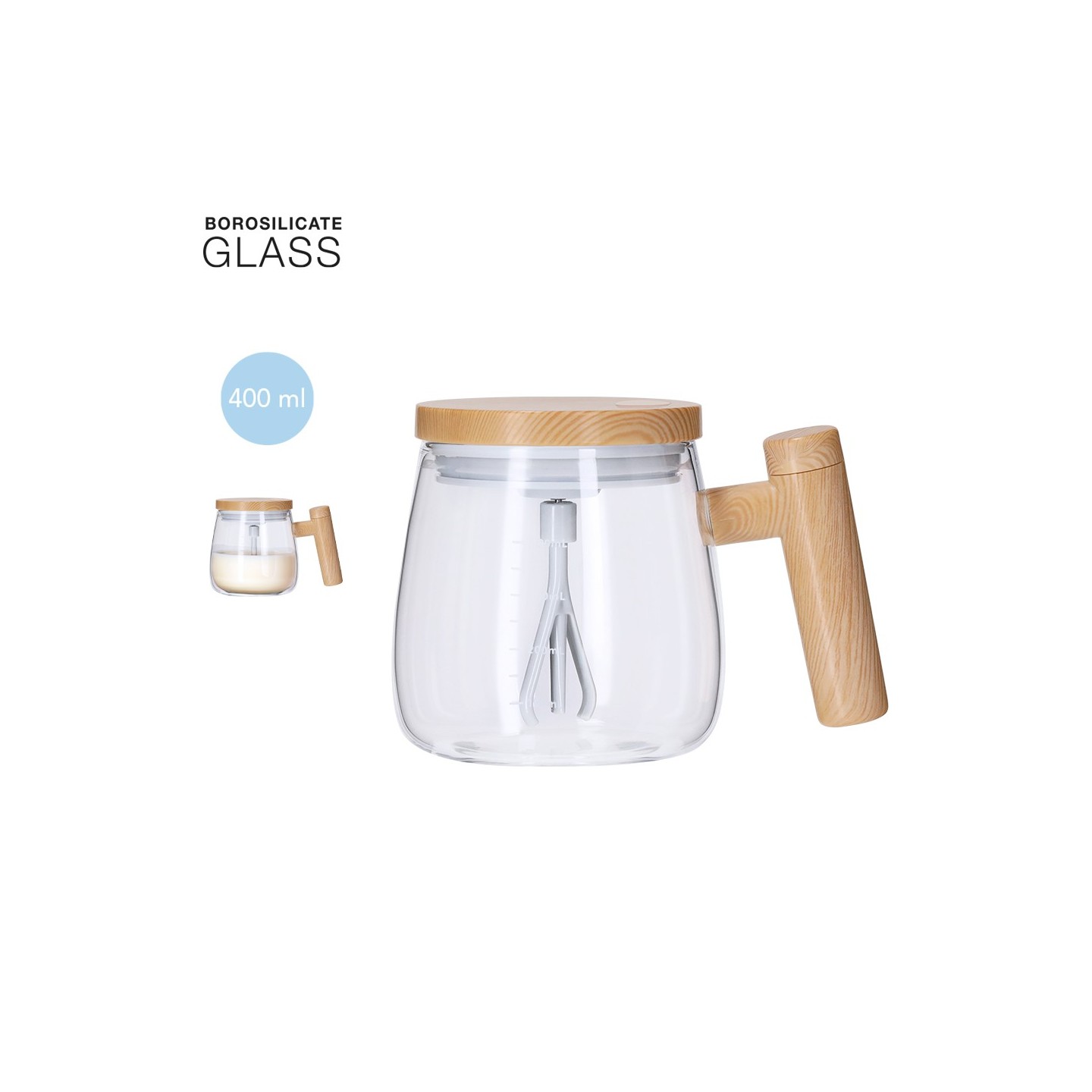 La Taza Mezcladora Rydian de 400 ml, en cristal de borosilicato, incluye un agitador eléctrico y compartimento en el mango. Personalizable, ideal para regalos corporativos.