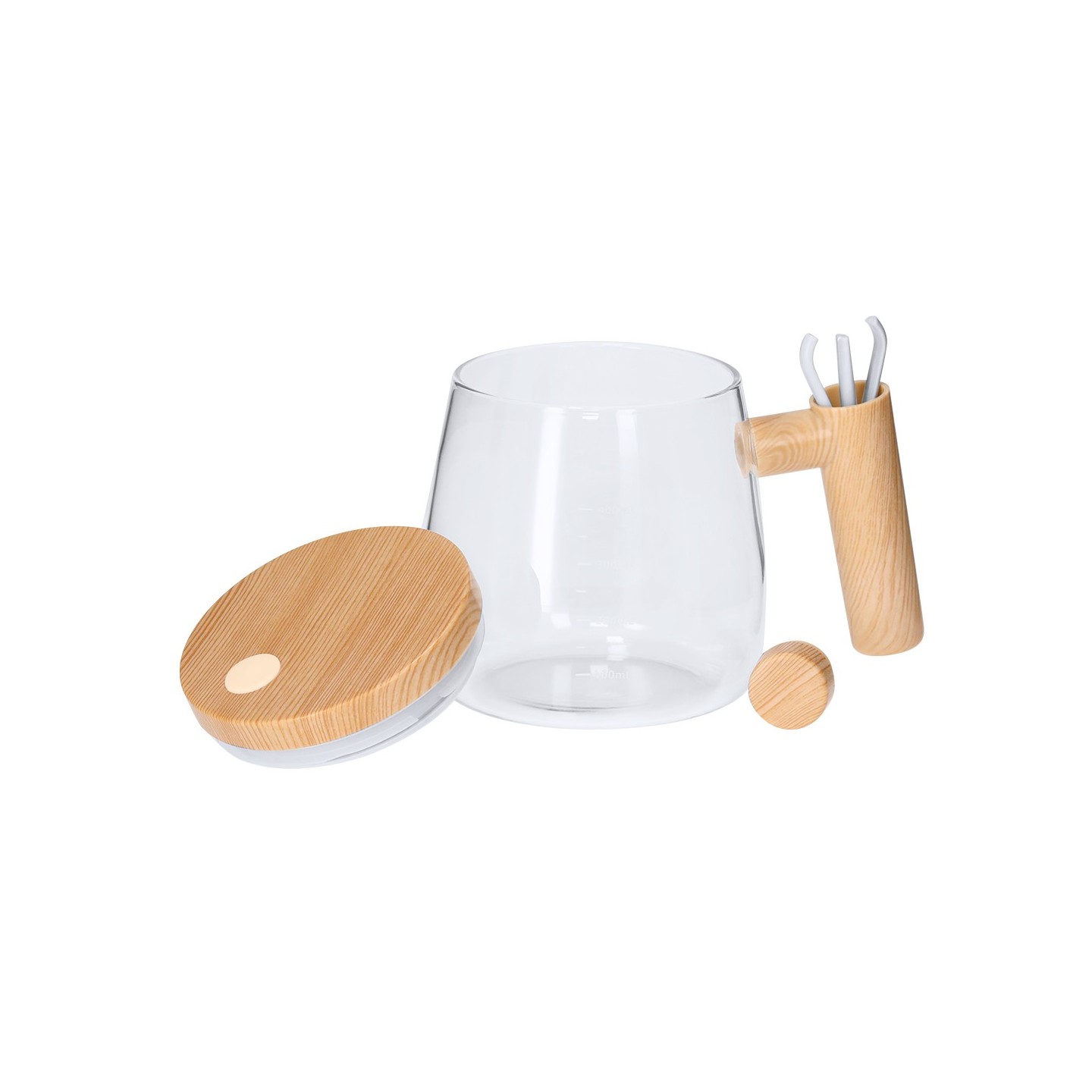 Un detalle innovador es el compartimento en el mango, especialmente diseñado para guardar el agitador, lo que evita la pérdida de piezas y mantiene todo en orden. Este compartimento, fabricado en ABS imitación madera, añade un toque de elegancia al diseño general de la taza, combinando funcionalidad con un aspecto atractivo. Además, la taza cuenta con una escala de medidas impresa en color blanco en el cuerpo, lo que te permite medir los ingredientes de manera precisa y rápida, asegurando que cada bebida sea perfecta.